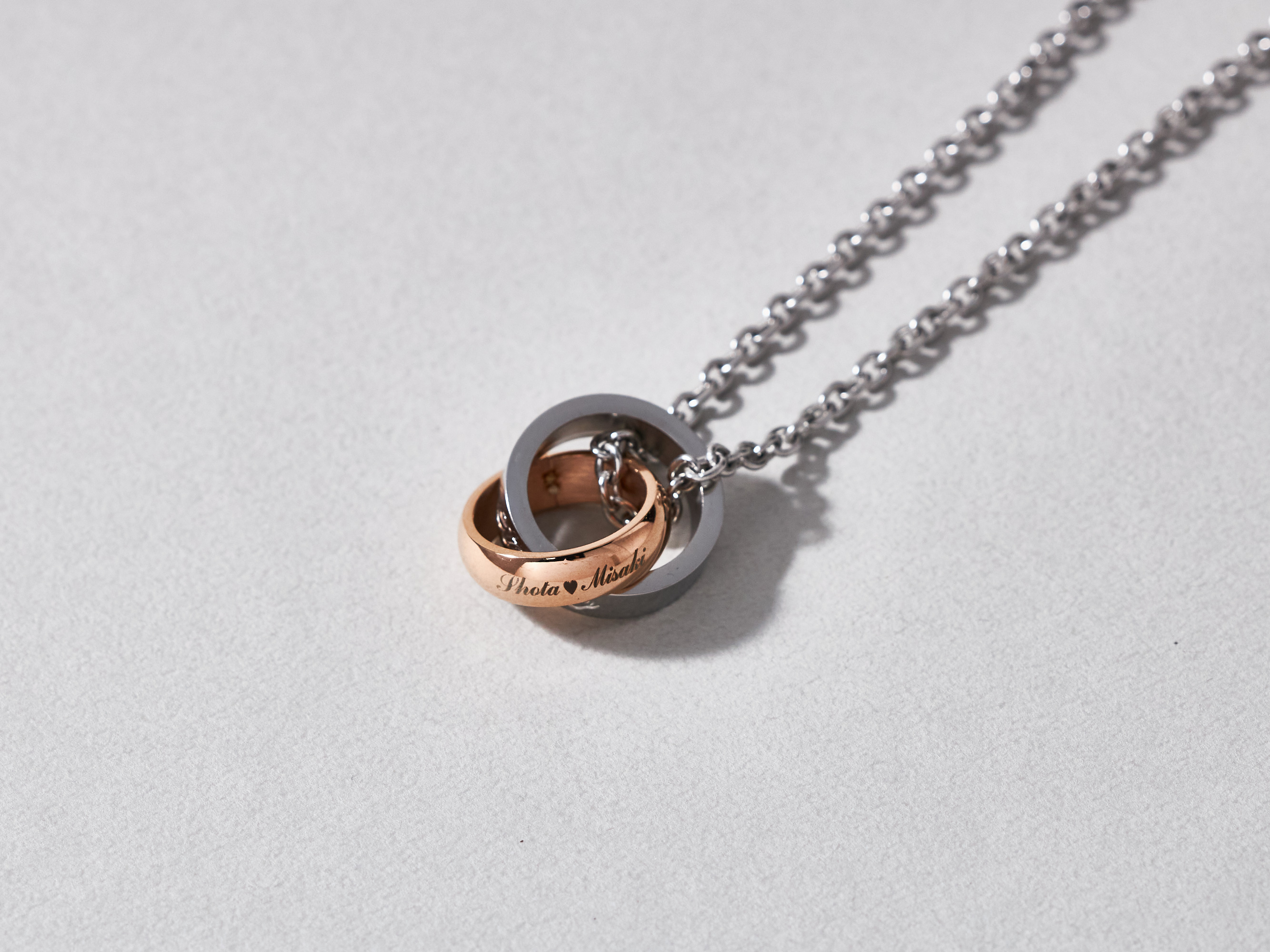 どんな服装にも合う、シンプルなデザインでありながら、埋め込まれたクリスタルが高級感溢れる仕上がりです。シルバーのチェーンとリングをベースに色違いの名入りリングがそれぞれに連なります。 人気のダブルリングは普段使いにもぴったりです。 仕事上指輪を付けられない方でもサッと身に着けることができます。 男性はブラック、女性はピンクゴールドとファッションを選ばないカラーリングです。