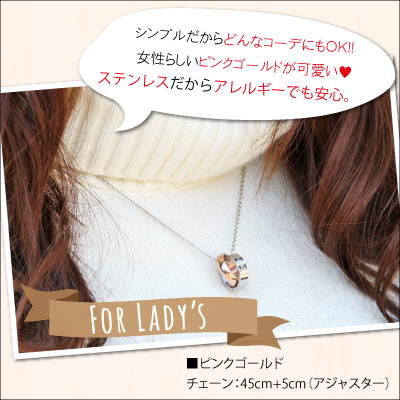 | 本体サイズ | 【トップ】 ピンクゴールド:幅18mm×高さ18mm ブラック:幅19mm×高さ19mm 【チェーン】 ピンクゴールド:450mm+50mm(アジャスター) ブラック:500mm+50mm(アジャスター) |