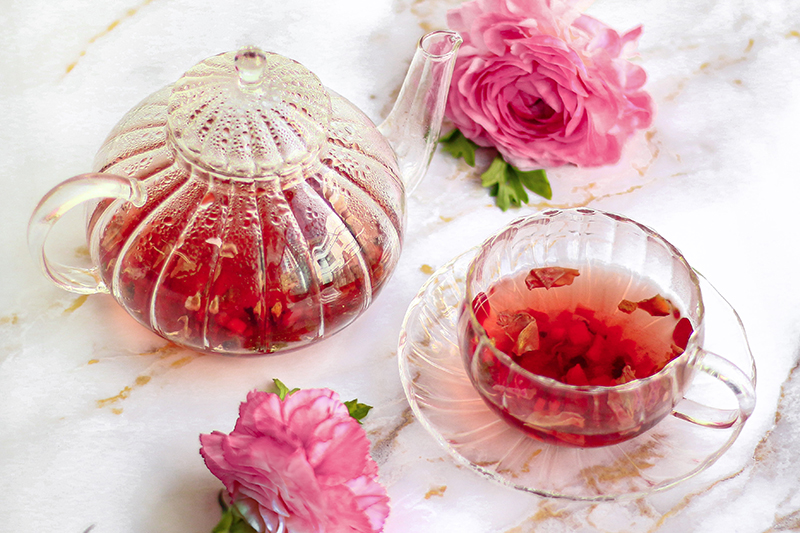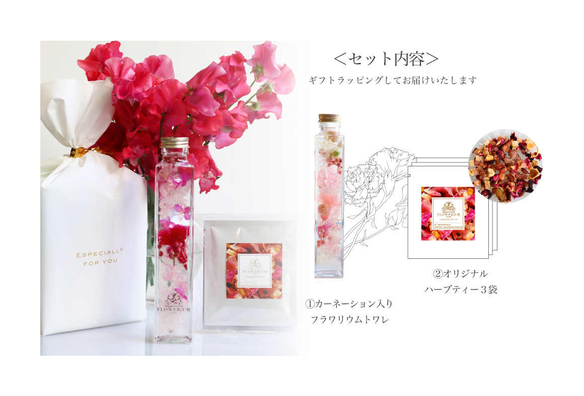 カーネーション トワレとFLOWERiUM®オリジナルブレンドのハーブティーをセットにした女性に喜ばれるギフトセットです。