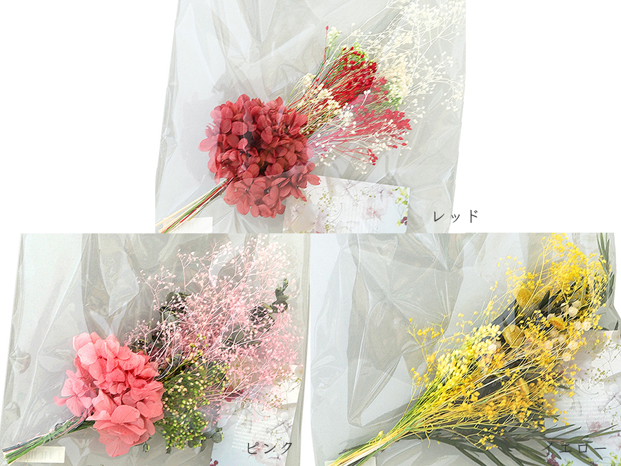 美しさが長く続くドライフラワーとプリザーブドフラワーをブーケに仕上げました。庭先に、自然に咲く花をそのまま摘んできたような素敵なブーケです。取っ手付きの袋に入っているため、そのまま持ち歩いたり、贈ることができます。 袋が透明なのでそのまま飾ったり、袋から取り出して花瓶に入れたり壁に掛けたりとあなたのアイディアでお楽しみください。より手軽なミニサイズ。ギフトとしても大げさにならず、ちょっとしたお礼や他の商品とセットにできるように仕上げました。