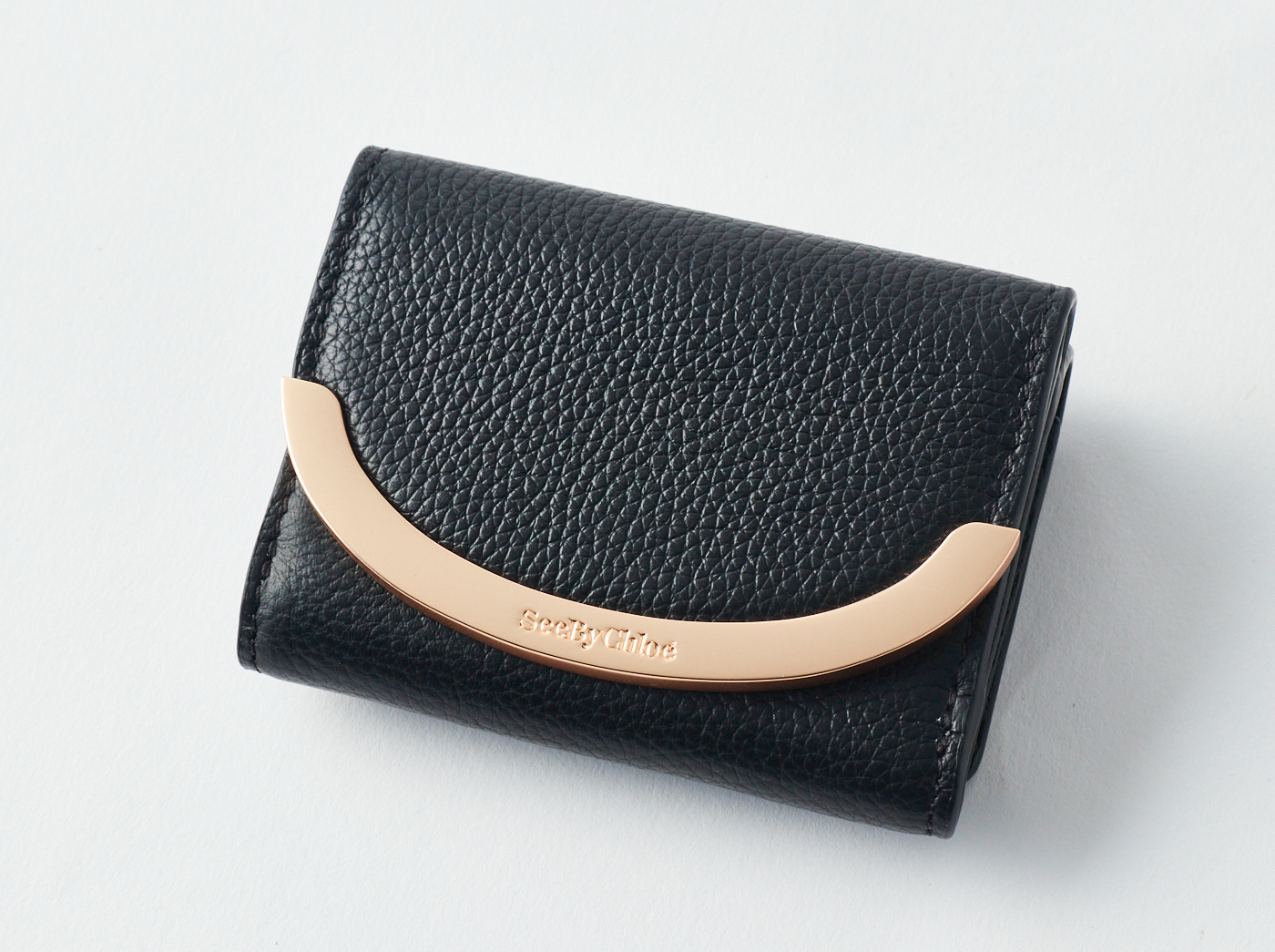 2000年代に創設された「See By Chloé(シーバイクロエ)」の三つ折り財布です。シックなブラックカラーのレザーを贅沢に使用しています。カーブを描いたゴールドカラーのフラップがアクセントになっています。コンパクトサイズながら収納力もあるので、少ない荷物で外出する時にも便利です。