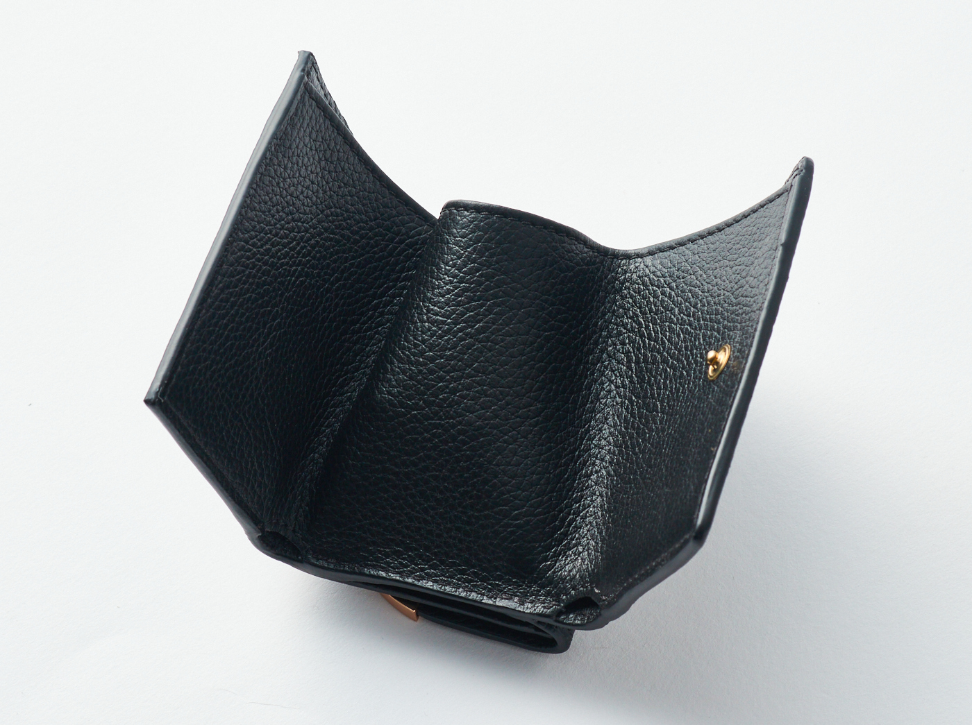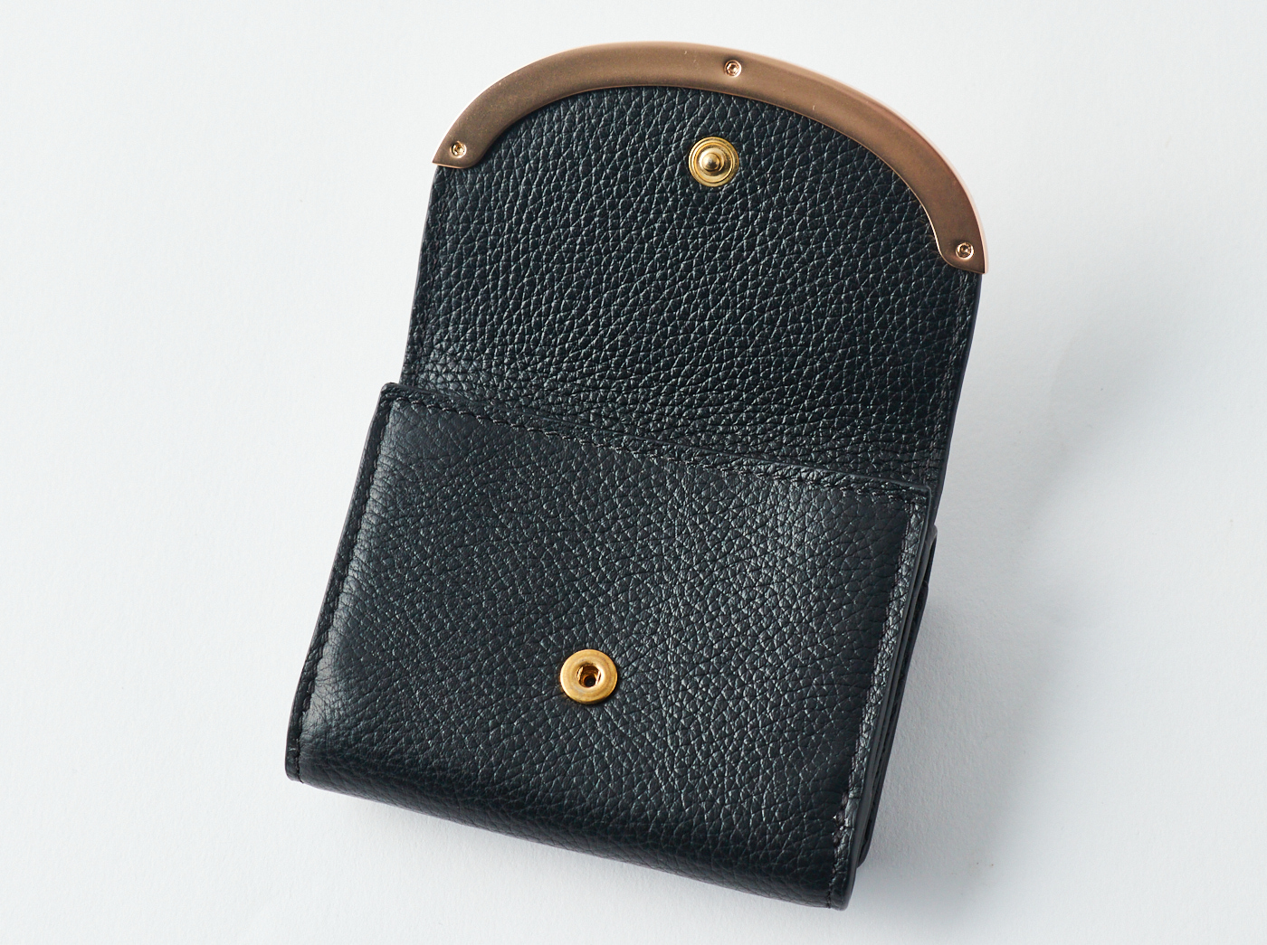 大口注文・法人のお問い合わせはこちらシックなブラックのレザーに、艶めくゴールドが差し色の財布です。カーブを描いたフラップにはブランドのロゴが刻印されています。片手で持てるコンパクトなサイズなので、小さなバッグにもサッと入ります。柔らかなレザーなので大きく広がり、お会計もスムーズにできます。