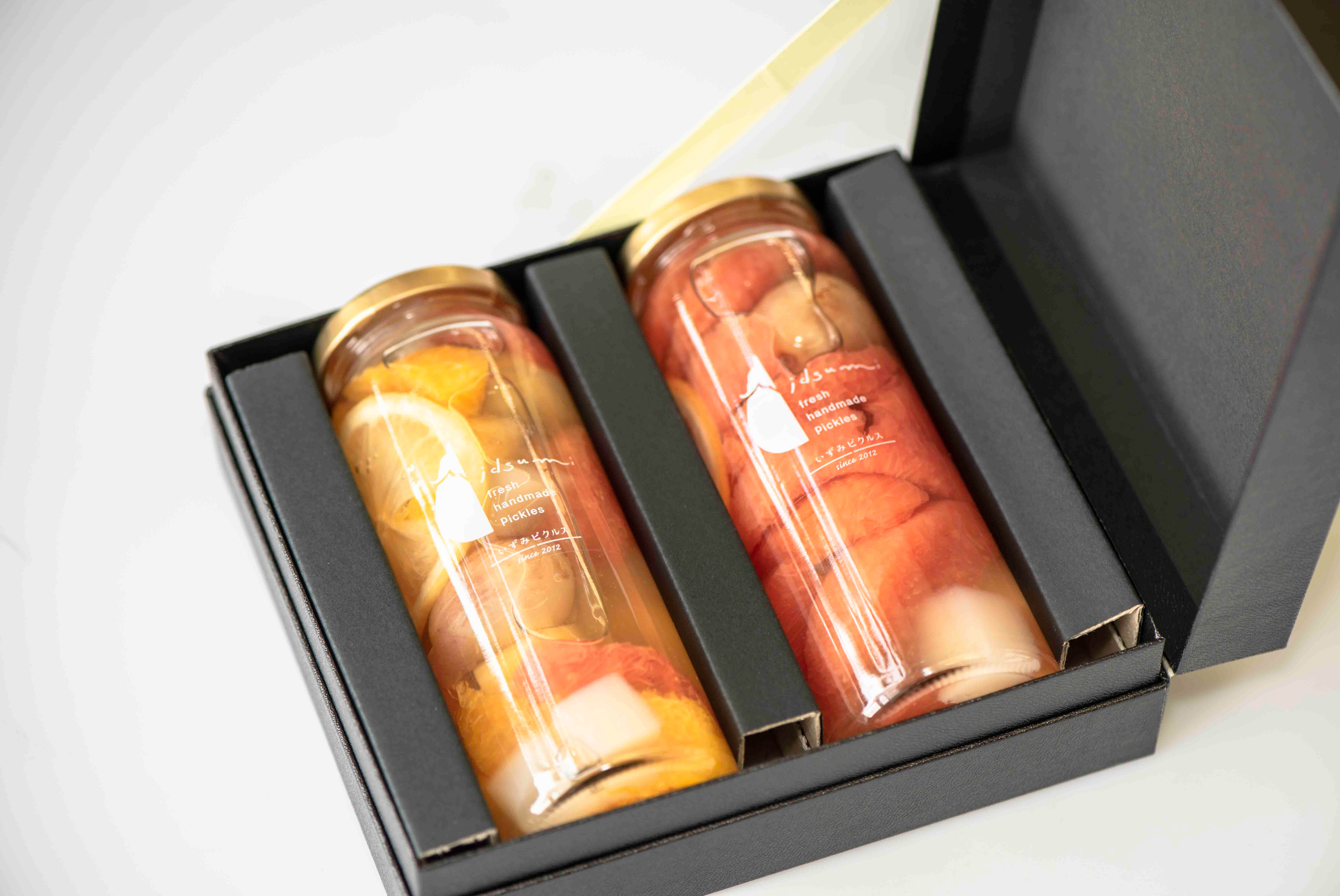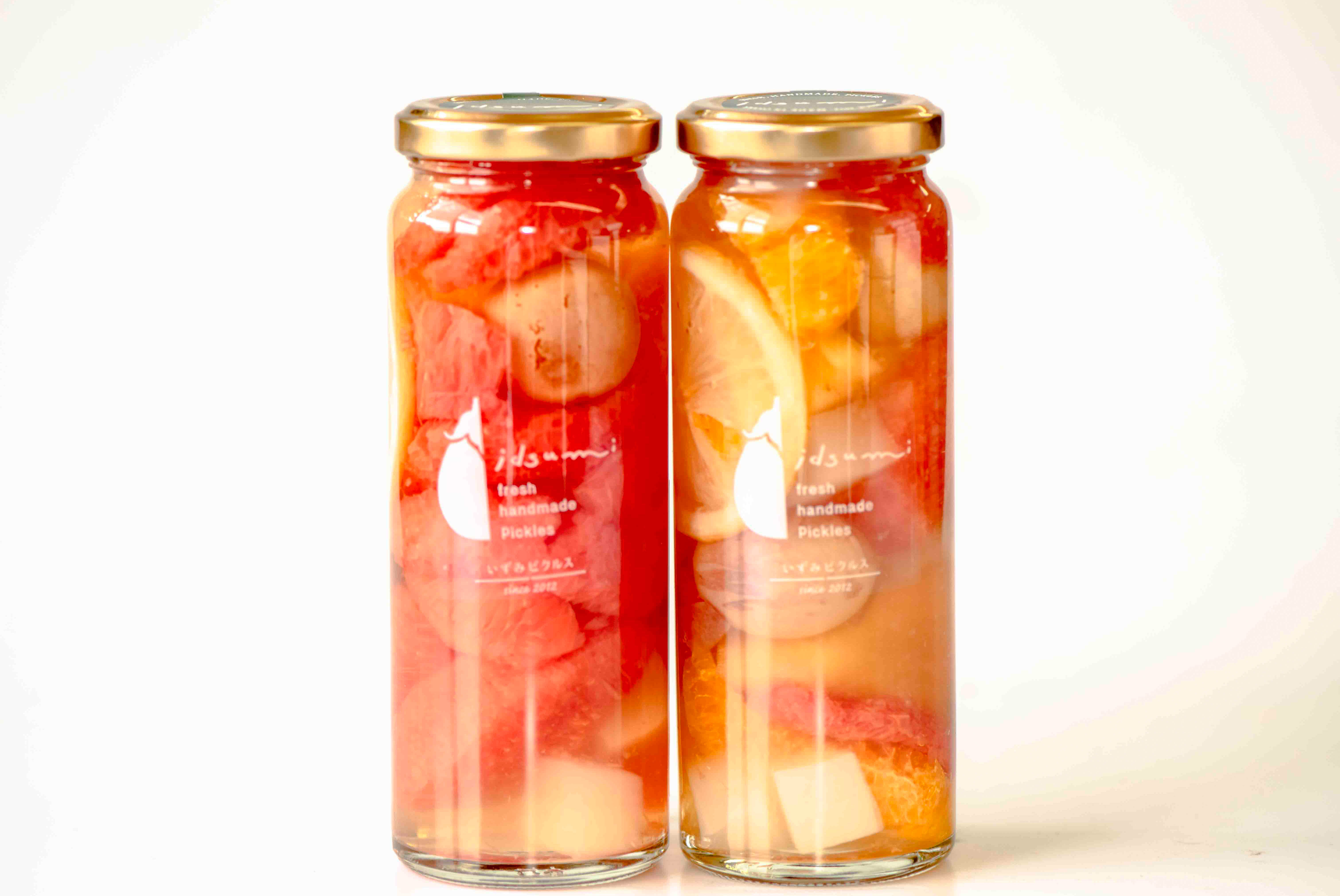 果物の美味しさをぎゅっと詰めた、フレッシュで美味しい「グレープフルーツとぶどうのピクルス」と爽やかにお酢と調和した「シトラス3種とパイナップルのピクルス」のいずみピクルスのセットです。オリジナルのギフトボックスにお入れしてお届けいたします。