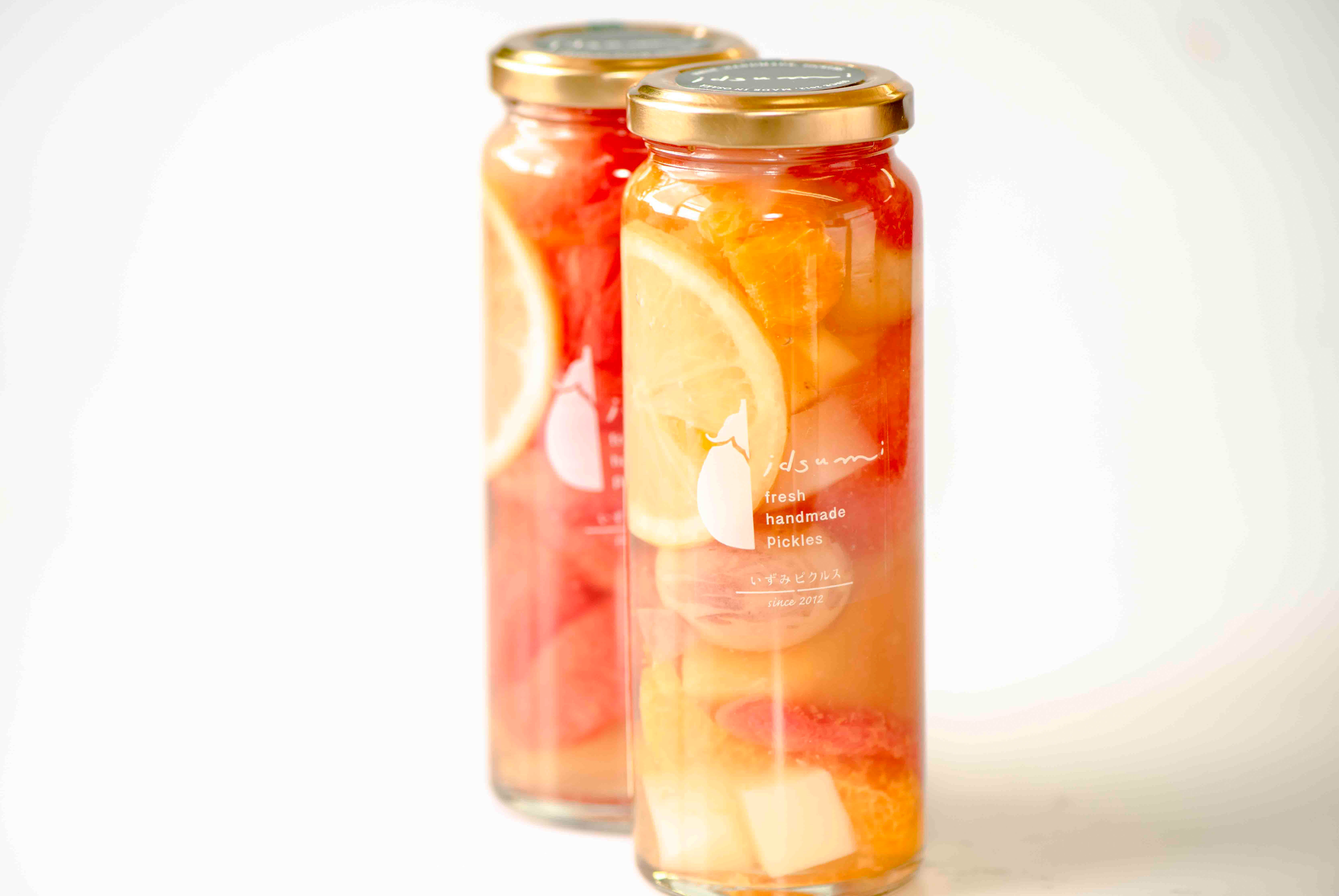 オレンジ、グレープフルーツ、レモンの3種のシトラスとパイナップルがぎゅっと詰められています。爽やかなお酢と調和したフルーツピクルスで、フルーツをよりフレッシュに美味しく食べられます。