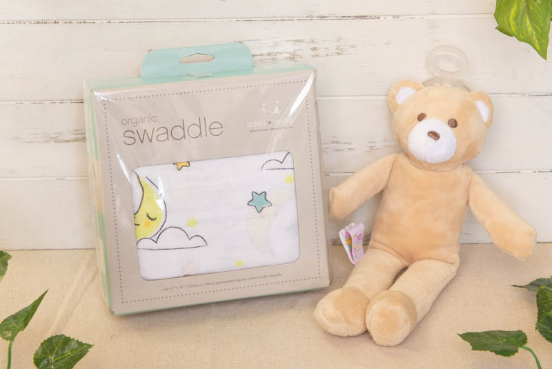 おしゃぶりがついたふわふわのぬいぐるみ「Paci friends」。ふんわりとした肌触りのおくるみ「aden+anais」オーガニックスワドル。赤ちゃんの成長を見守る大人気のギフトがセットになって登場です!大切な方への出産祝いとして最適です。