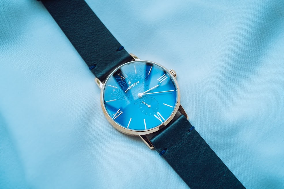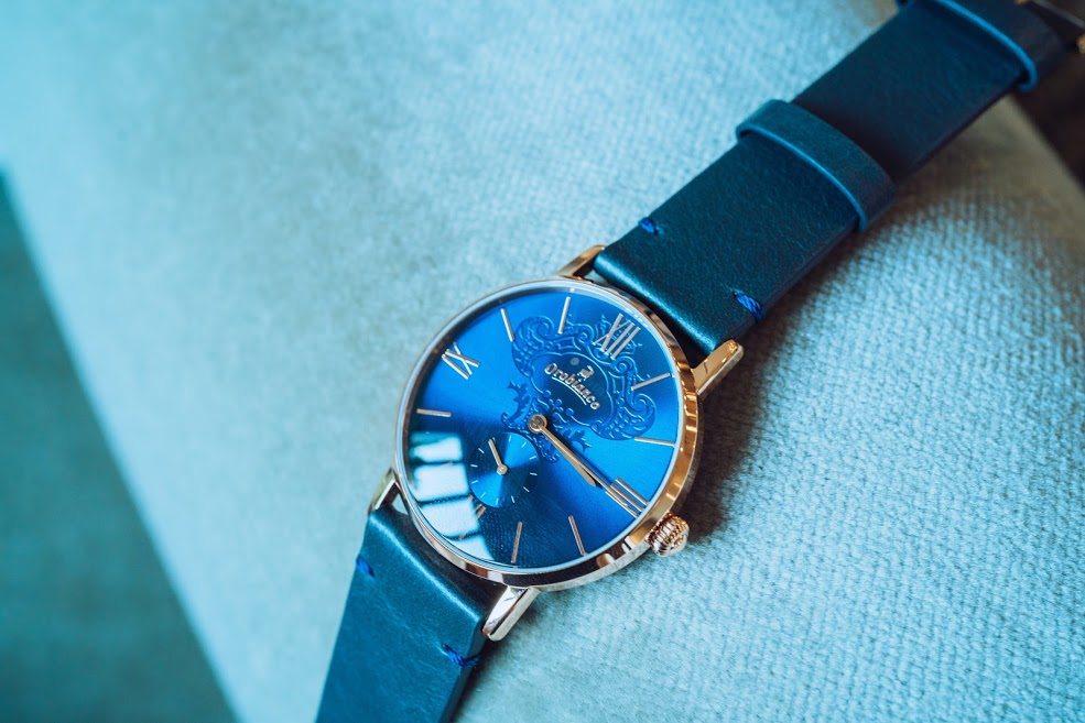 ネイビーのしっとりとした光沢のある文字盤にゴールドのバーインデックスが印象的。 バーインデックスとは1~12時の時間を示す印のこと。12・3・6・9時にはローマ数字をしようしていますが、すっきりとしたデザイン。 また、【Orobianco】のレトロなロゴが入っていてワンポイントとなっています。 ベルトもレザーが使用されており雰囲気抜群。ベルトのステッチがワンポイントの遊び心があります。