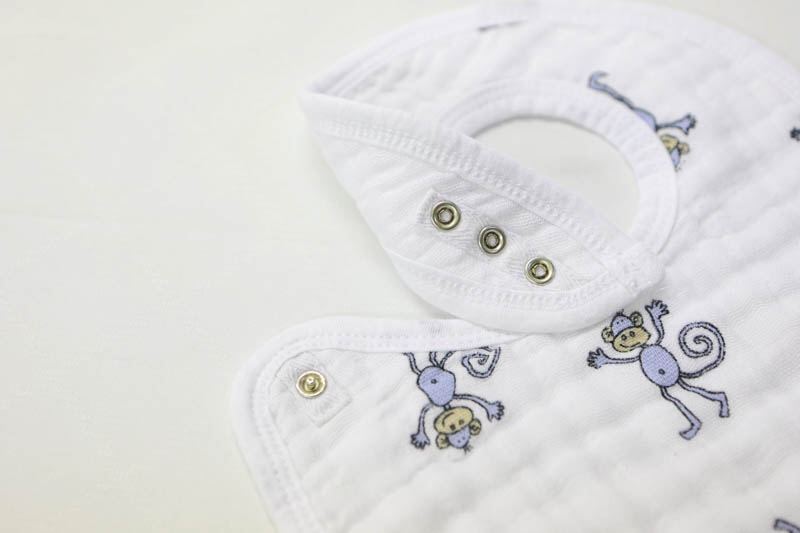 スナップビブの特徴は、赤ちゃんの成長に合わせてサイズの調整をすることが可能です。 また、スナップビプの生地は厚手で吸収しやすいので、よだれの多い赤ちゃんでも安心して使うことができます。横幅は24センチと広めなので、しっかりお洋服を守ってくれるのもポイントです。