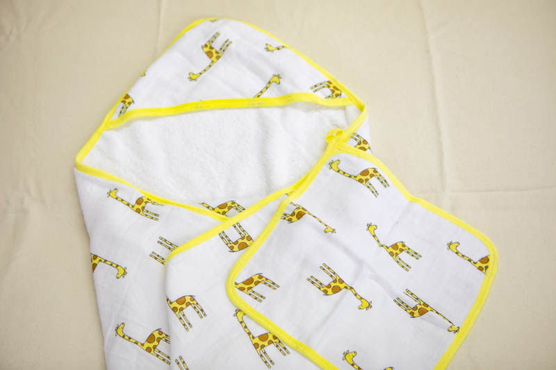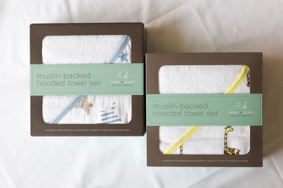aden+anais(エイデンアンドアネイ)のフードつきの大判タオルと、肌触りのいいウォッシュクロスです。