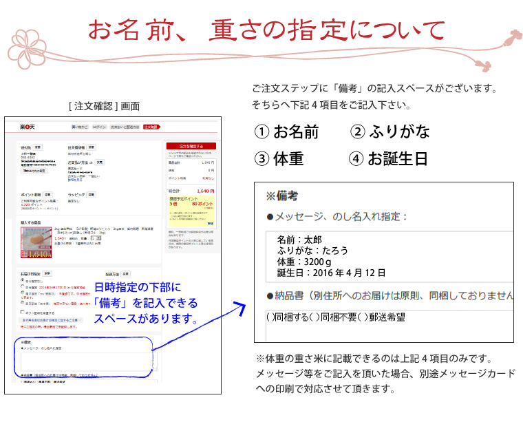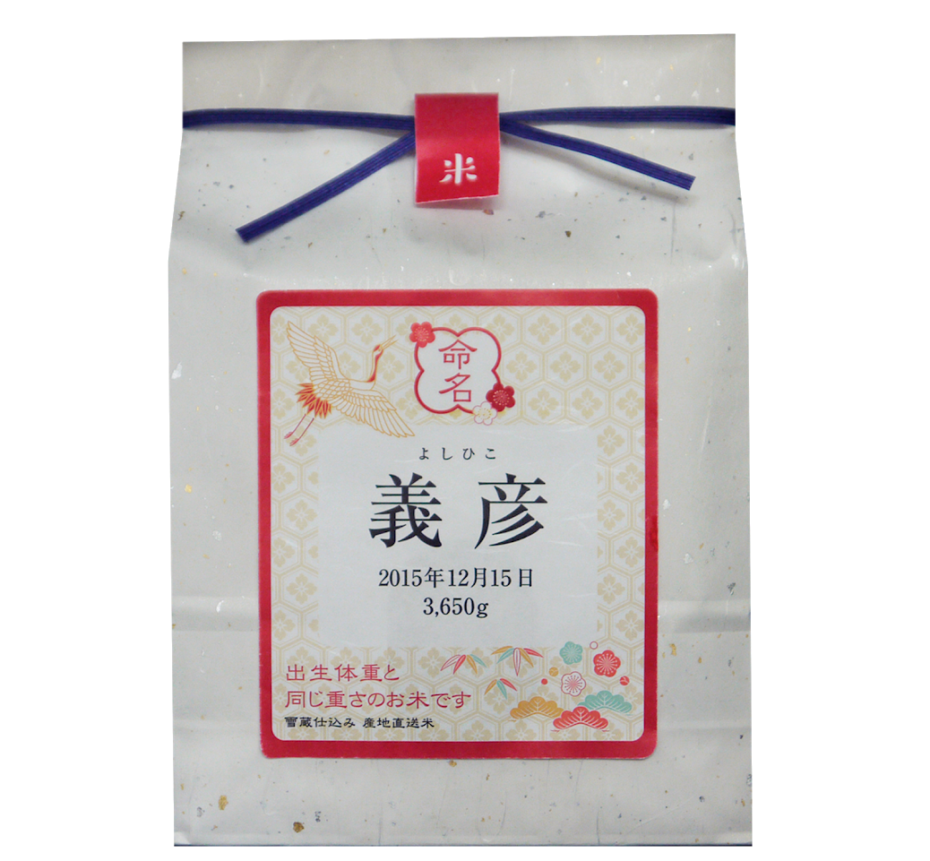 元気な子が産まれました!の気持ちを込めて。すぐにお披露目できない遠方の方などに、産まれた重さと同じ重さのお米をお届けし、産まれた時の重みを実感して頂ける体重米ギフト。使用するお米は新潟平野の阿賀北地区で「米作りは土作り」の思いで米杜氏栽培会が丹精した新潟県産こしひかり。新しい生命誕生の喜びと感動をお届けします。