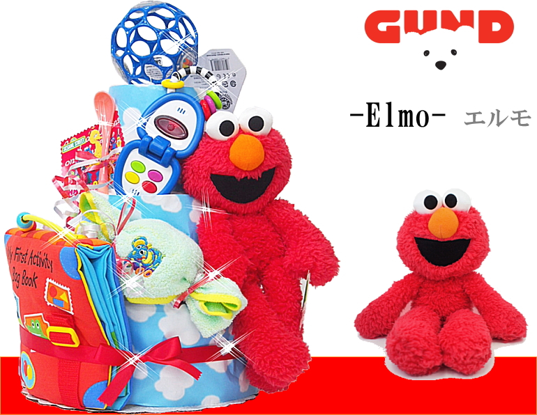 赤いエルモのぬいぐるみと、星とお日さまのラトルが付いている、 青色の水玉模様が特徴的な三段おむつケーキです。 男女問わずあげられるキャラクターなので、出産祝いで喜ばれること間違いなしです。