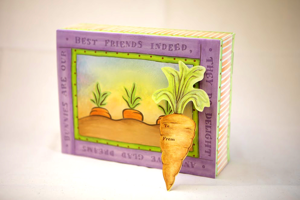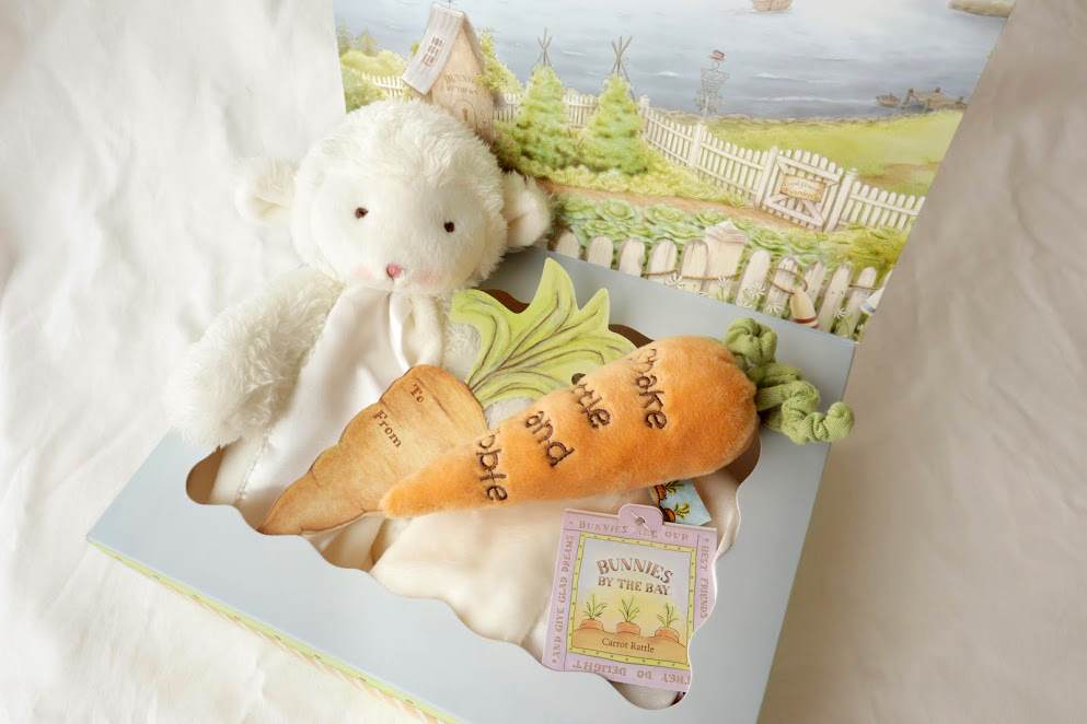 【Bunnies By The Bay】オリジナルのギフトボックスは、まるで絵本のようなにんじん畑が描かれたとても可愛いデザインになっています。 ギフトボックスにはにんじんの形をしたメッセージカードも付いているので、お祝いのメッセージを添えてプレゼントする事が出来ます。