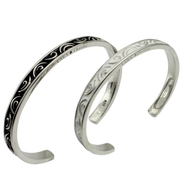 いつまでも、変わることなく愛される「アラベスク-蔦模様-」モチーフ。 ブラック×シルバー・ホワイト×シルバーとの、見事なコラボで実現した、斬新なペアバングルは、存在感抜群! 更なるこだわりは、バングルの側面に刻印された、LARA Christieのロゴと、1粒のキュービック。さり気ない側面のロゴとアラベスク模様が、スタイリッシュで都会的な腕元を演出します。 また、ブラックカラーは男性の力強さを、ホワイトカラーは女性の持つ母性・優しさを表現。2人の為の、究極のペアバングル!