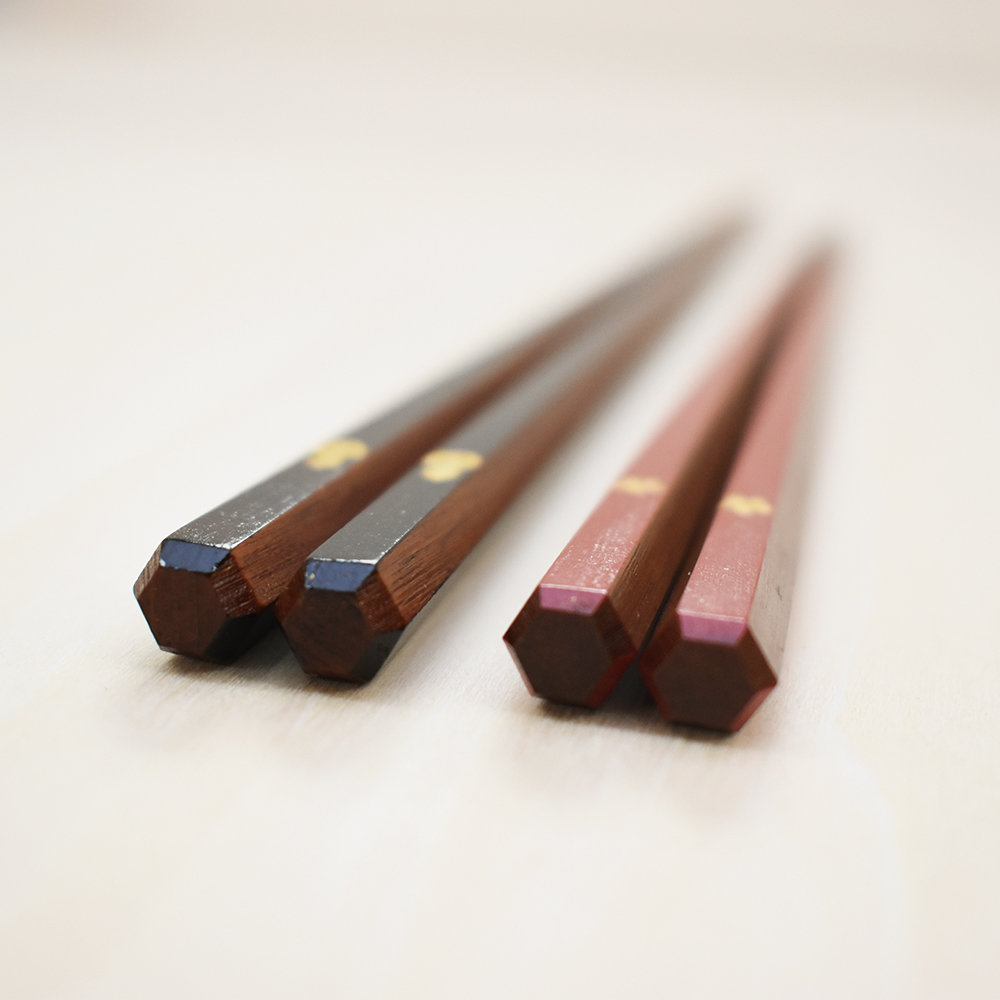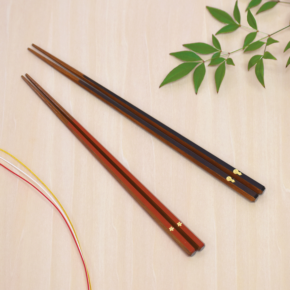 箸頭の角を落とした面取り仕上げで、手間の掛かった形状です。下地からすべて天然の漆を使用し、一面ずつ交互に色の違う塗装を施しています。また六角の形状は亀甲を表し、長命・長寿の象徴とされ、瓢箪と桜、それぞれ縁起柄をワンポイント彫刻し、控えめながらアクセントのあるデザインになっています。