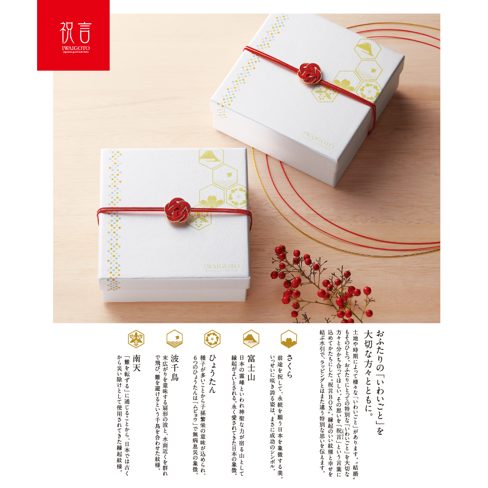 赤と金色のおめでたい縁起の良いカラーの水引がアクセントになっています。ボックスのデザインになっている模様(さくら、富士山、ひょうたん、波千鳥、南天)には、それぞれ異なった想いが込められています。