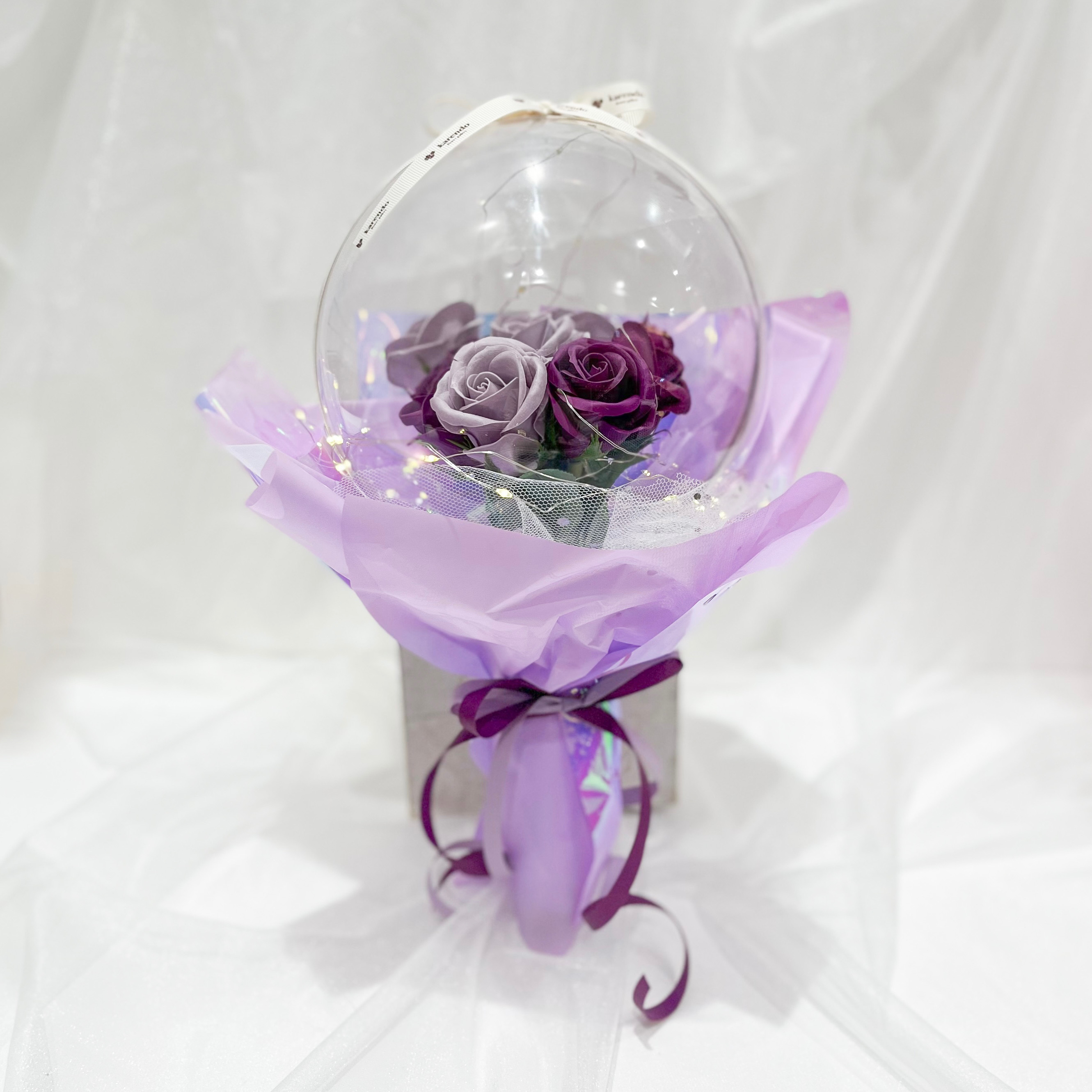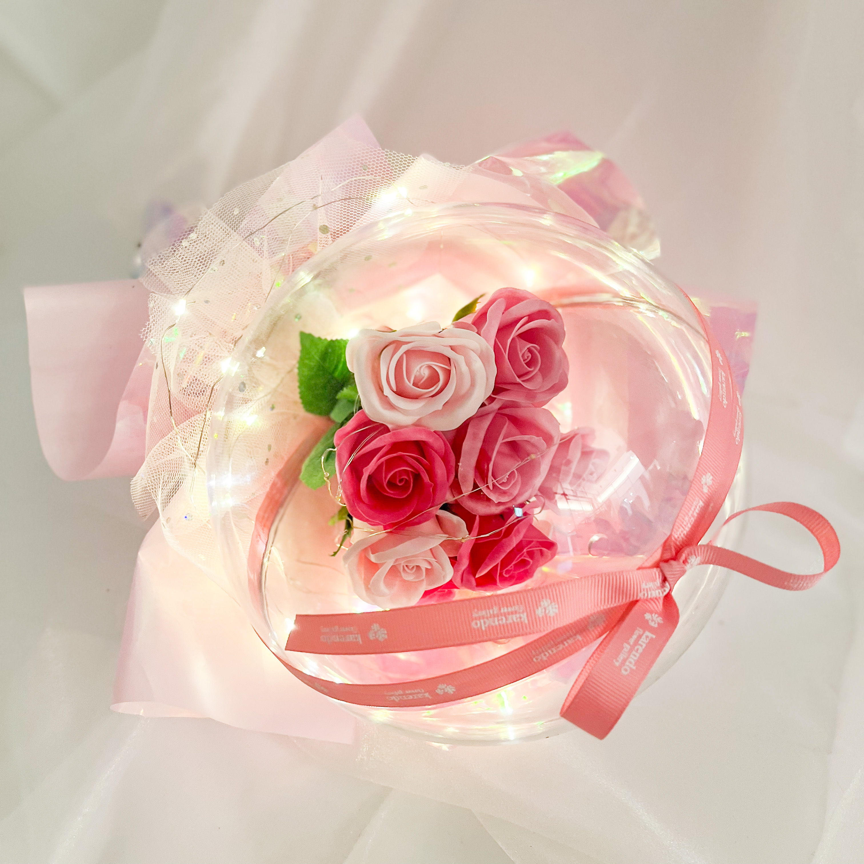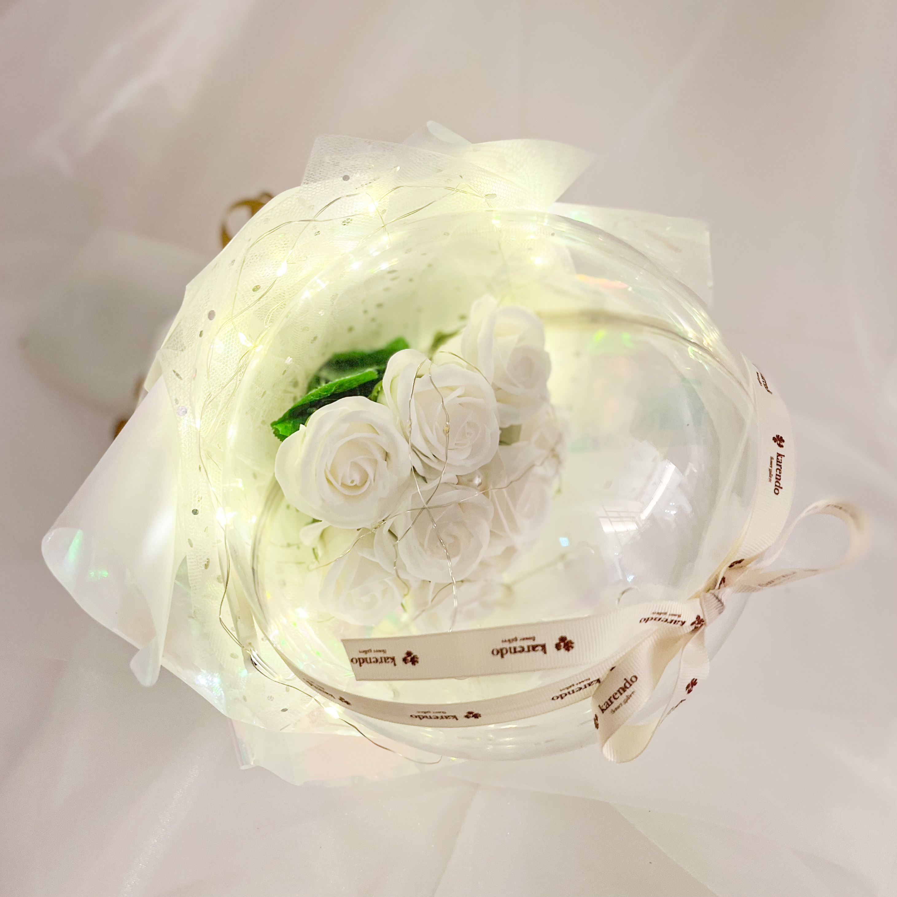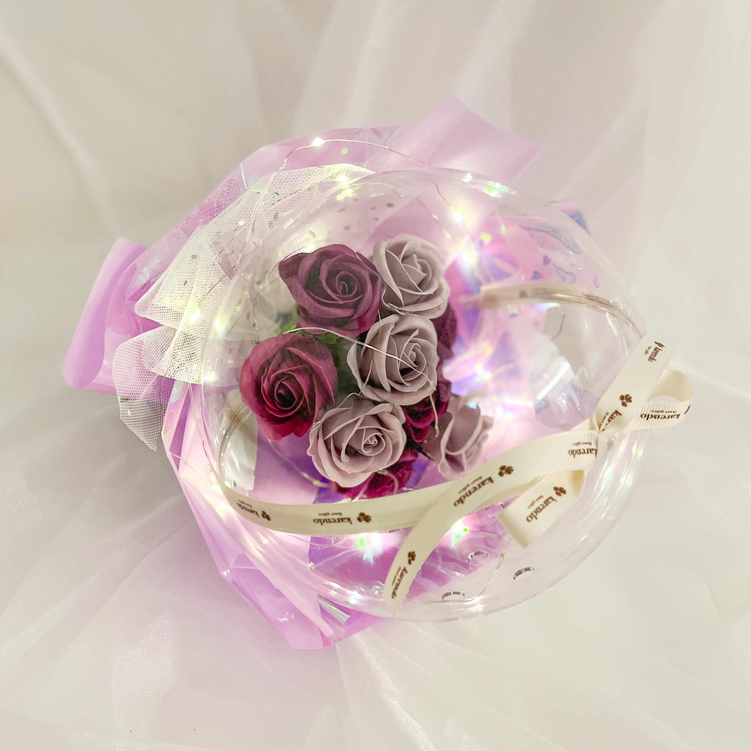 キラキラと輝いて、優しい香りのする素敵なブーケです。美しいバラのソープフラワーがぎゅっと詰まったフラワードームからは石鹸の優しい香りが。ドームに巻いたLEDライトの光がキラキラと反射して、昼はきらびやかに、夜は幻想的なフラワーブーケとして素敵な空間を演出します。