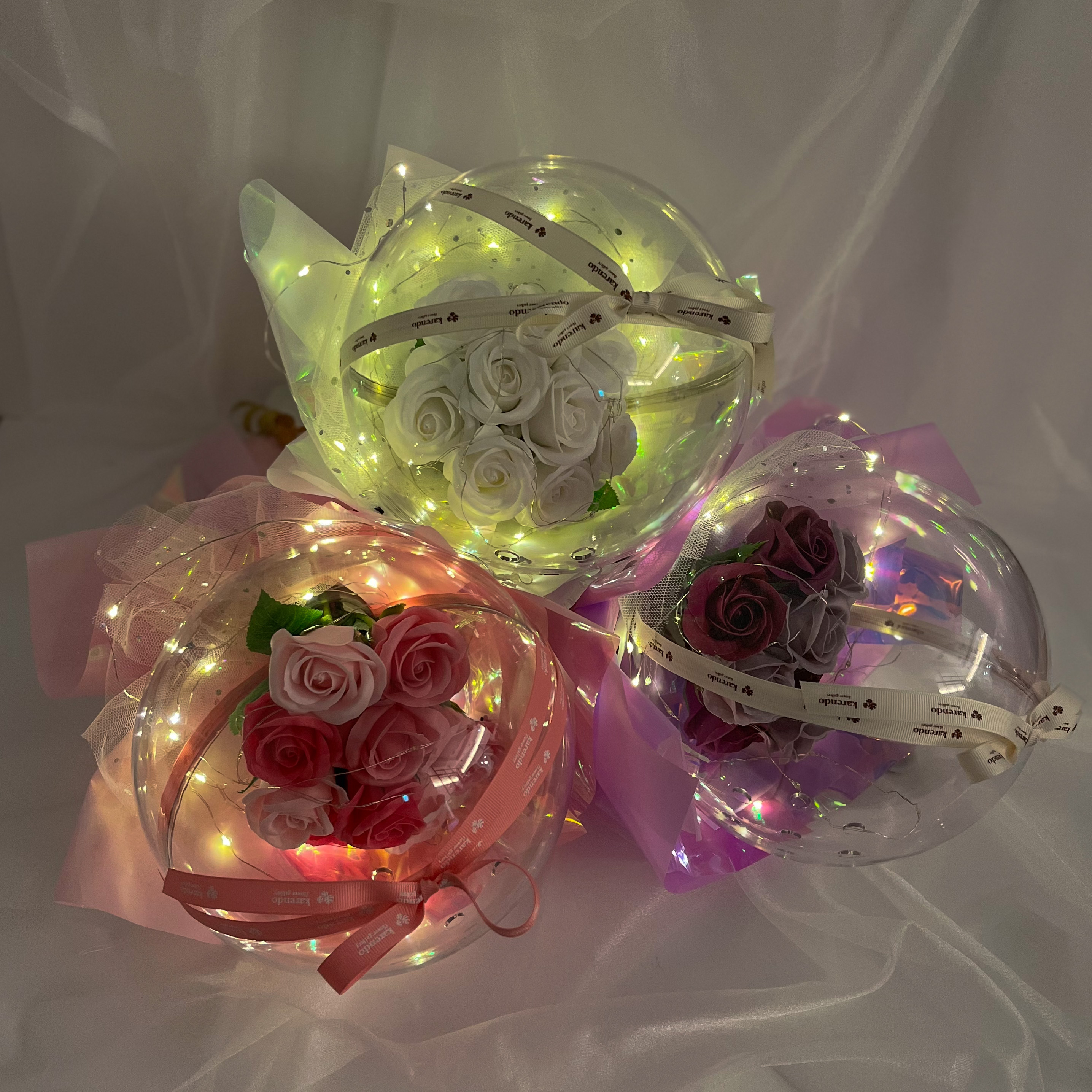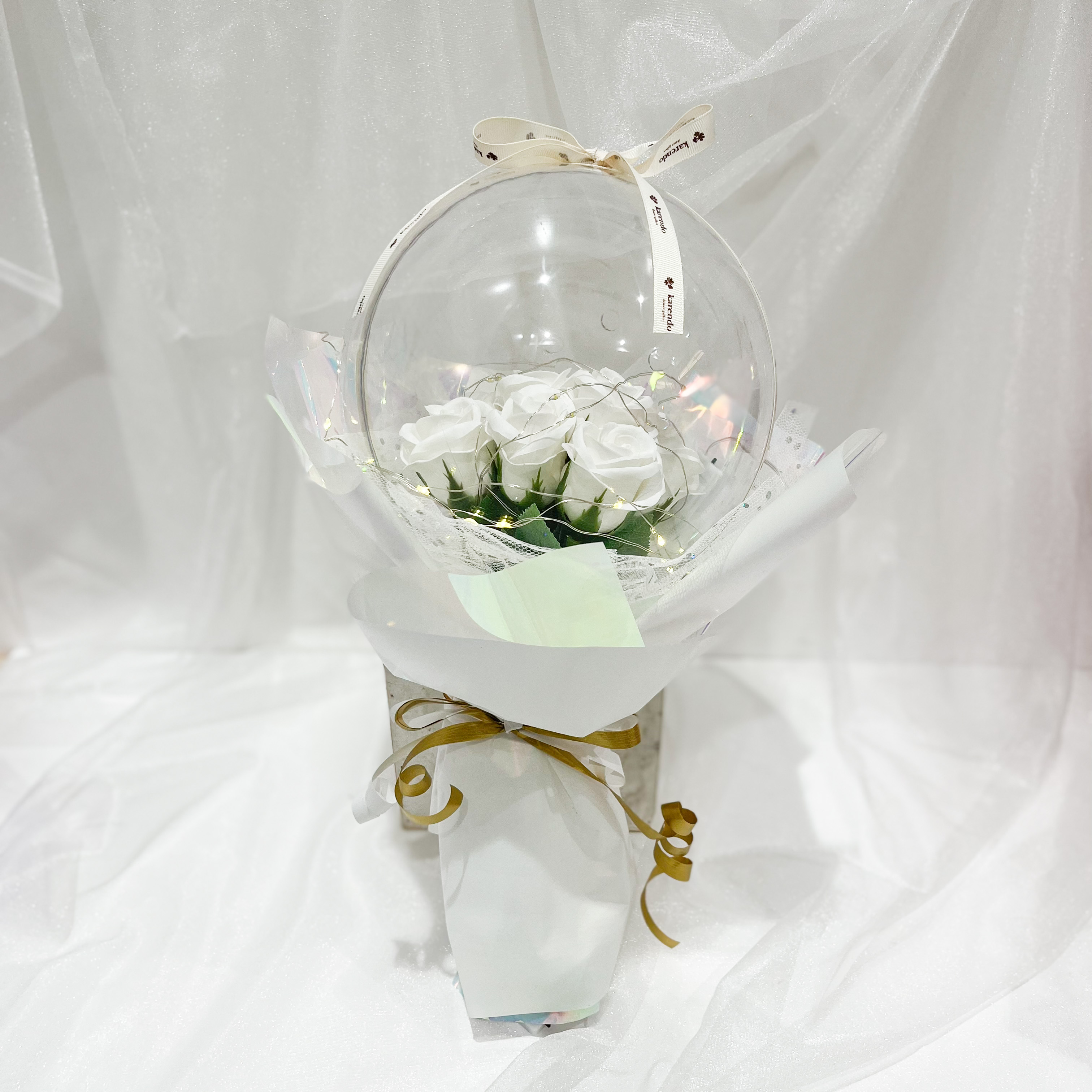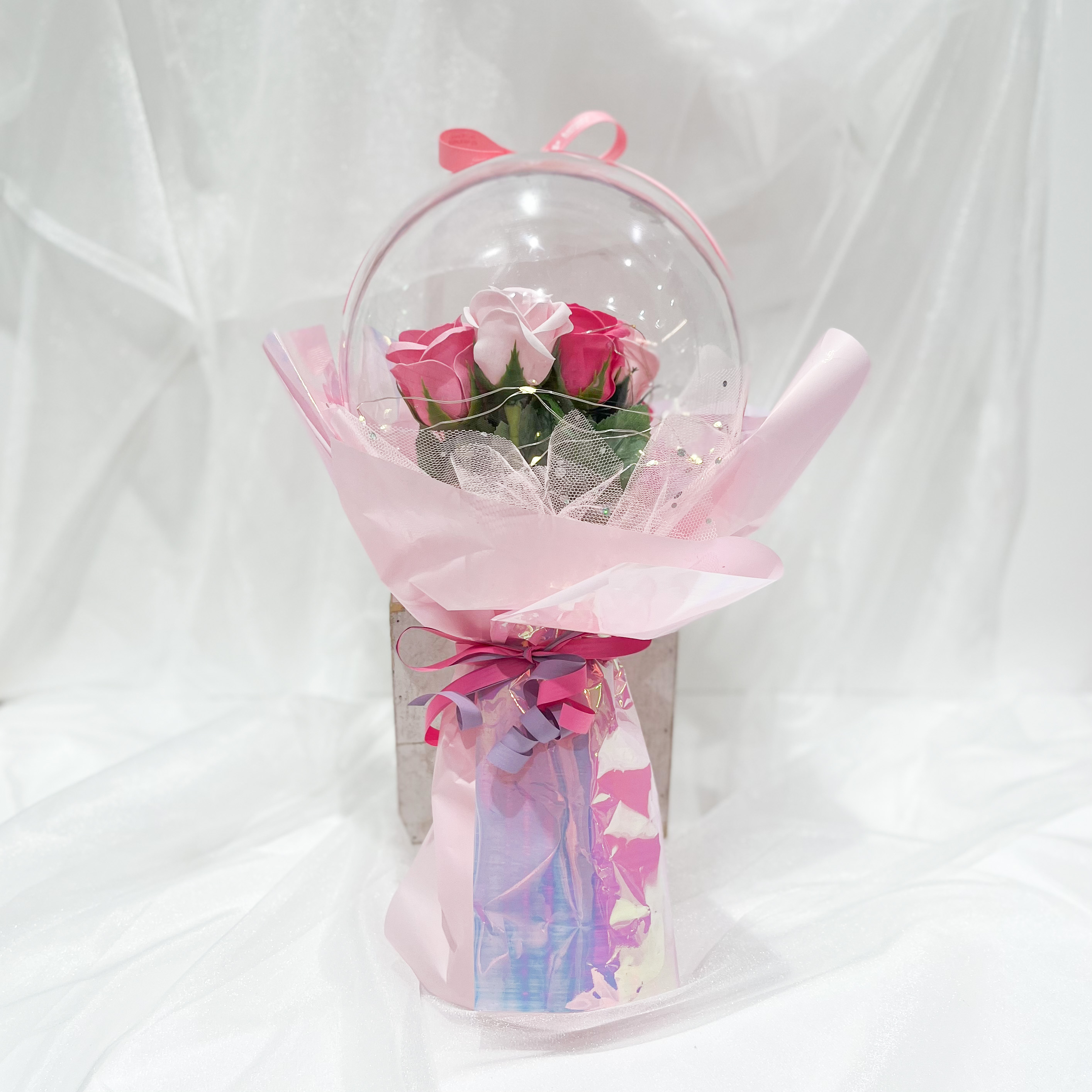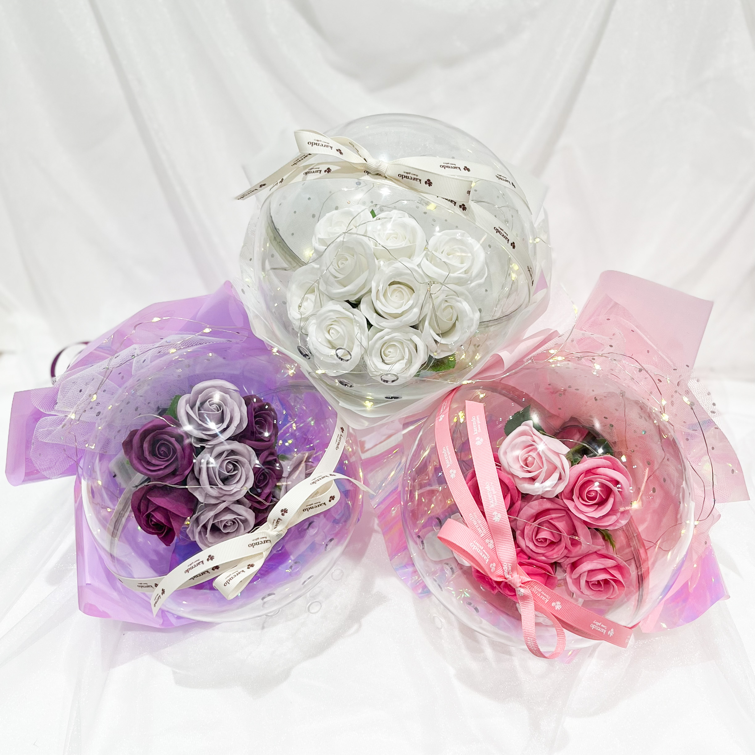 キラキラと輝いて、優しい香りのする素敵なブーケです。美しいバラのソープフラワーがぎゅっと詰まったフラワードームからは石鹸の優しい香りが。ドームに巻いたLEDライトの光がキラキラと反射して、昼はきらびやかに、夜は幻想的なフラワーブーケとして素敵な空間を演出します。
