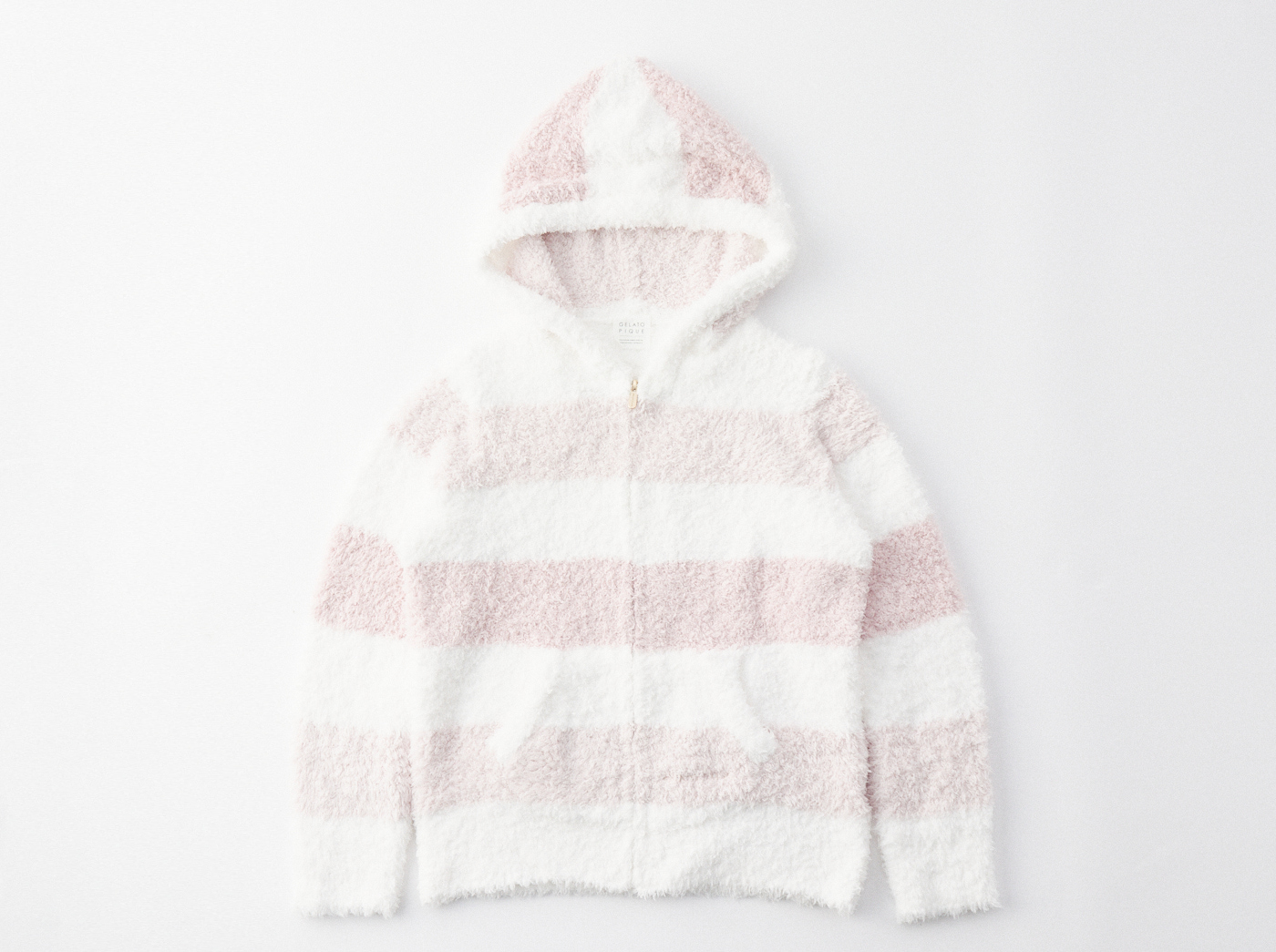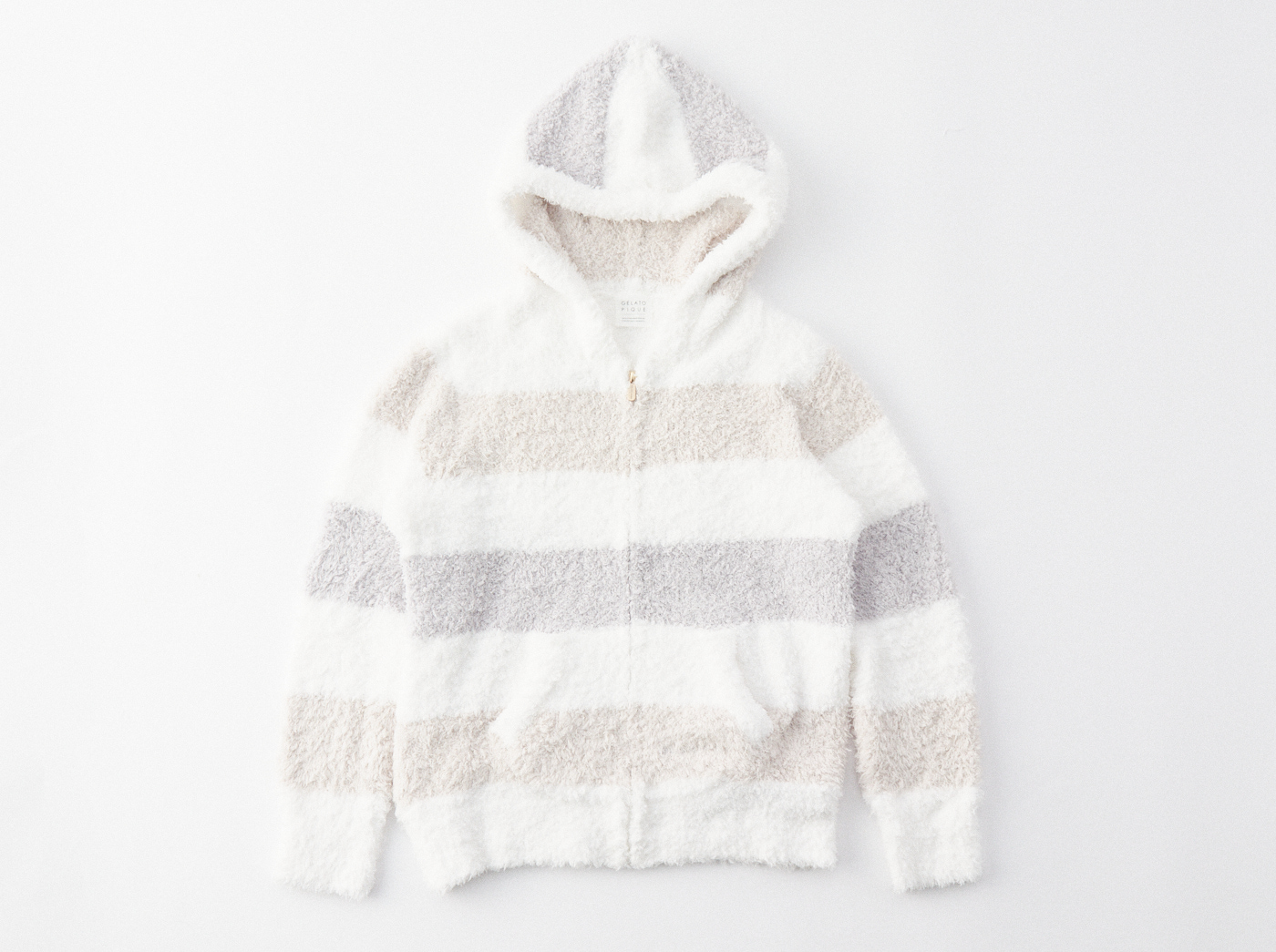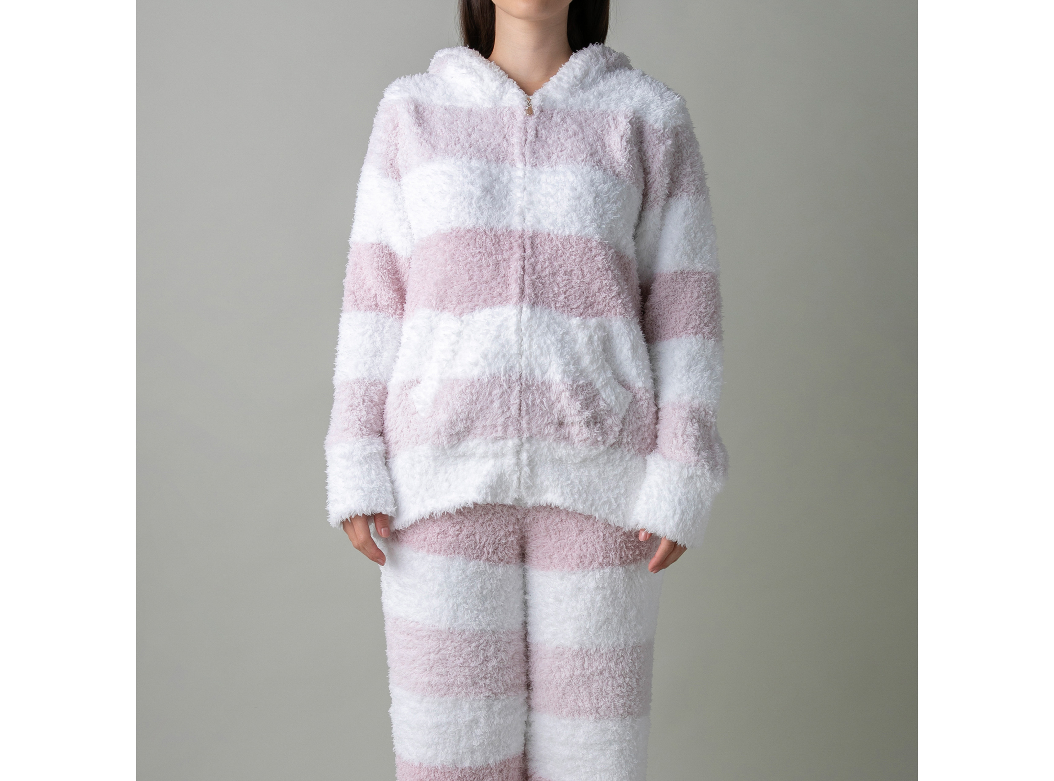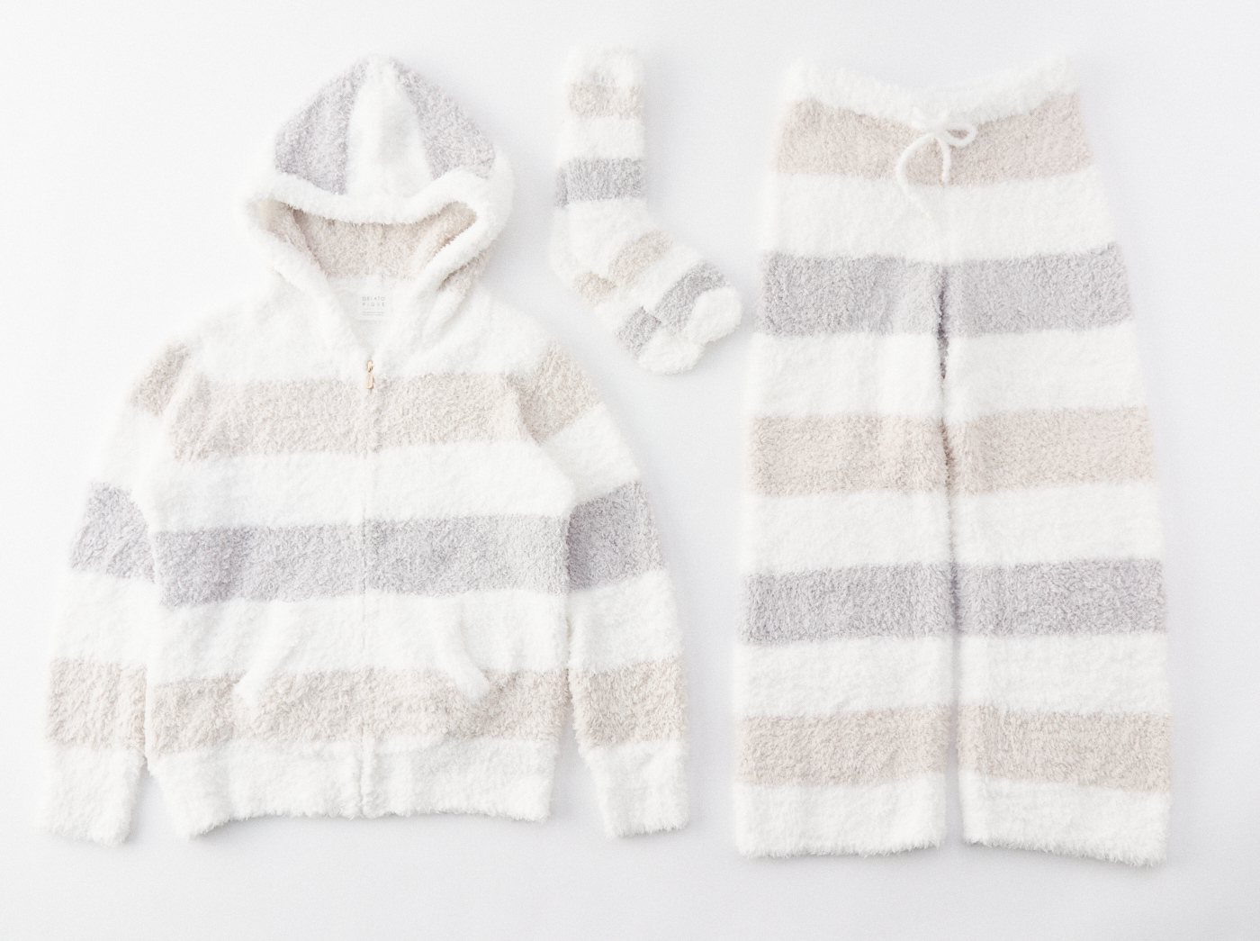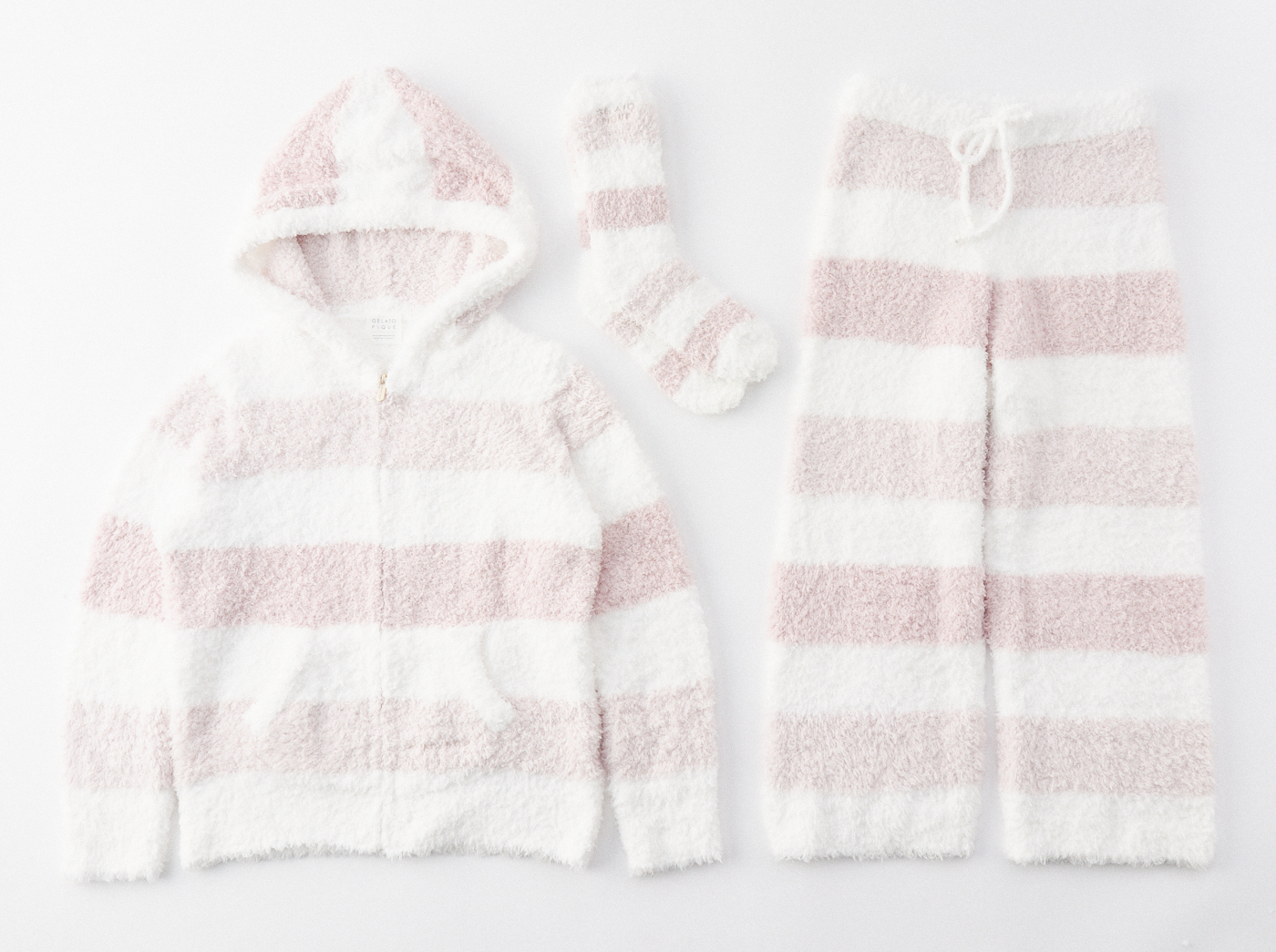 大口注文・法人のお問い合わせはこちらブランドの顔ともいえる、ふんわりと上質なもこもこ感が人気のジェラート生地を使用した、パーカーとロングパンツの上下セットです。やさしいピンク系とベージュ系のボーダー柄2色をご用意。