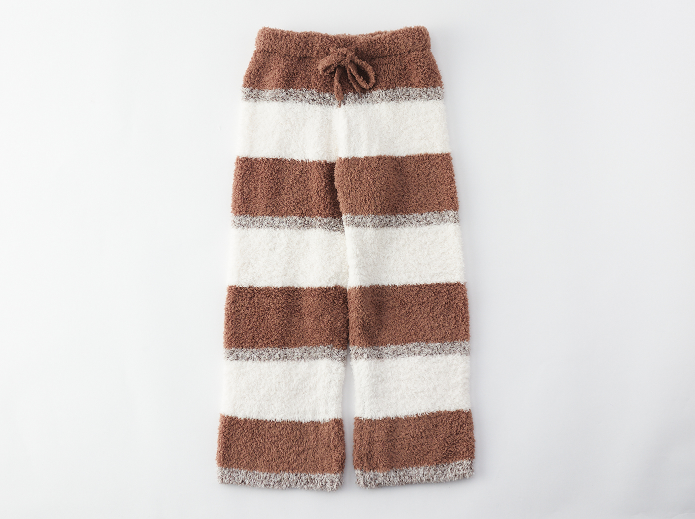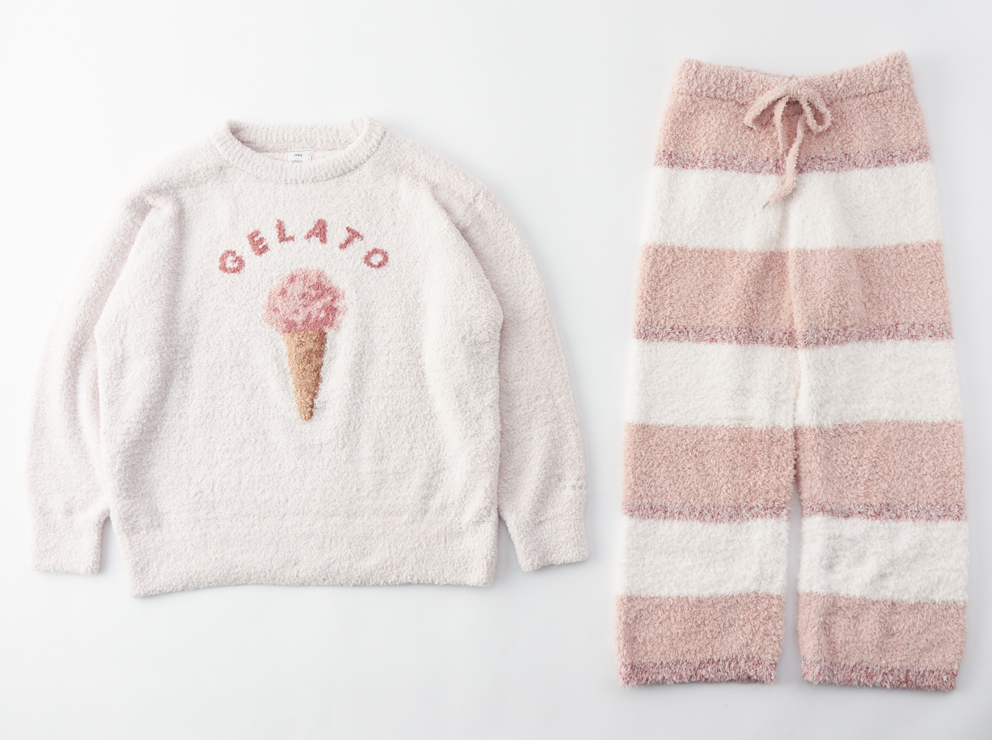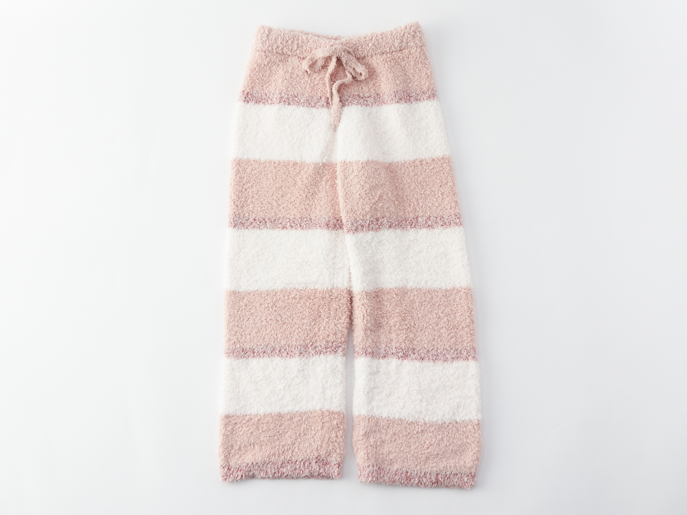 リッチなもこもこ感で人気のジェラート素材で作ったロングパンツ。ゆるっとしたシルエットは気ままなおうち時間にぴったりです。色はジェラートアイスやコーンをイメージした美味しそうなランダムボーダーです。