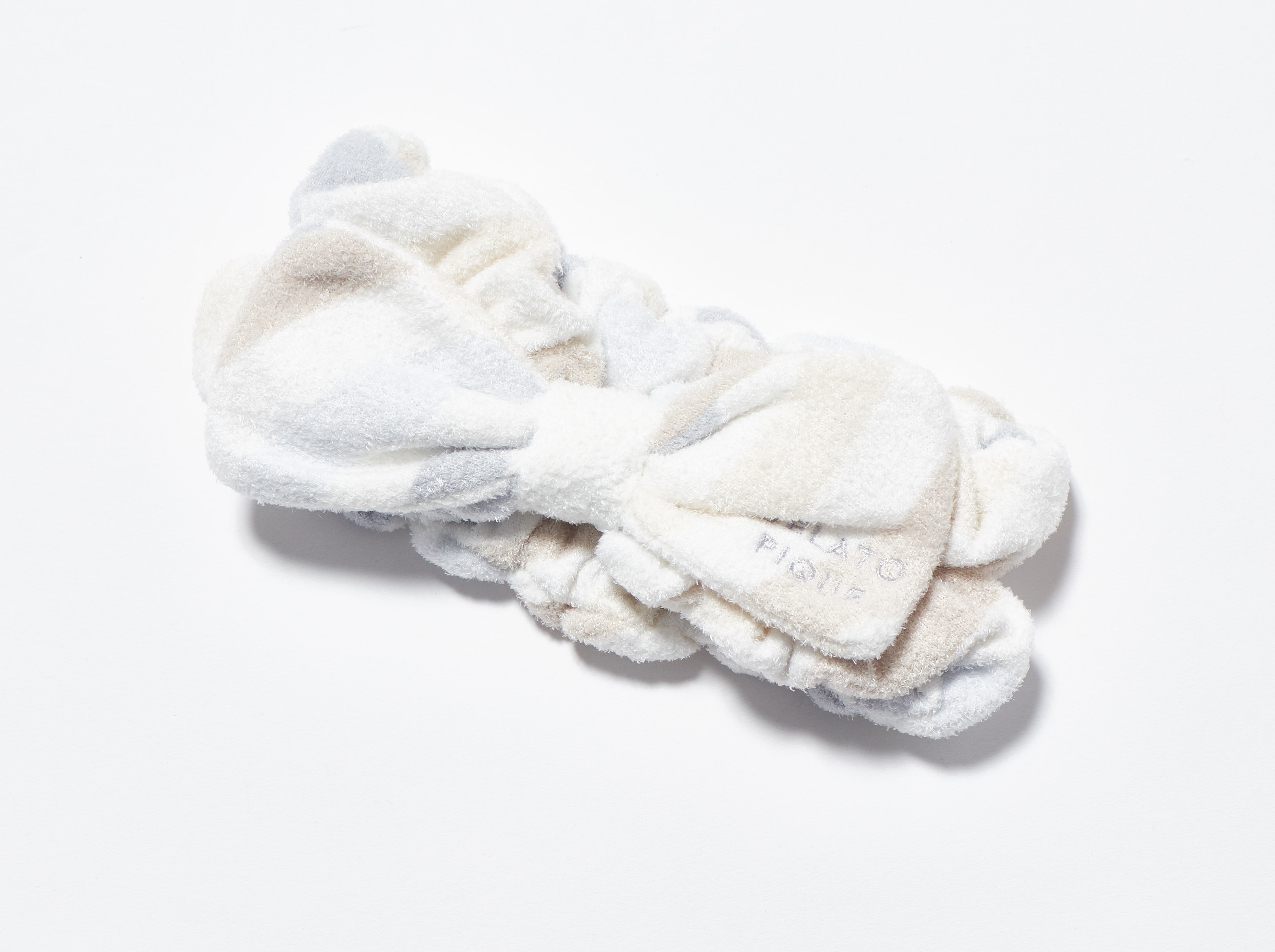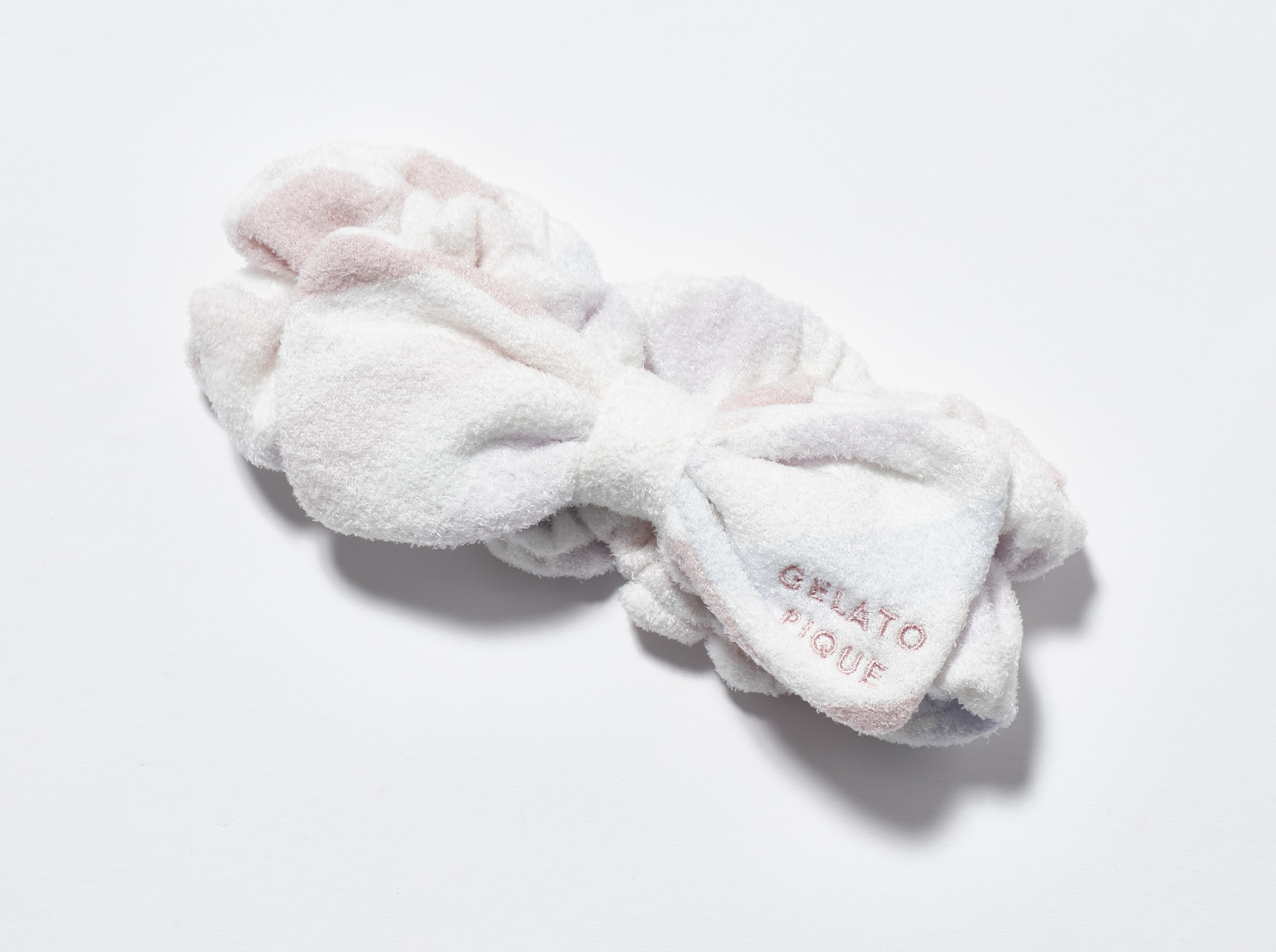 地球にやさしく、シルキーでなめらかなリサイクルスムーズィーで作ったヘアバンドは、毎日のお風呂上がりやメイクの時間などにおすすめ。女の子らしいリボンデザインはほどよいボリューム感があり、GELATO PIQUEのロゴ刺繍も添えました。