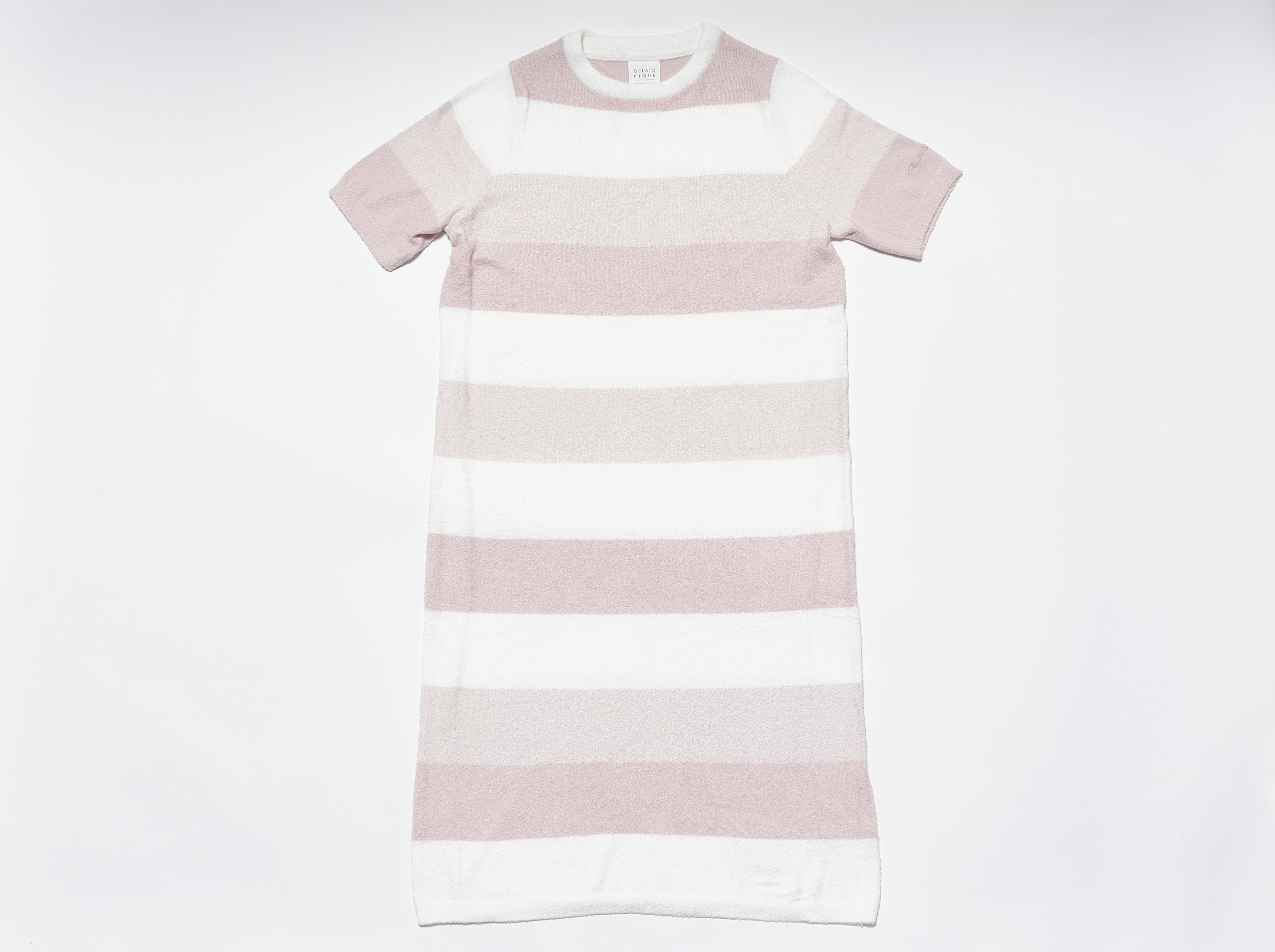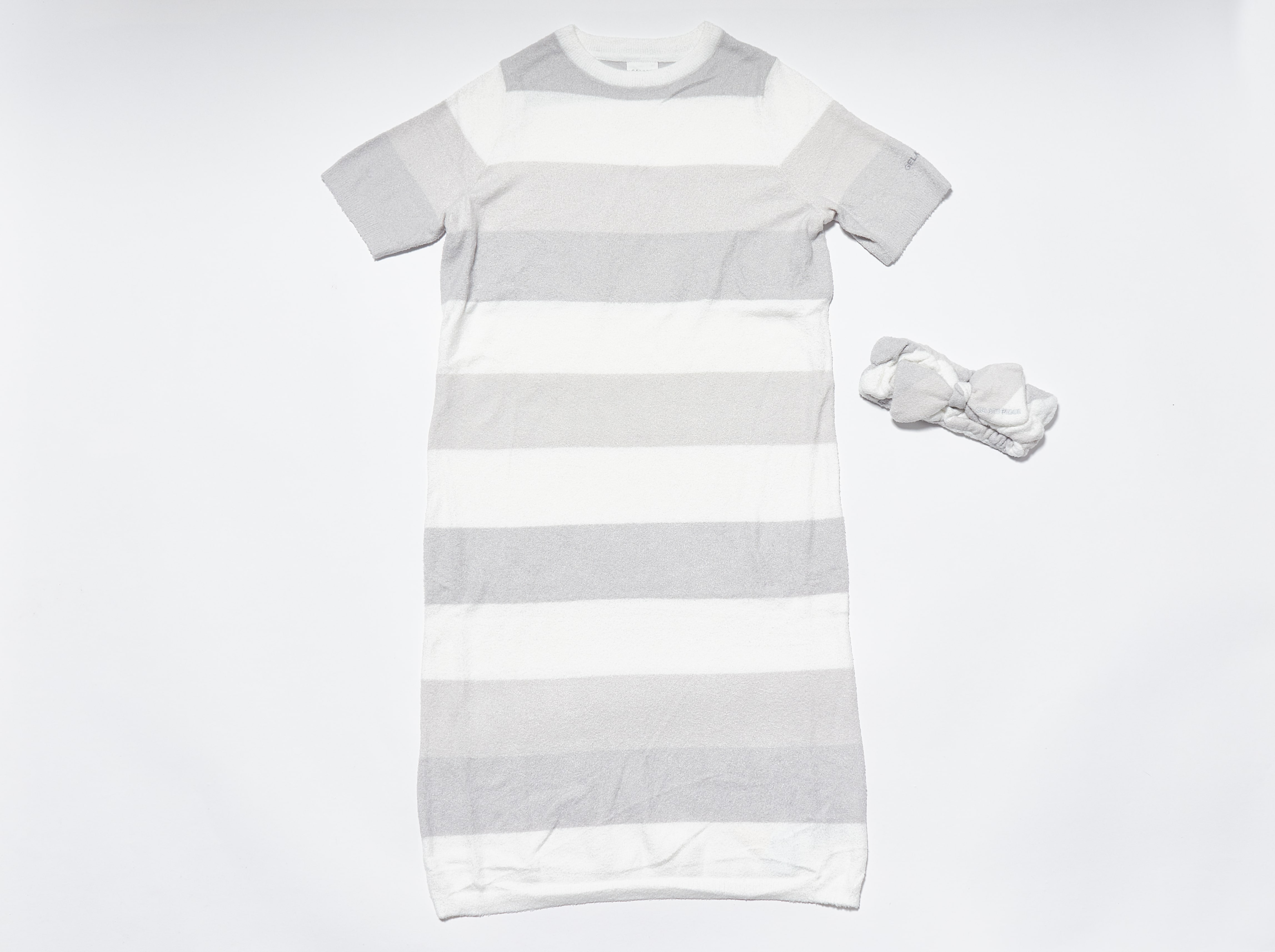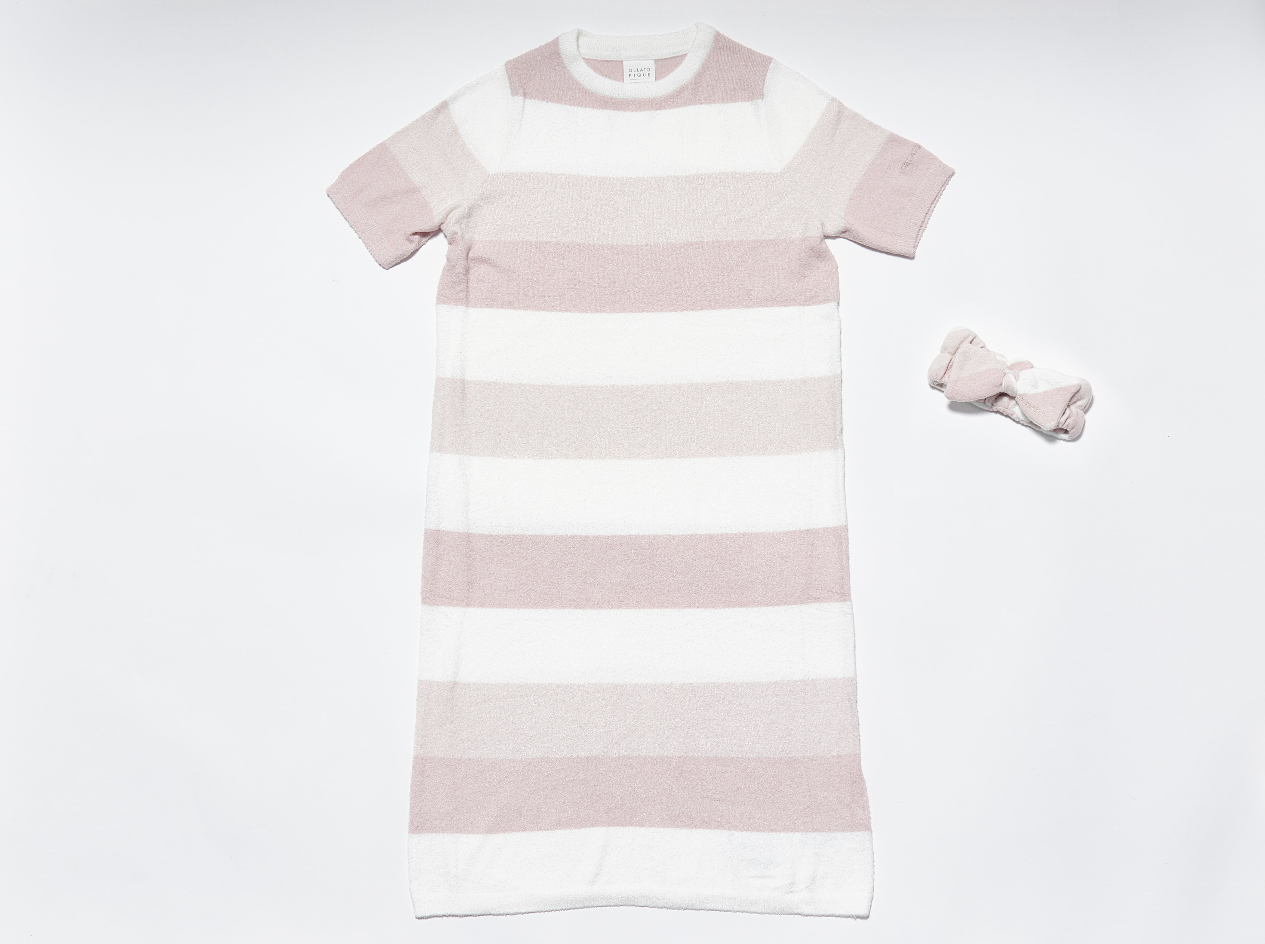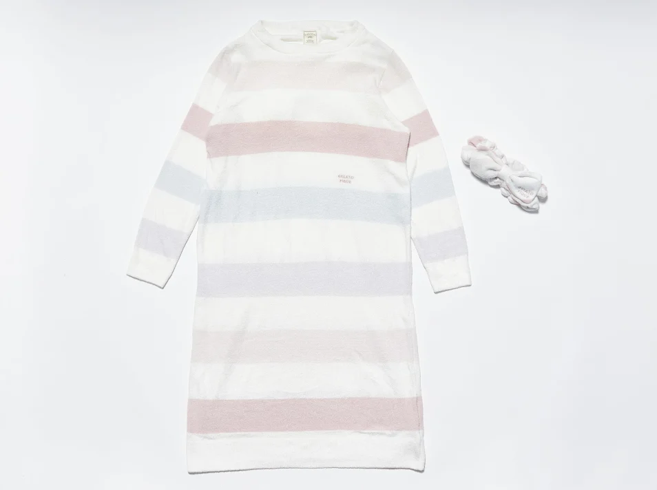 【10%OFF セール中】“大人のデザート”をコンセプトにしたルームウェアブランド「gelato pique(ジェラートピケ)」のドレスとヘアバンドのセット。毛足が短く、なめらかな質感が特長のスムーズィー素材を使用しました。シンプルなグレー系ボーダー、柔らかいピンク系ボーダーの2色からお選びいただけます。