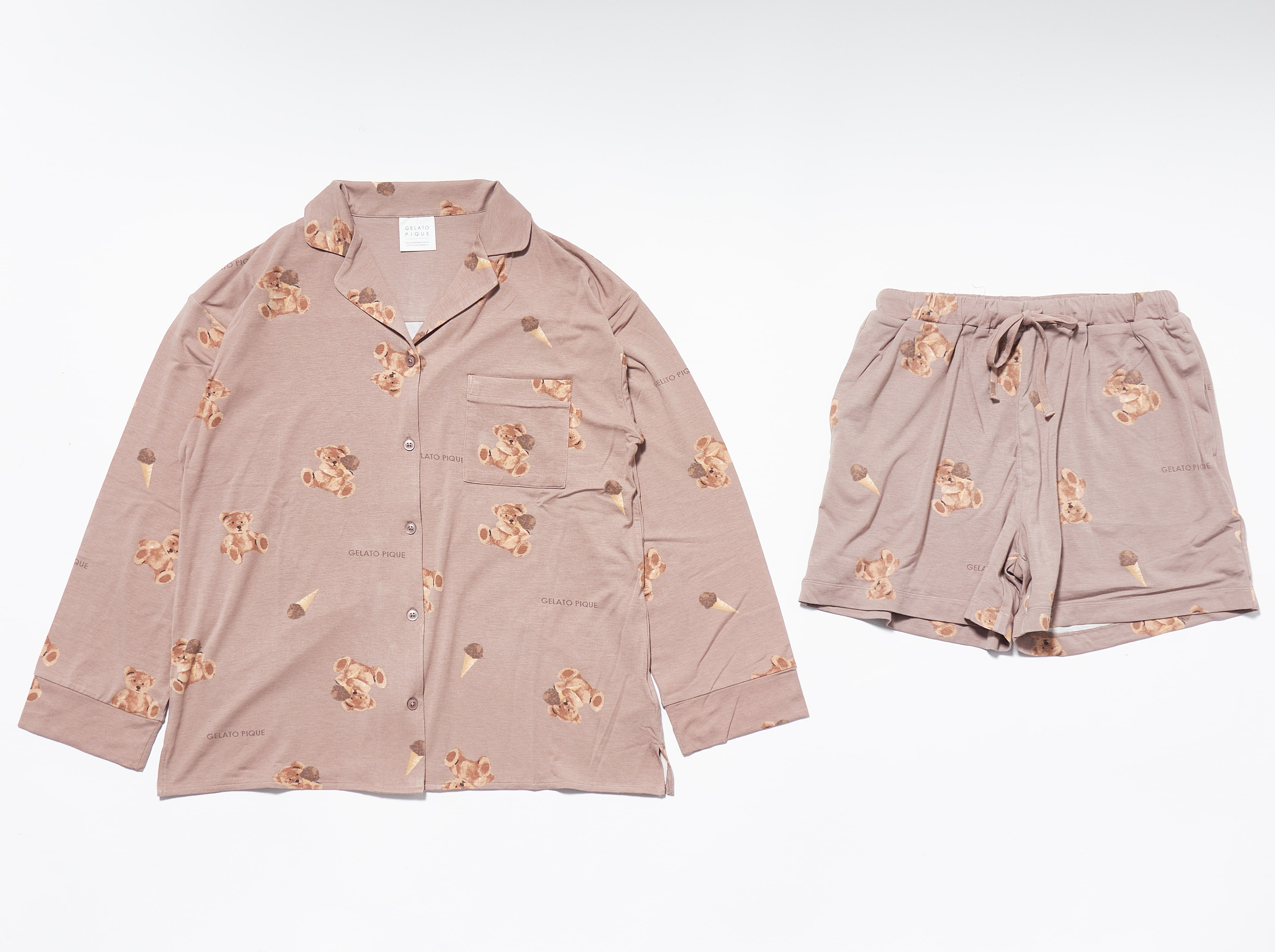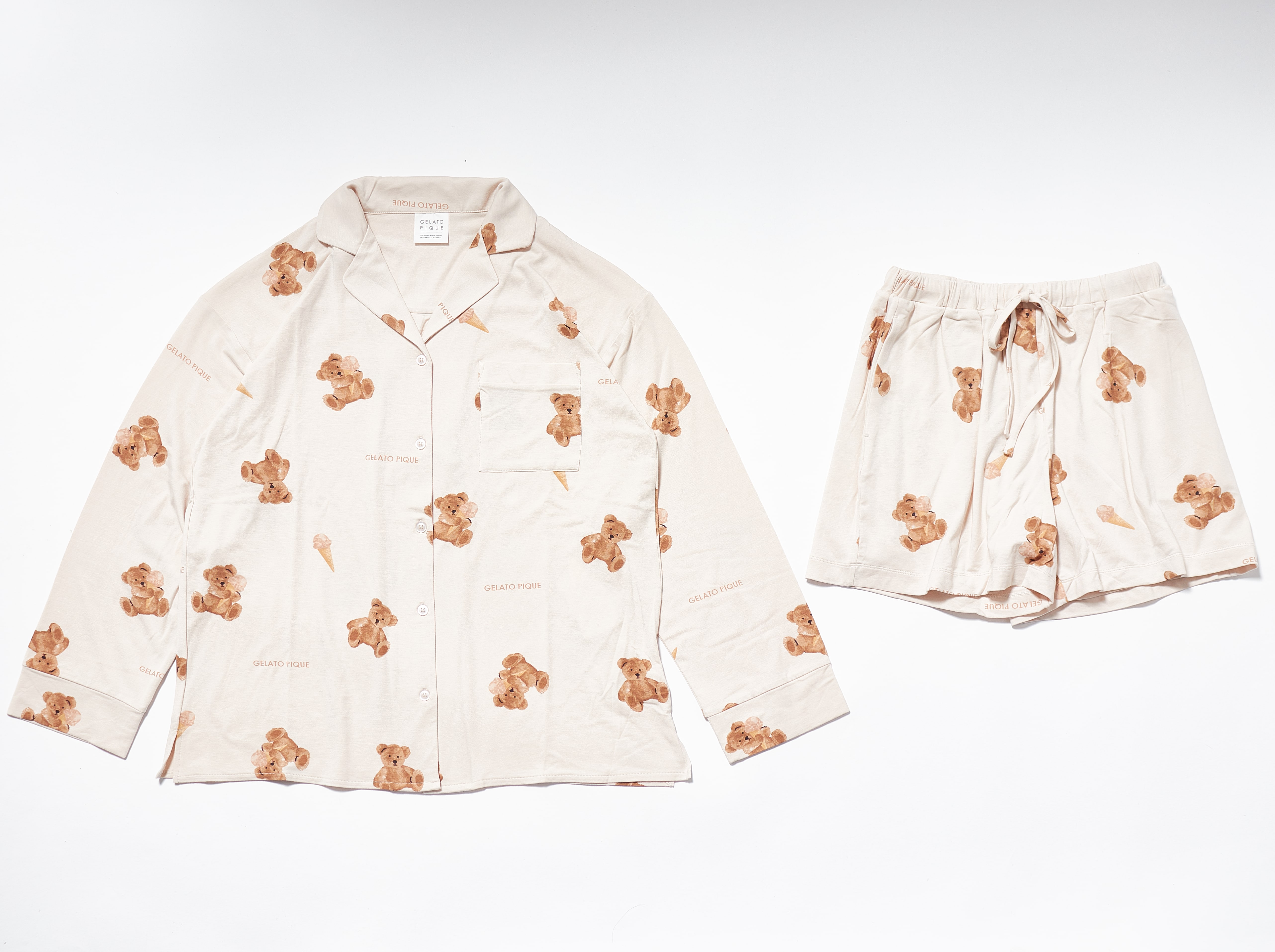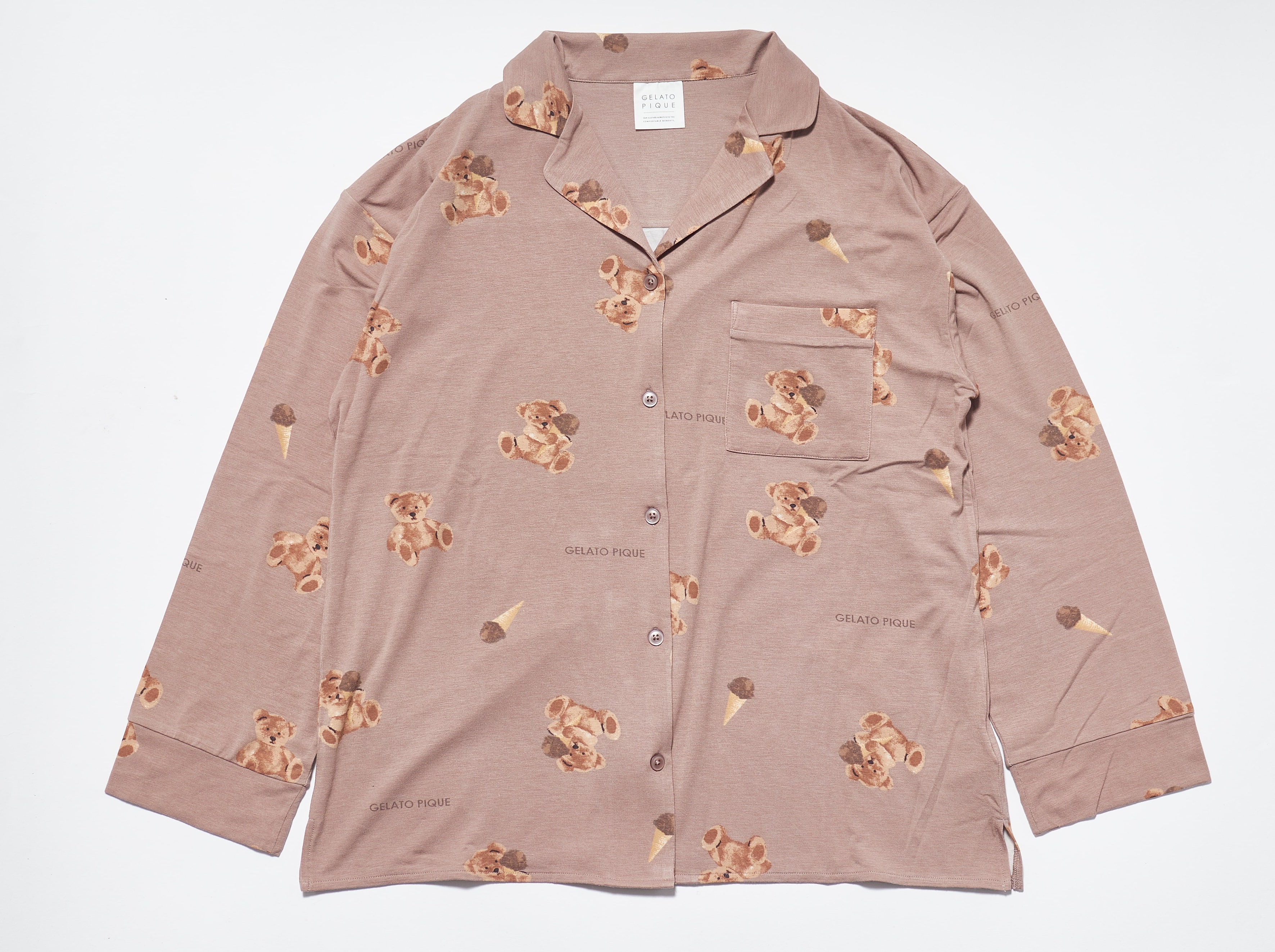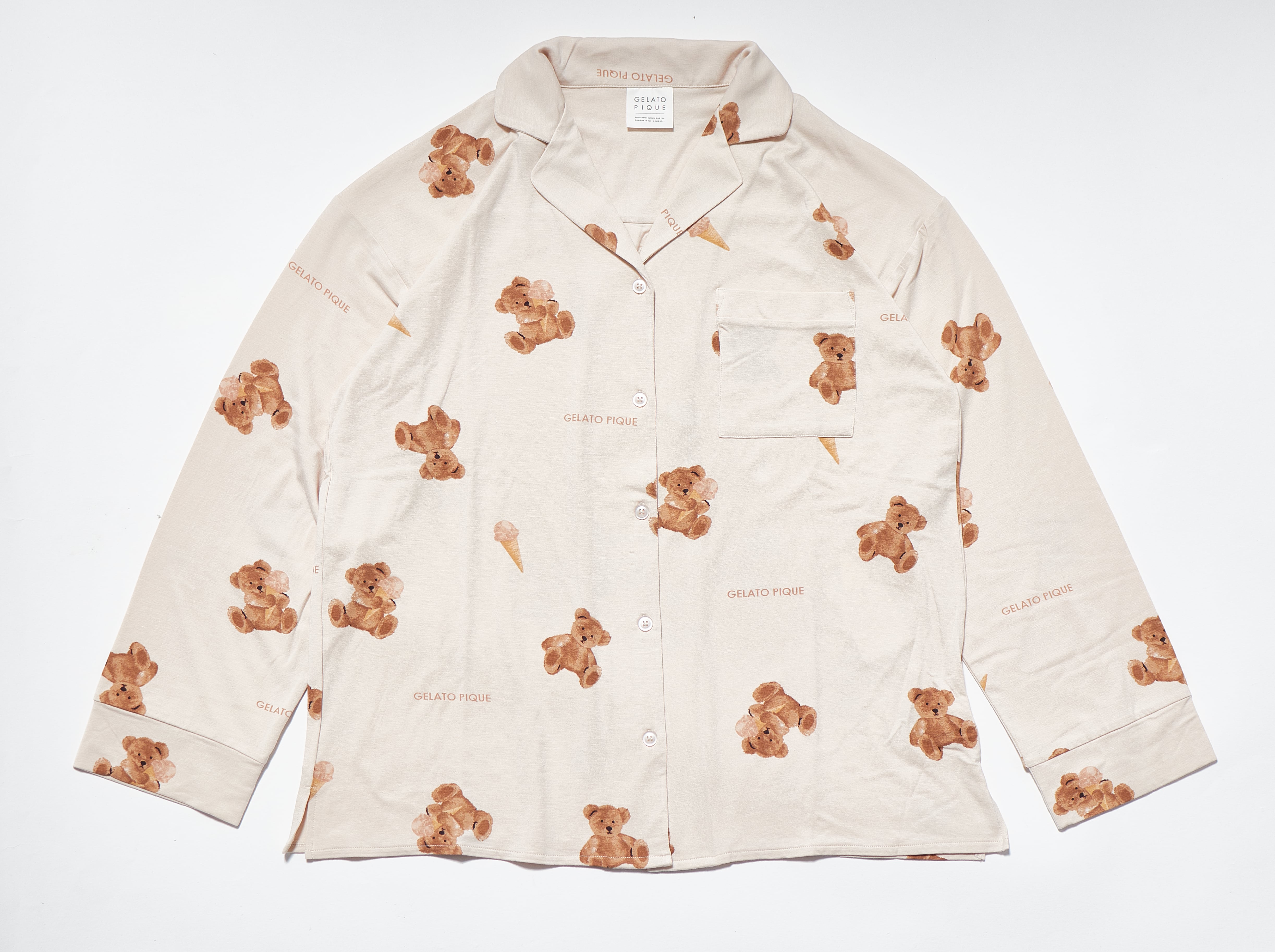 ブランドオリジナル洗剤のパッケージに描いた“ランドリーベア”に、新たにジェラートを持たせた絵柄をプリントしました。ポケットがポイントになった開衿パジャマシャツは、ゆるっとしたサイジングで可愛く着られる1枚。
