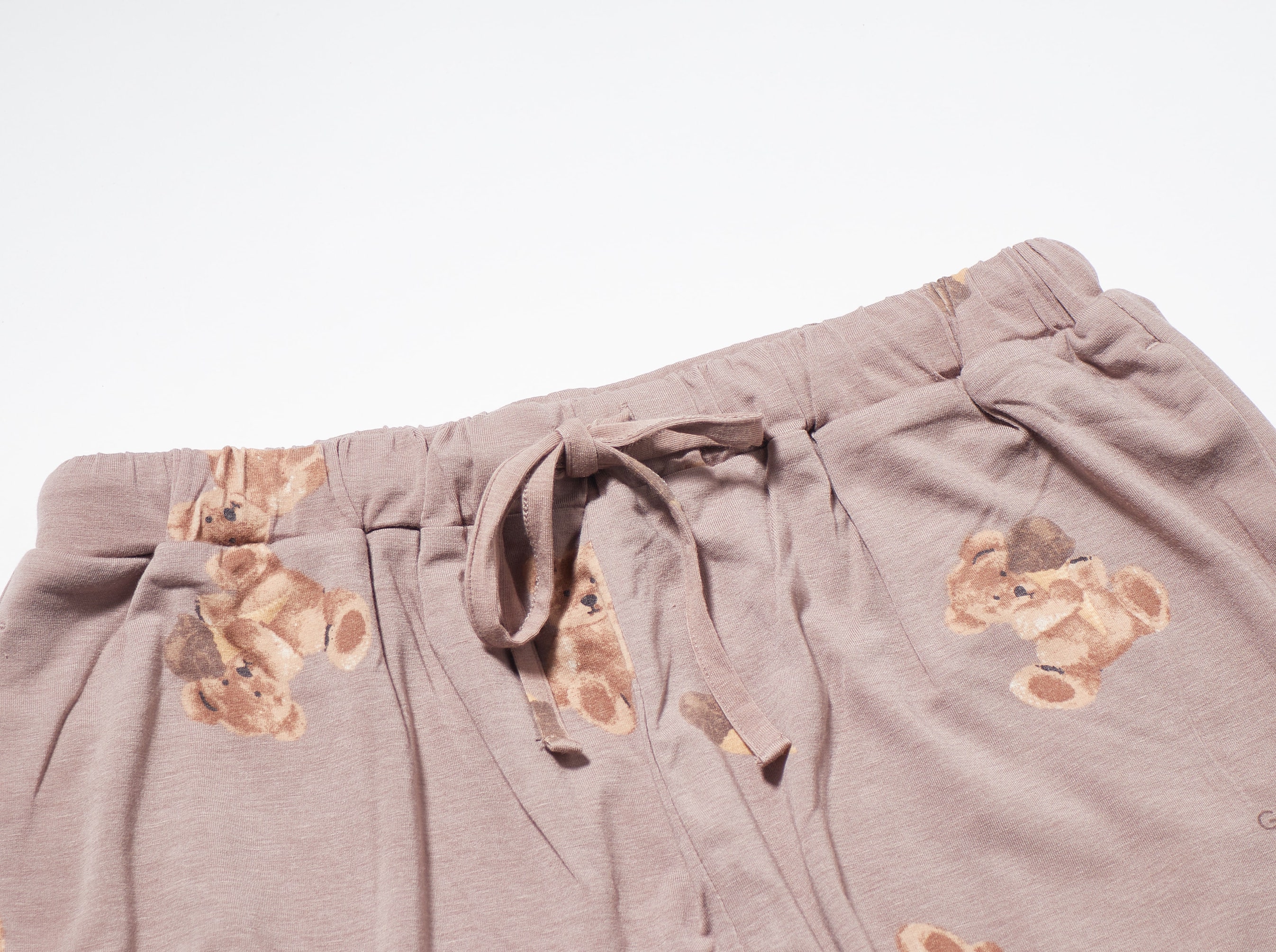 大口注文・法人のお問い合わせはこちらさらりとした肌触りのカットソーを使用したベア柄ルームウェアです。甘いチョコレートを思わせるベージュ、ブラウンの2色をご用意しました。