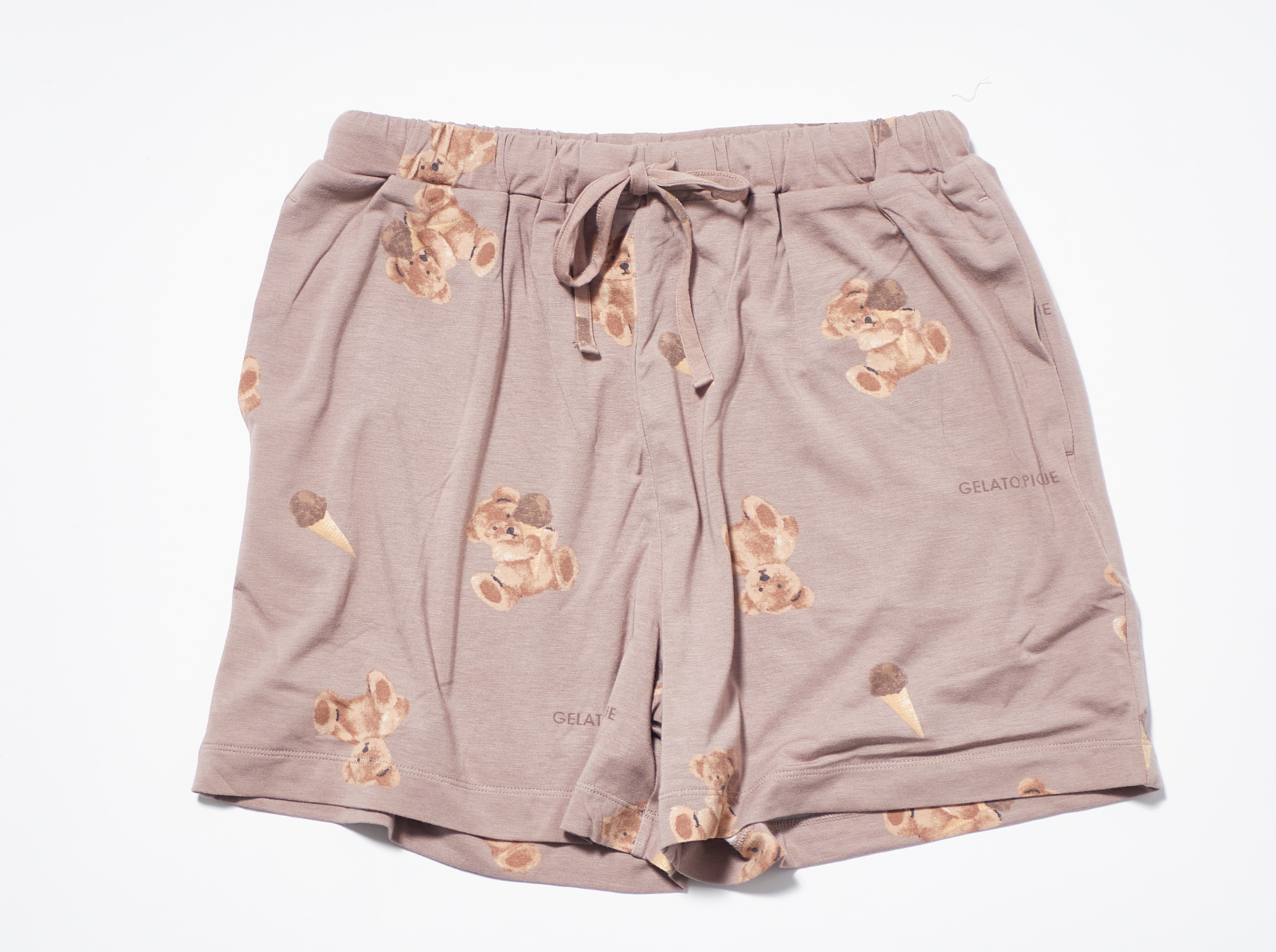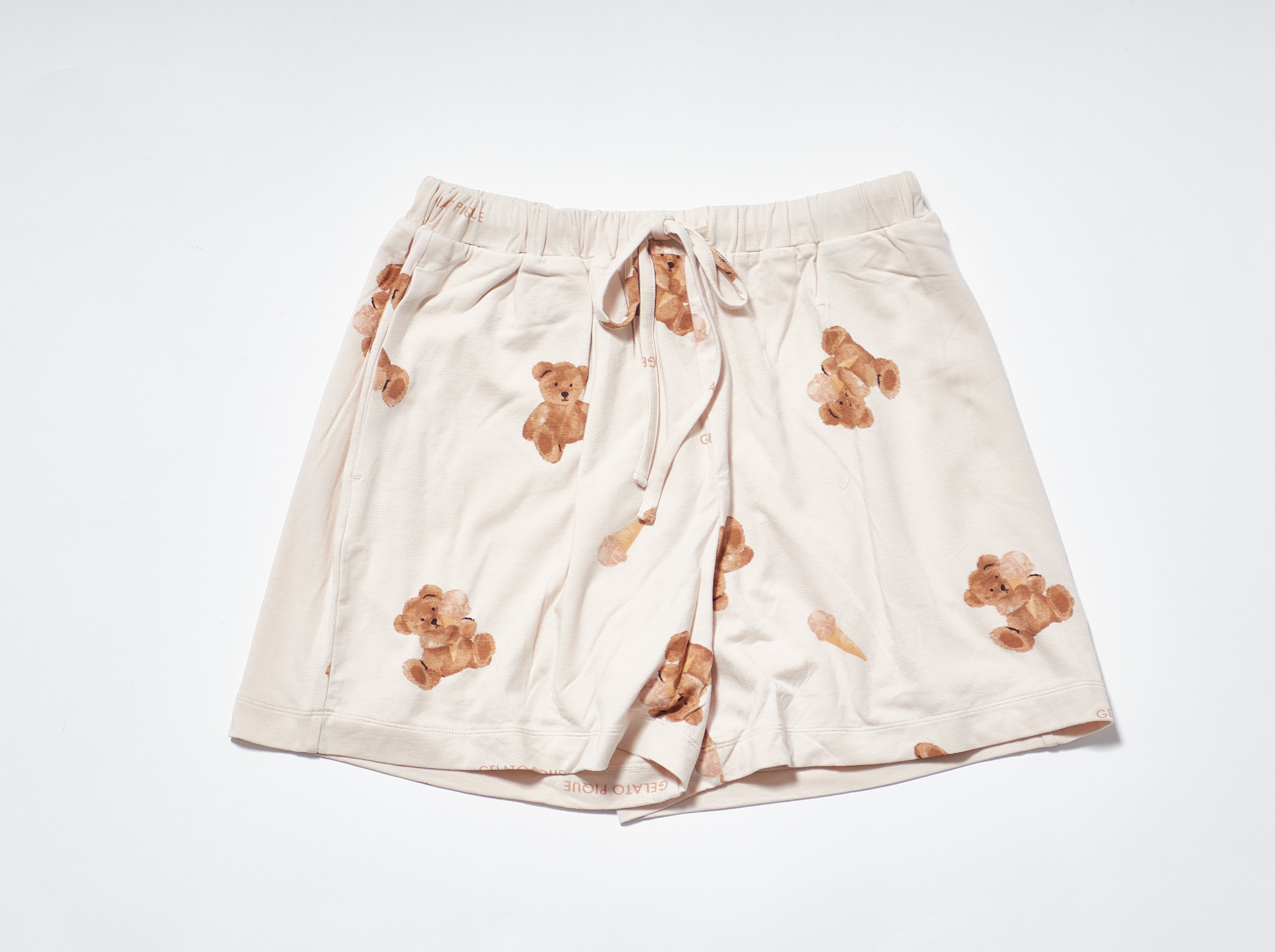 シャツ同様、ブランドオリジナル洗剤のパッケージに描いた“ランドリーベア”に、新たにジェラートを持たせた絵柄をプリントしました。定番のショートパンツはお休み中もべたつきにくく、これからの季節に快適なはき心地。