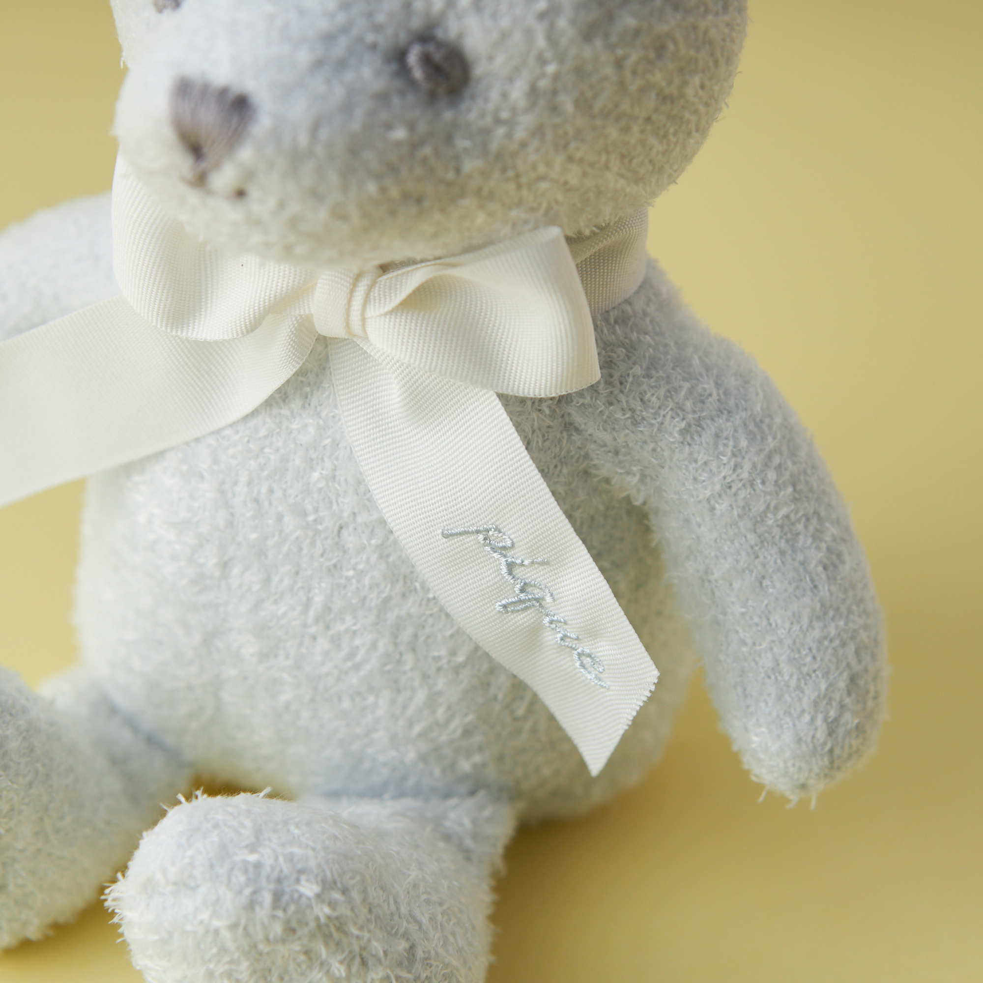 大口注文・法人のお問い合わせはこちら大切にリボンをかけた、ふわふわの可愛らしい優しい表情のくまのぬいぐるみ。