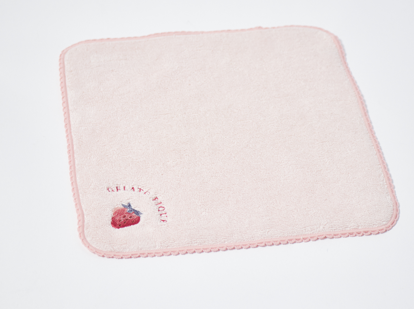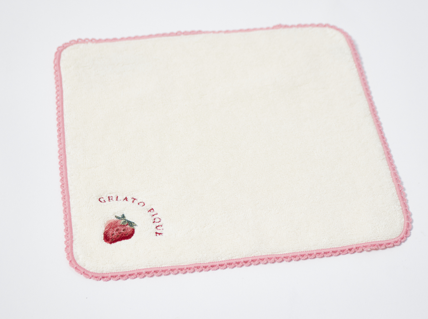 大粒のイチゴとブランドロゴの刺繍をワンポイントに入れ、同色のパイピングをあしらったシンプルなハンドタオルです。色はナチュラルでやさしいオフホワイトと、甘いいちごみるくのようなピンクの2色展開です。