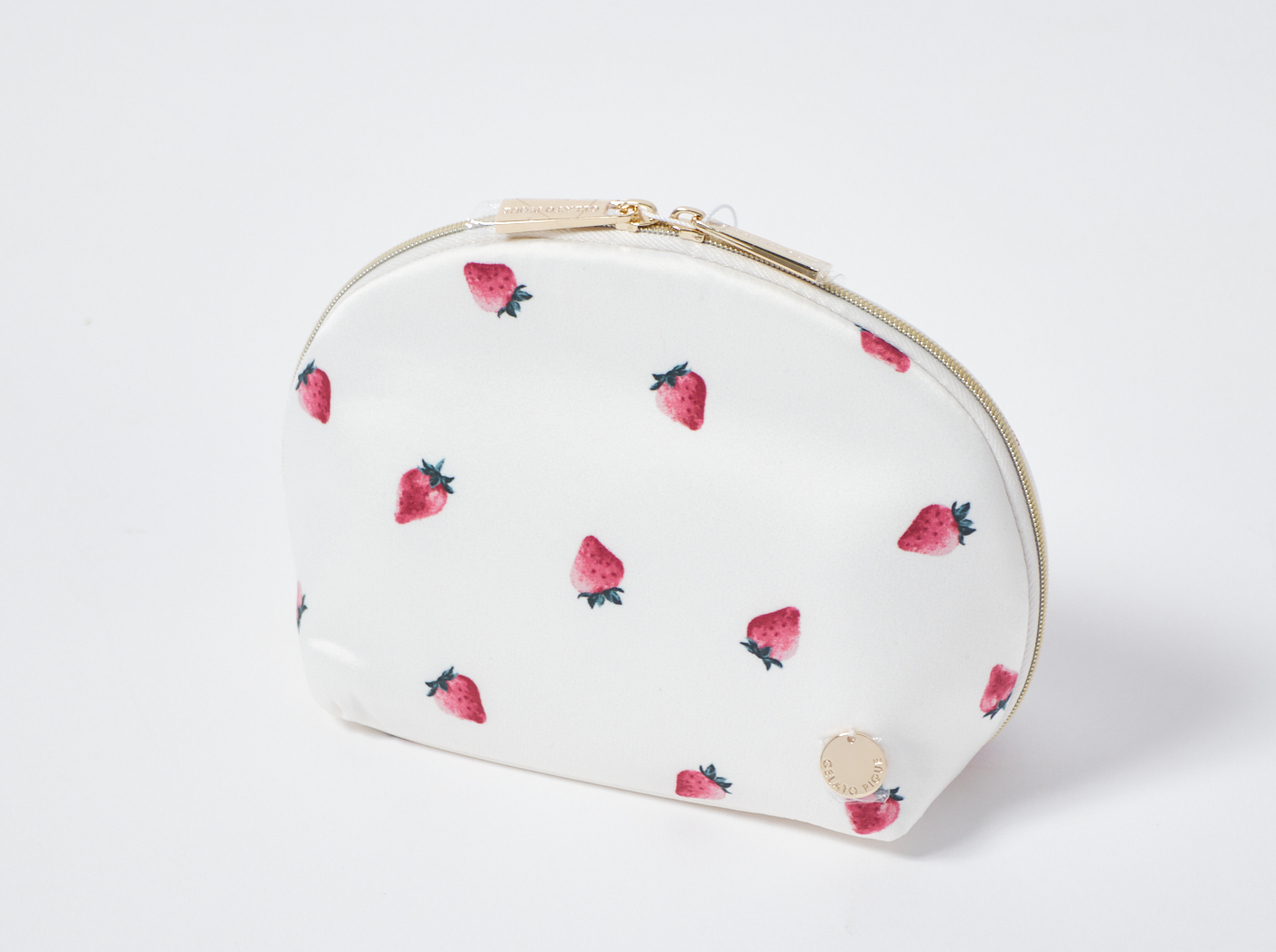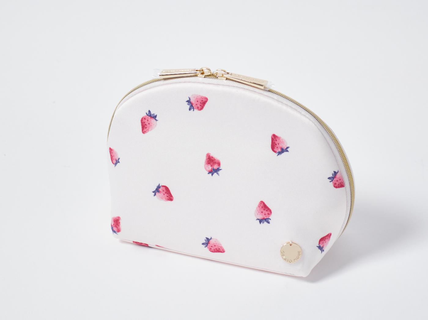 大口注文・法人のお問い合わせはこちらみずみずしいストロベリー柄にゴールドのロゴ入りチャームをあしらった、半月型の女性らしいポーチです。マチ幅があり便利な内ポケットも備えているので、基本的なメイク用品はひと通り収納可能。つるっとした上品な光沢感のある生地を使った、オフホワイトとピンクの2色展開です。
