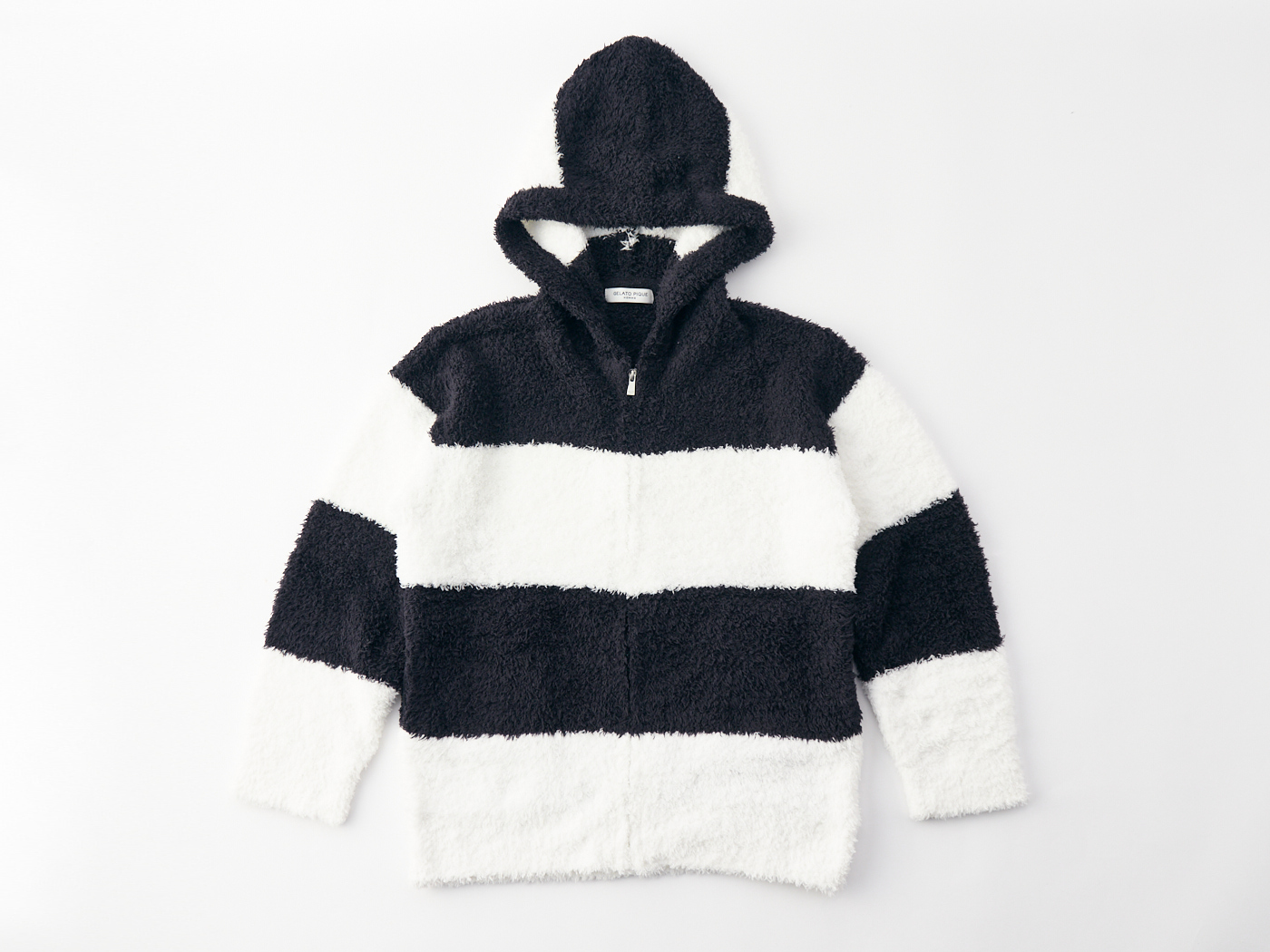 大胆な2ボーダーでカジュアルに魅せるジップパーカー。定番の形だからデイリーに使えて、後ろ見頃の裾は大きなロゴデザインでアクセントを付けました。