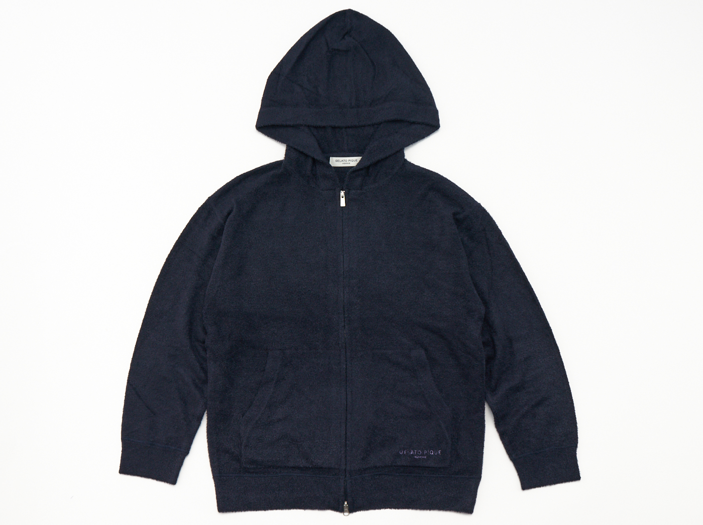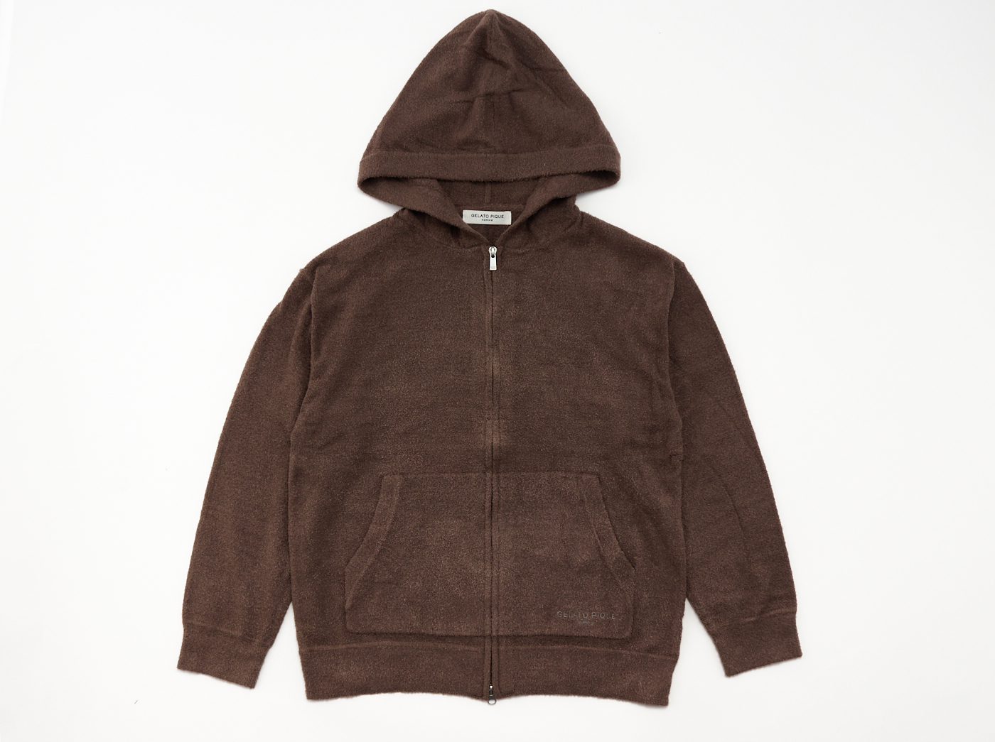 落ち着いた大人っぽいカラーリングのジップパーカーは、フロントポケットに同系色の糸でロゴ刺繍入り。カットソーをイメージしたギザギザのミシンステッチもポイントです。