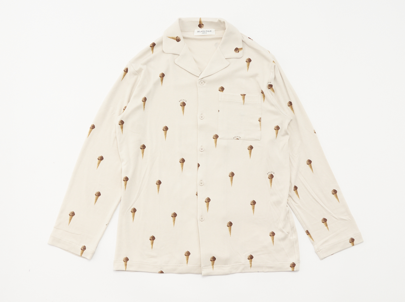 “大人のデザート”をコンセプトにしたルームウェアブランド「gelato pique(ジェラートピケ)」のフライス地が肌に心地良いジェラート柄パジャマ。冬に食べたくなる、こっくり甘いジェラートをモチーフにした総柄シャツです。男性へのプレゼントにぜひご利用ください。