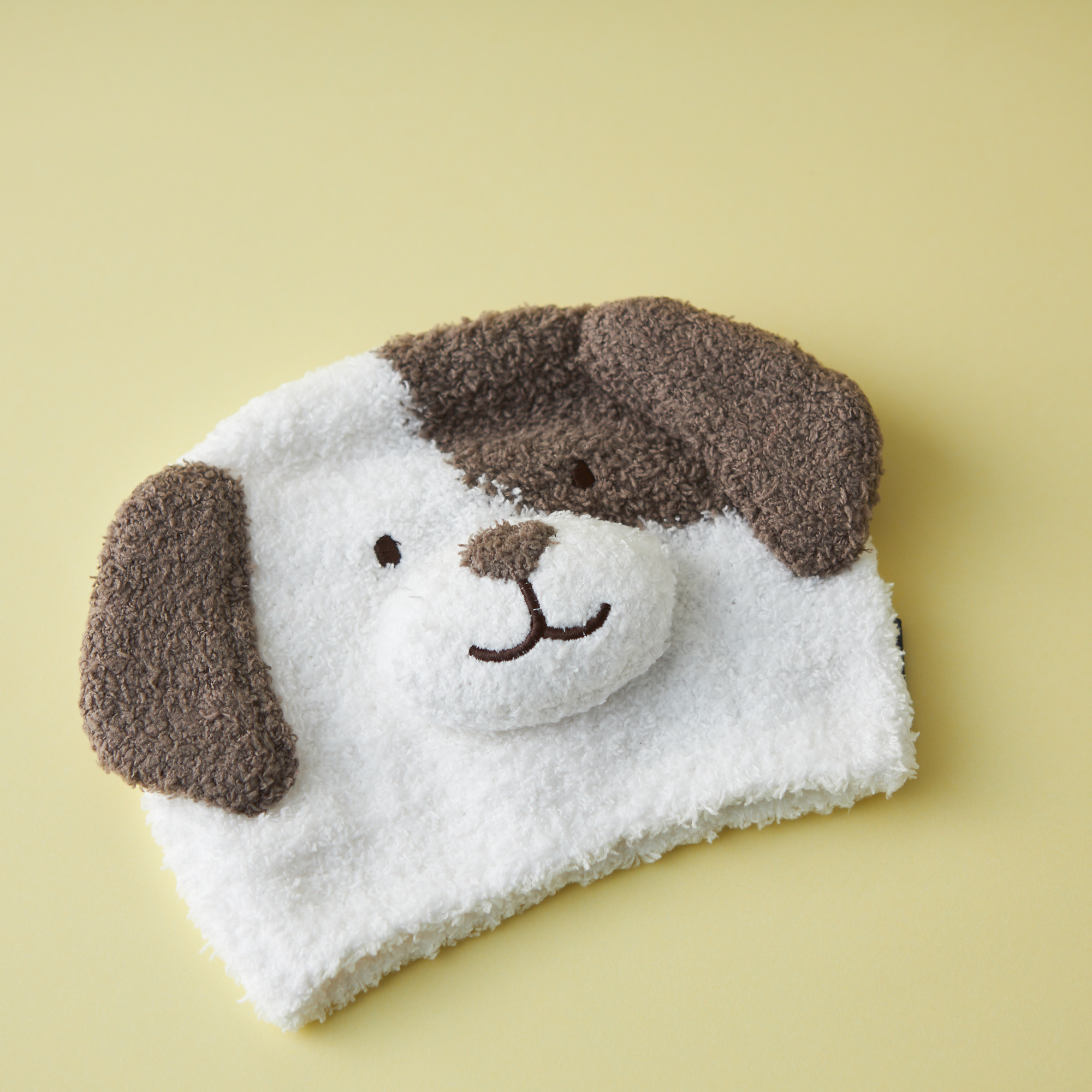 ふんわりと軽いベビモコ素材で作った、ドッグの形をしたベビー用ニットキャップ。実際にかぶると丸みのあるお耳のシルエットが可愛くて、思わずギュッと抱きしめたくなってしまいます。