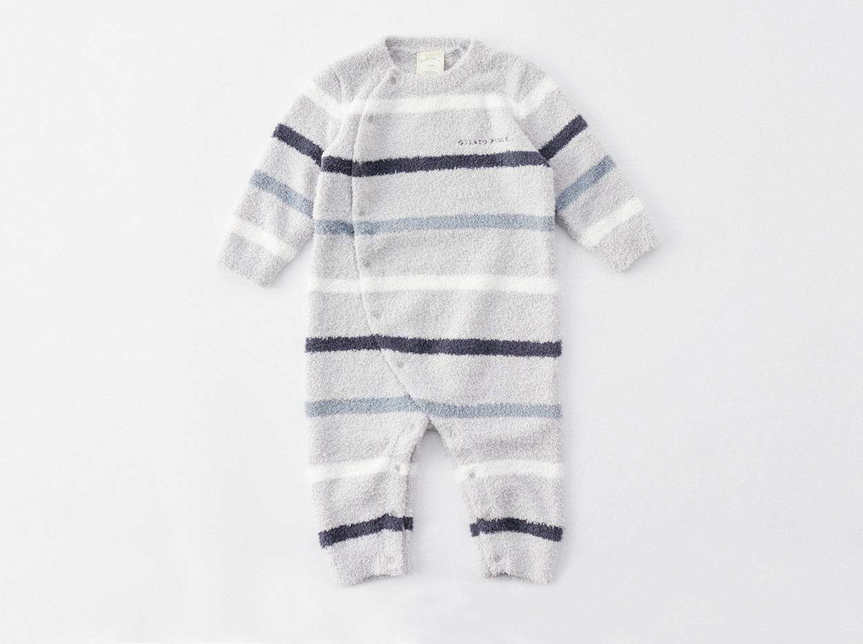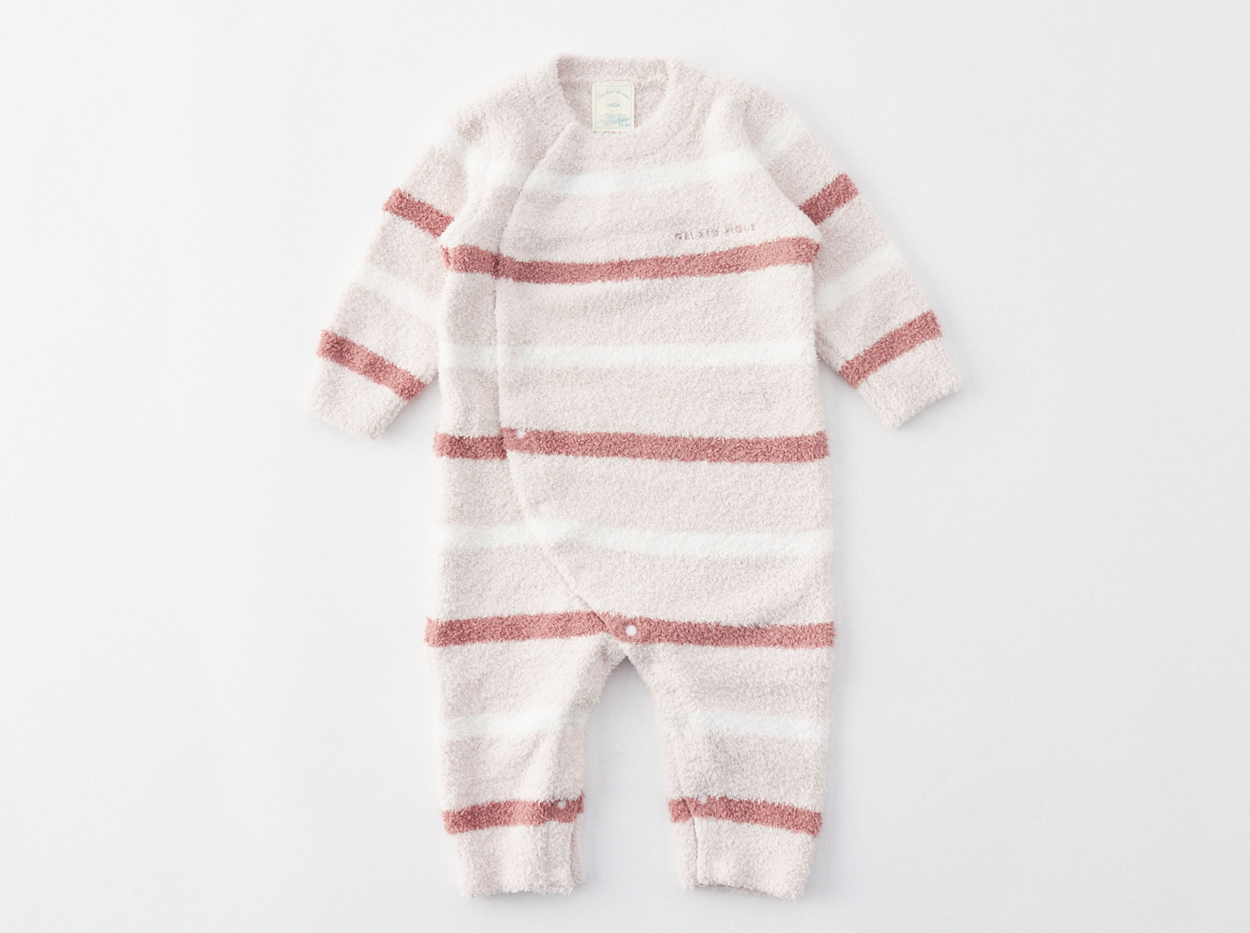 大口注文・法人のお問い合わせはこちらふんわりライトな短毛で着心地もなめらかなベビモコ素材に、コントラストが効いた細めのボーダーを合わせました。胸元にブランドロゴの刺繍を入れたロンパースは、ソフトで温かい着用感で赤ちゃんにも安心して着ていただけます。