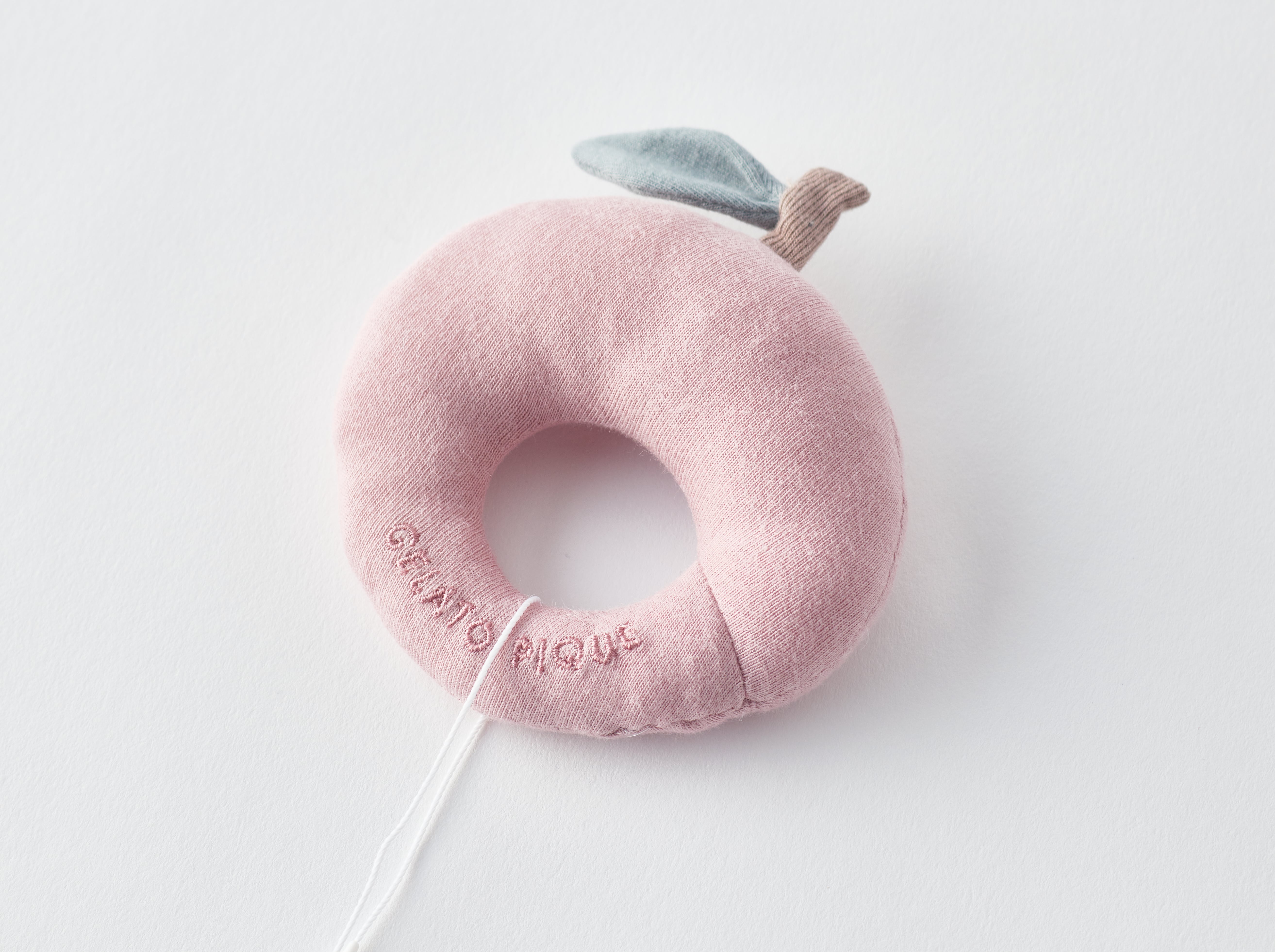 カラフルなフルーツアニマル柄にちなんでデザインした、まぁるいリンゴモチーフのラトルです。さりげなくロゴ刺繍を入れた本体の素材は、やわらかくてふわっとしたスムース素材。 ふると優しい鈴の音が鳴って、赤ちゃんの関心を引きます。立体的に作った葉っぱのデザインもこだわりポイントです。