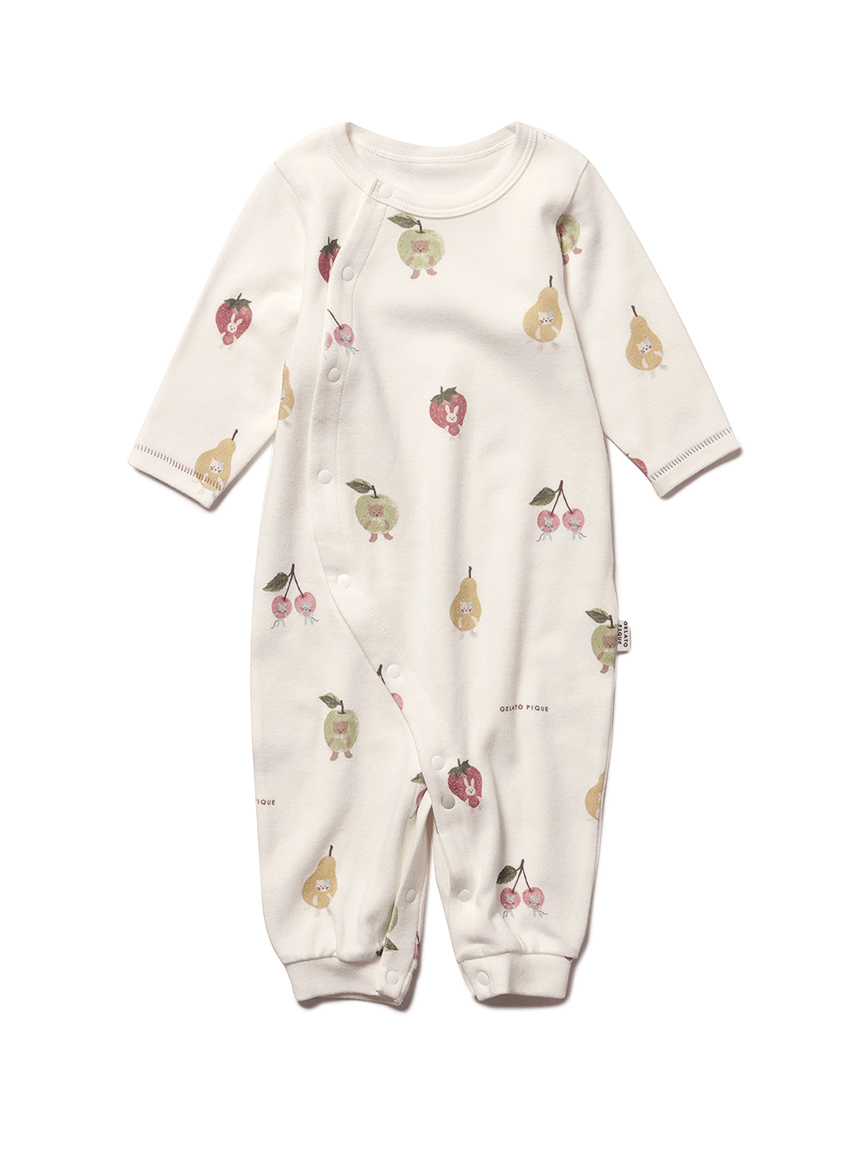 美味しそうなフルーツの着ぐるみを着た、とってもキュートな動物たち。スムース生地を使った、カラフルなフルーツアニマル柄シリーズです。 ドレス、カバーオールとベビーの成長に合わせて使える2WAYオールは、袖口や裾にさりげなく入れた配色ステッチがポイント。