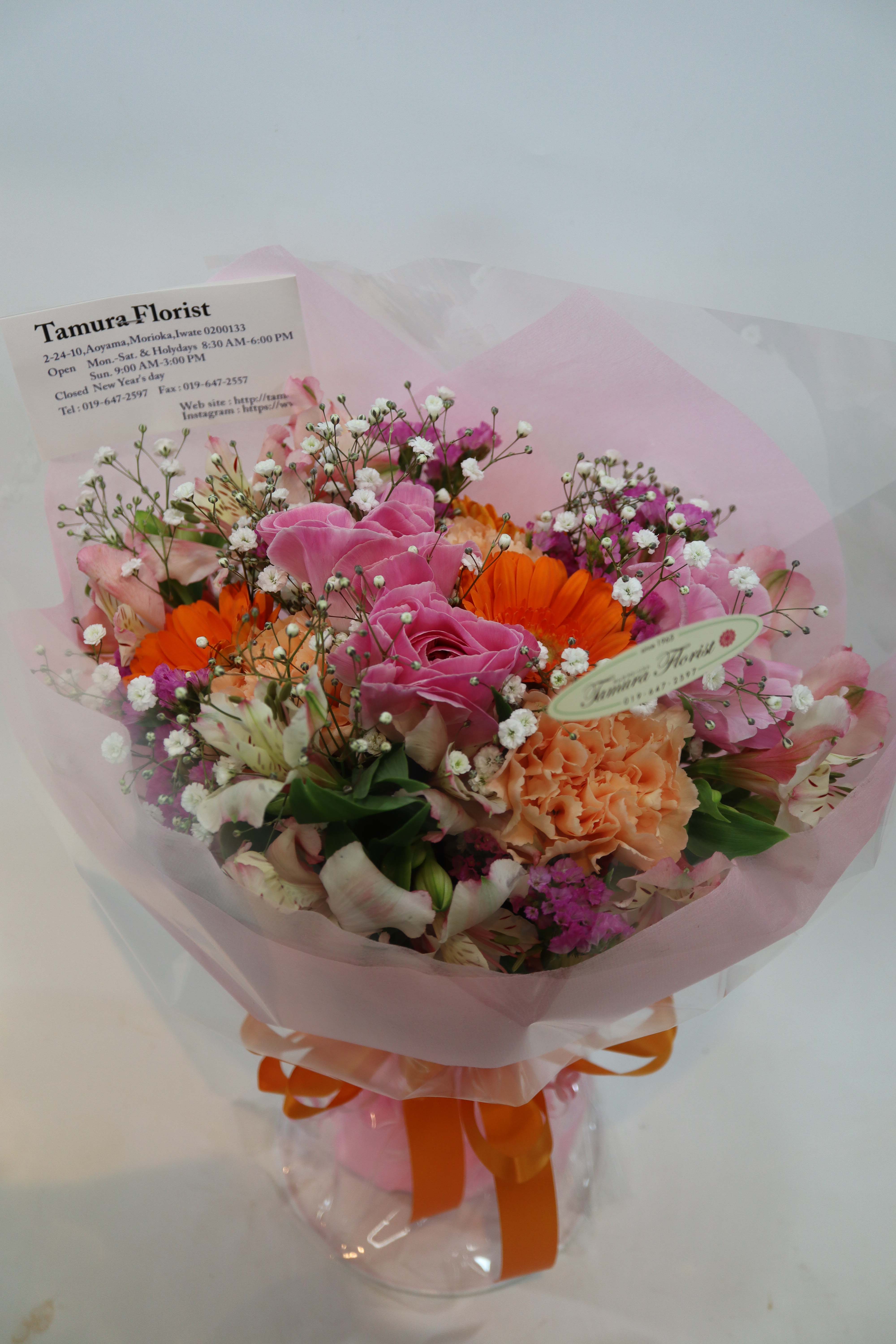 大口注文・法人のお問い合わせはこちらオホンジュはピンク系の花束です。濃淡のピンクが可愛らしい花と、鮮やかなオレンジの花がアクセントになっています。リボンもオレンジで、気持ちが明るくなるようなデザインに仕上げています。