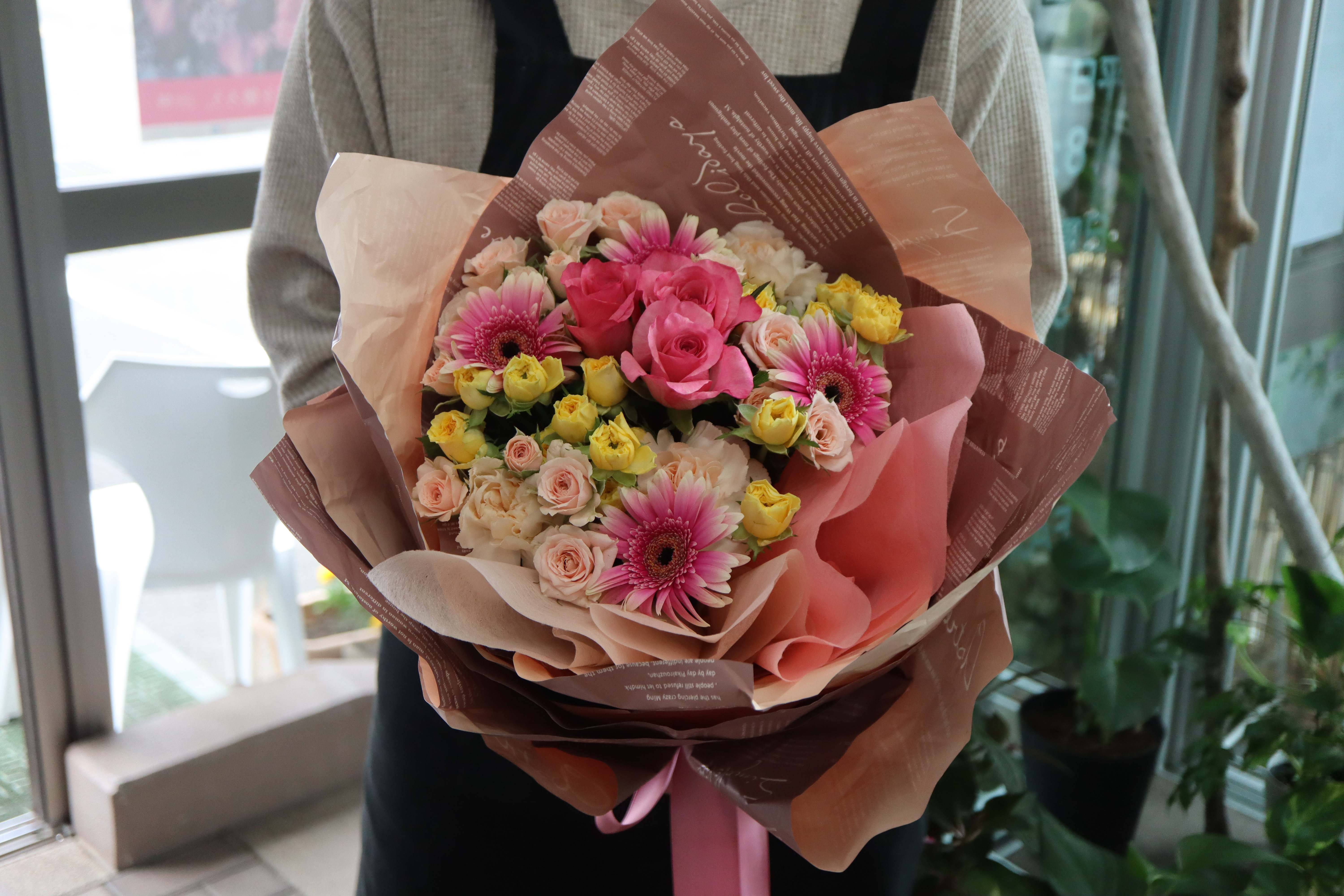 大口注文・法人のお問い合わせはこちらクロッカスはバラを中心にピンク系の花を集めた花束です。淡いピンクと濃いピンクの花をバランスよく配置しました。イエローのバラがアクセントになっています。ラッピングペーパーはブラウンカラーをメインに使用し、落ち着いた雰囲気に仕上げています。