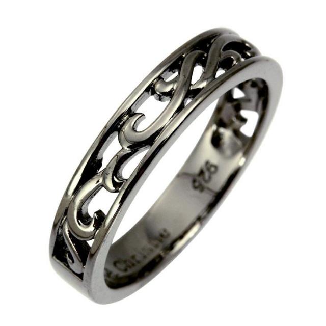 立体的で繊細な装飾が施された、デコラティブなルックスのランソーリング。 ランソー(rinceaux)とはフランス語で「唐草模様」という意味を持ちます。 細部にまでこだわった、透かし彫りの唐草模様のデザインがモダンな指先を演出してくれる、 男女ともに人気の高いリングです。 スターリングシルバーに施したブラックコーティングが、 シックでクールなイメージを演出してくれます。