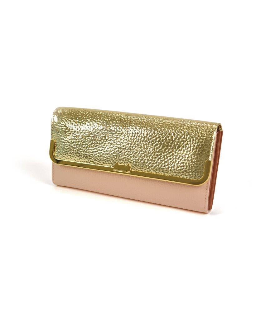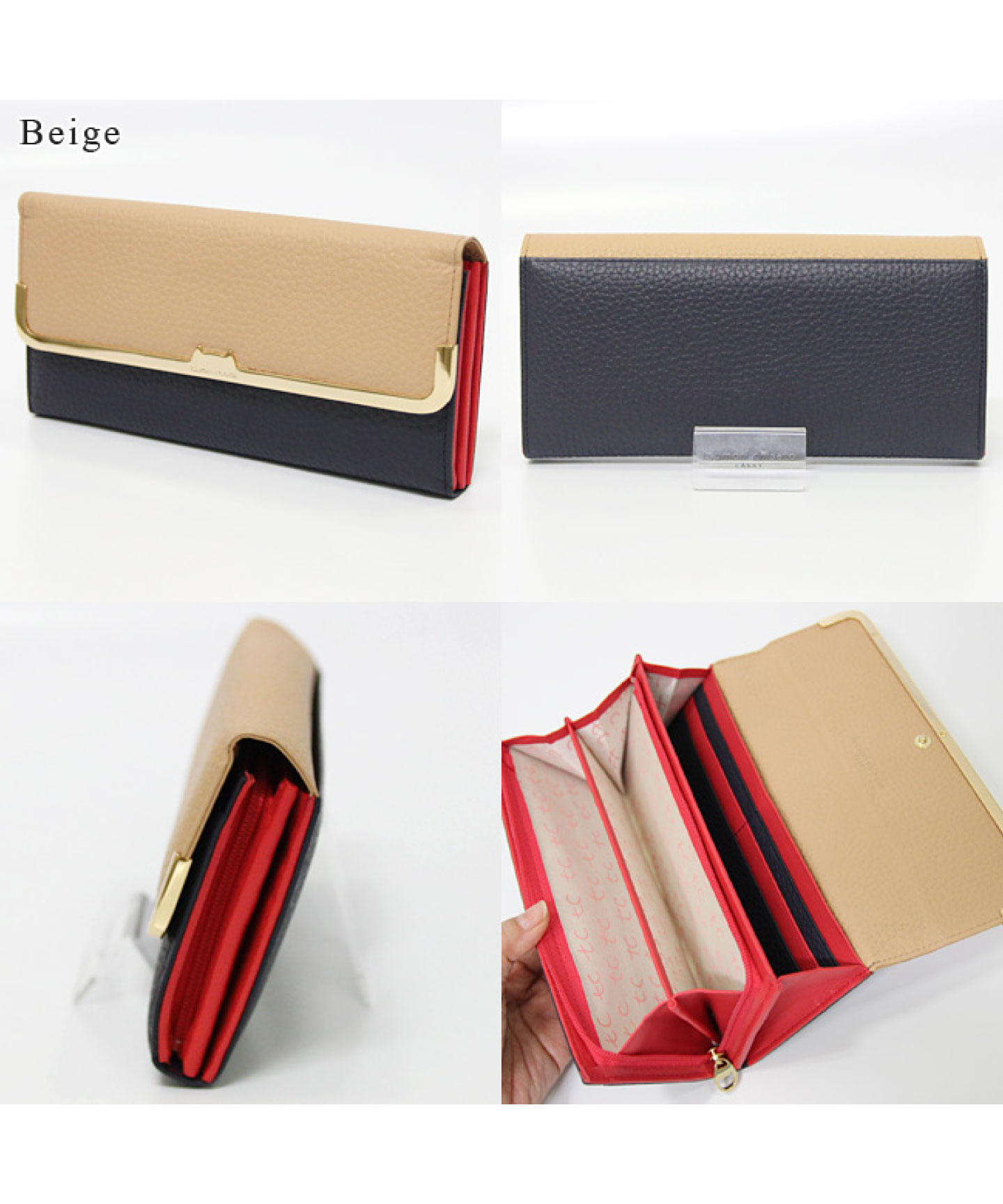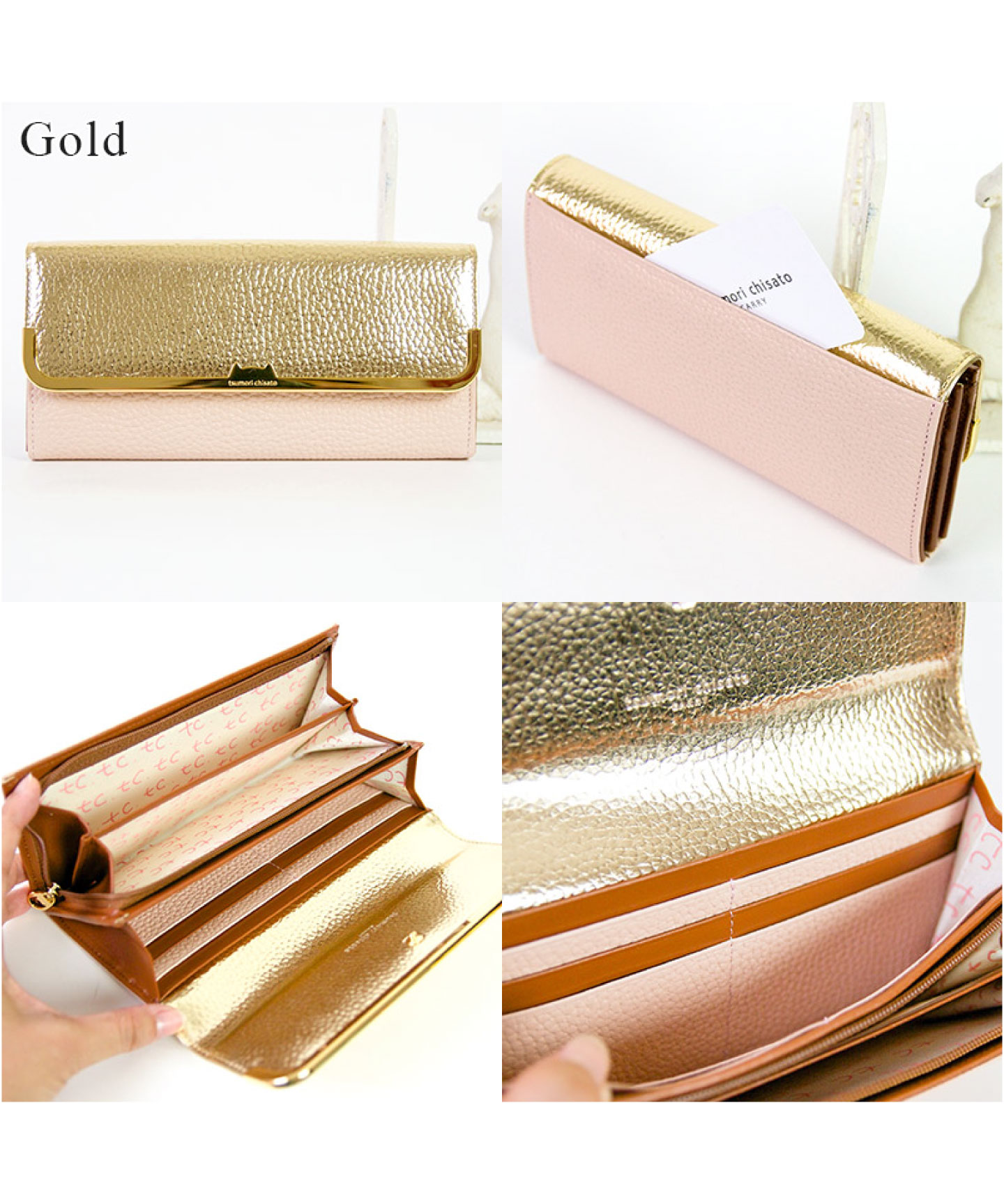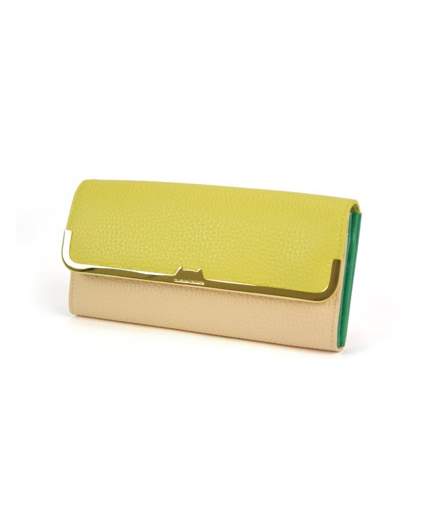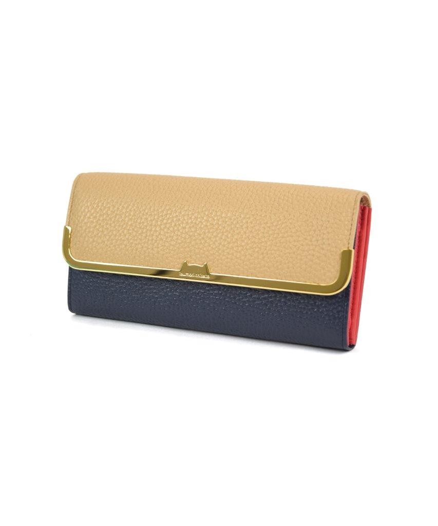 デザイナー津森千里が好きなものを自由な発想で表現したブランド「tsumori chisato CARRY(ツモリチサトキャリー)」。本革のシュリンク素材を使用したお財布で、レザーのカラーコンビネーションが軽快です。かぶせの金具は中央がネコシルエットになった可愛らしいデザインです。