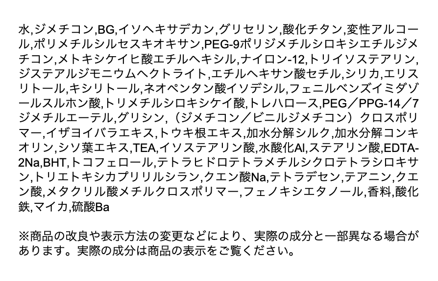| 使用上の注意・使用法 | <使用方法> ・スキンケアで肌を整えた後にお使いください。 指先にパール粒1コ分をとり、顔の5ヵ所(両ほお、額、鼻、あご)におき、顔の中心から外側に向かってやさしく指をすべらせて顔全体に均一にのばします。 ・小ジワや毛穴が気になる部分には少量をやさしく重ねづけし、指先で軽くたたくようになじませると効果的です。 ・下地がよくなじんだことを確認してからファンデーションをつけてください。 ・使用量が少ないと、十分な紫外線防御効果が得られません。 <使用上の注意> ・目に入らないよう注意し、入ったときはすぐに洗い流してください。 ・乾きやすいタイプのため、ご使用後は容器の口もとをティッシュペーパーなどで拭きとり、キャップをきちんと閉めてください。 ・衣服についた場合は、洗剤で丁寧に洗ってください。 ・日のあたるところや高温のところに置かないでください。 |