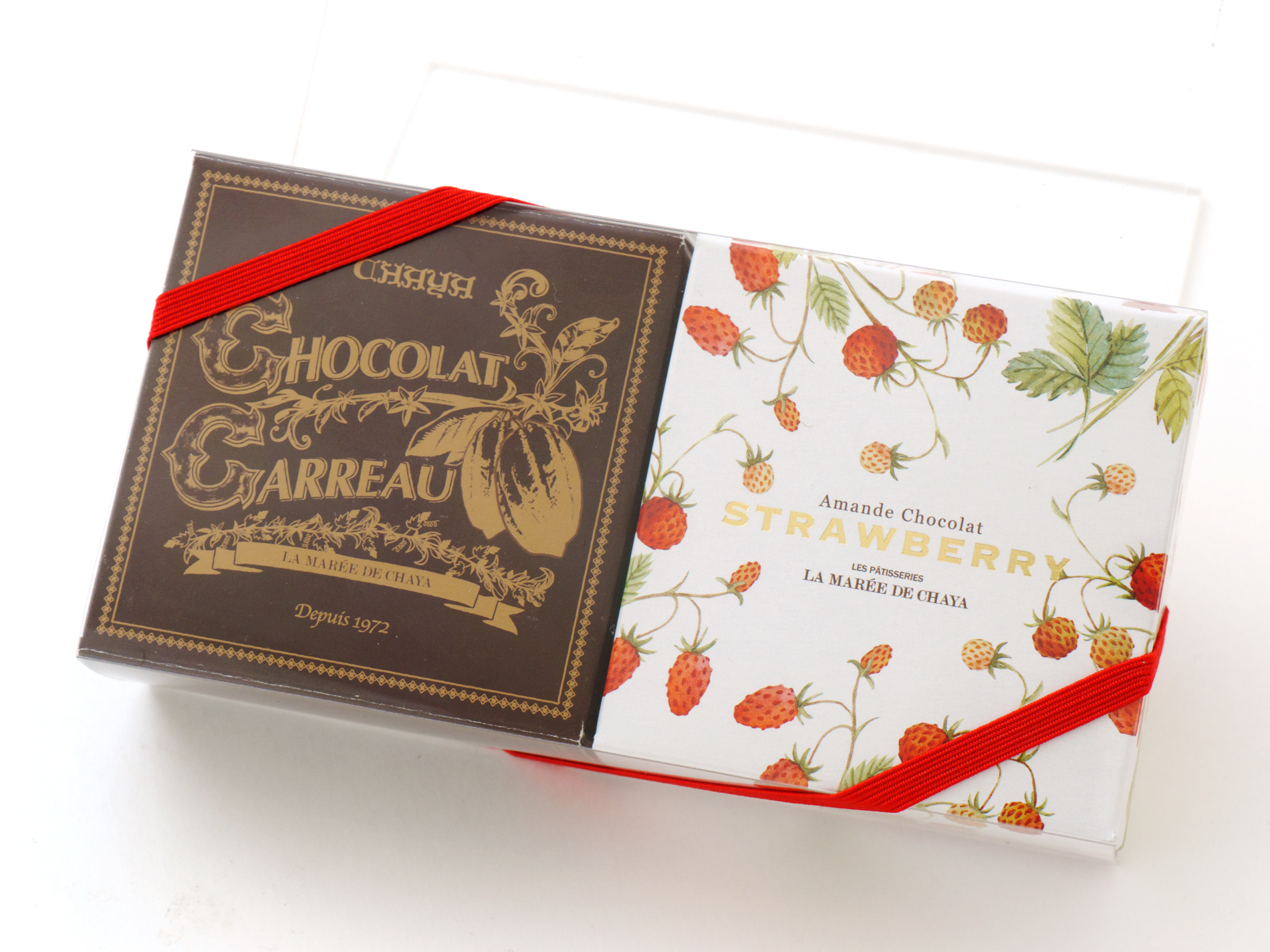 四季折々の豊かな素材を生かし葉山で創業した「LA MAREE DE CHAYA(ラ・マーレ・ド・チャヤ)」のストロベリーアマンド、カフェショコラ、ペカンナッツショコラの選べる3種類とショコラ・カロのセットです。一口サイズなので、気軽にお召し上がりいただけます。