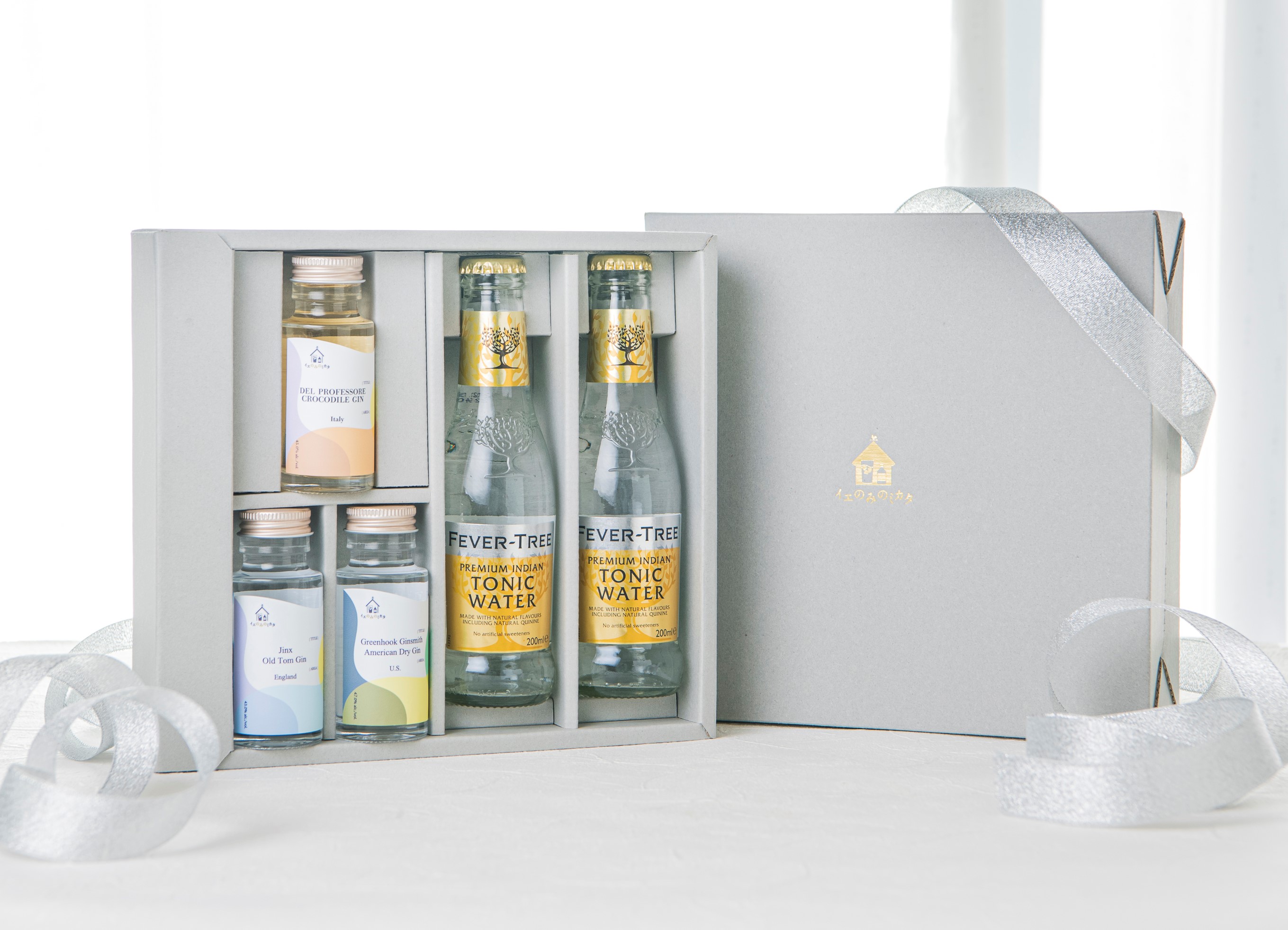 | パッケージ内同梱物 | ・クラフトジン小瓶3本 ・トニックウォーター2本 ・レシピカード3枚 ・説明資料2枚 |