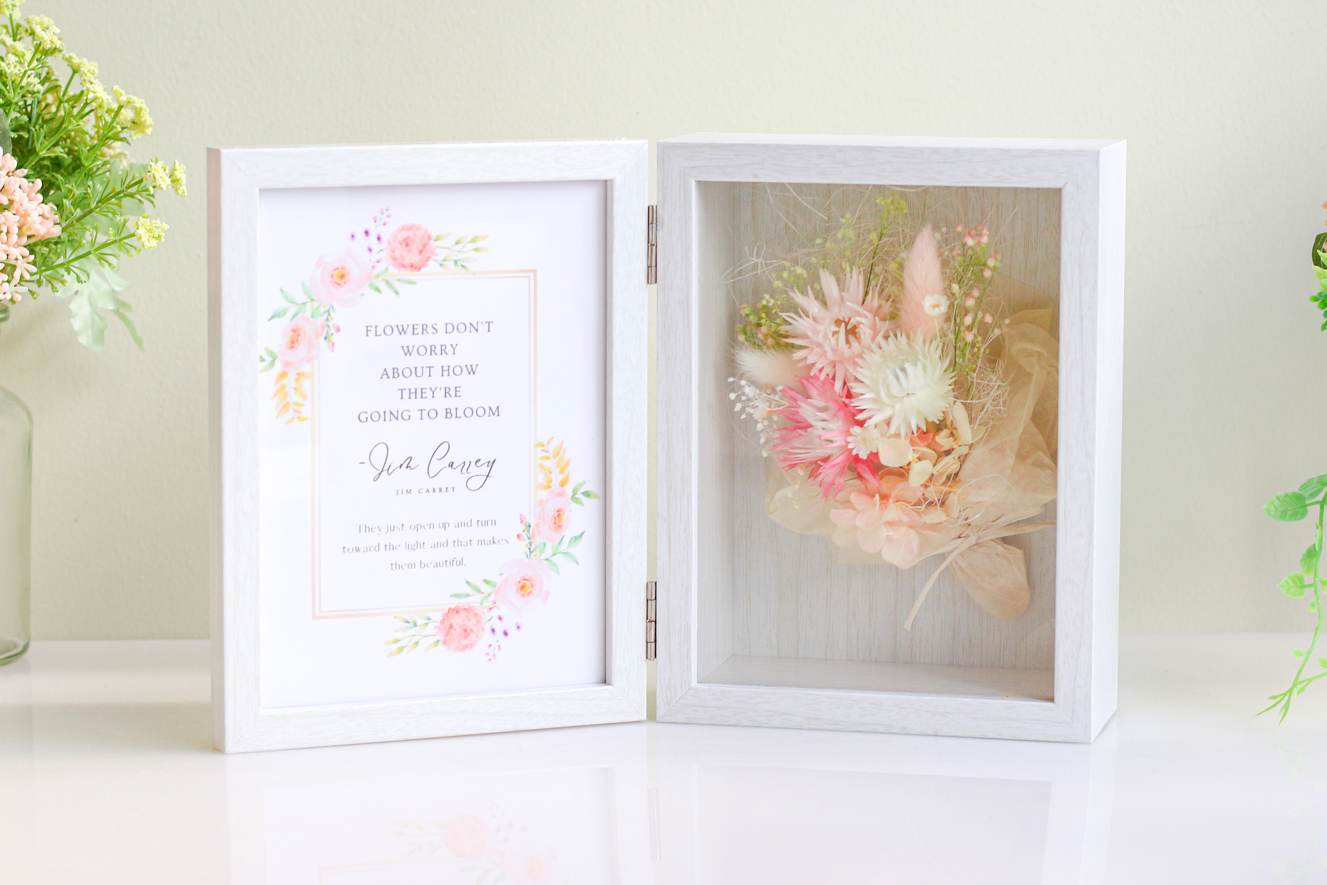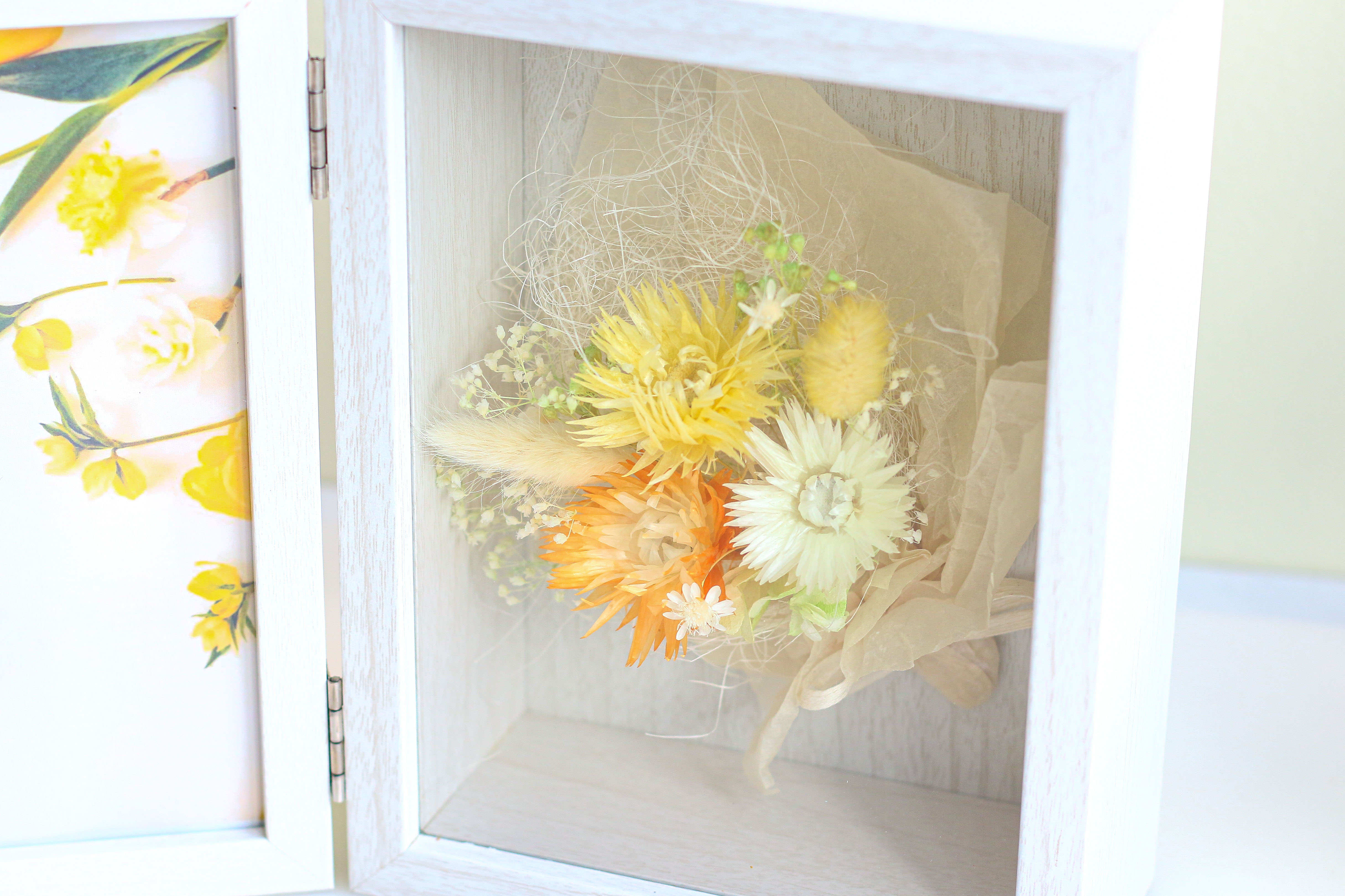 思い出の写真やペットやお子様の写真などを入れて自由にお楽しみいただけます。 写真は両面に入れることができるので、向きによって写真を変えて楽しむことも。 お花と一緒に飾れるので、棚やテーブルの上、玄関など、飾る場所が一気に華やかになります。フレームは閉じればコンパクトに収まり、シンプルな写真立てとしてもお使いいただけます。