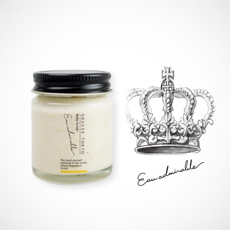 GRASSE TOKYOのボディスクラブ。トウモロコシ穂軸のスクラブ剤で肌を優しく磨けます。コメヌカロウで肌の表面に保護膜を作り潤いを保ち、アルガンオイルで老化防止をします。プレゼントにぴったりなお試しサイズ。3つの香りからお選びいただけます。