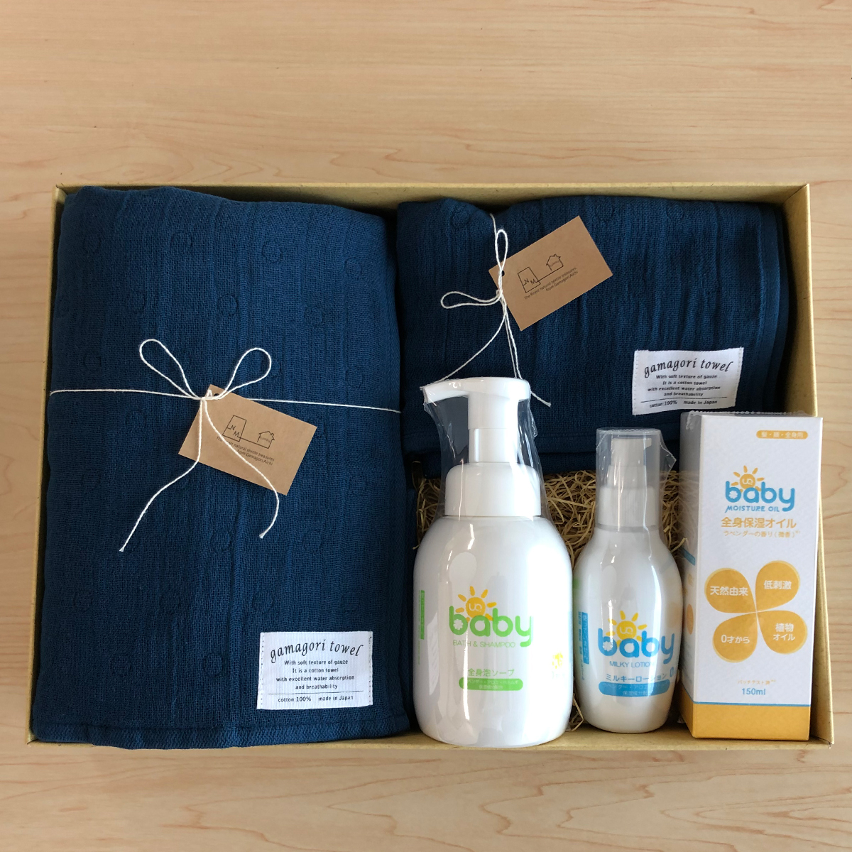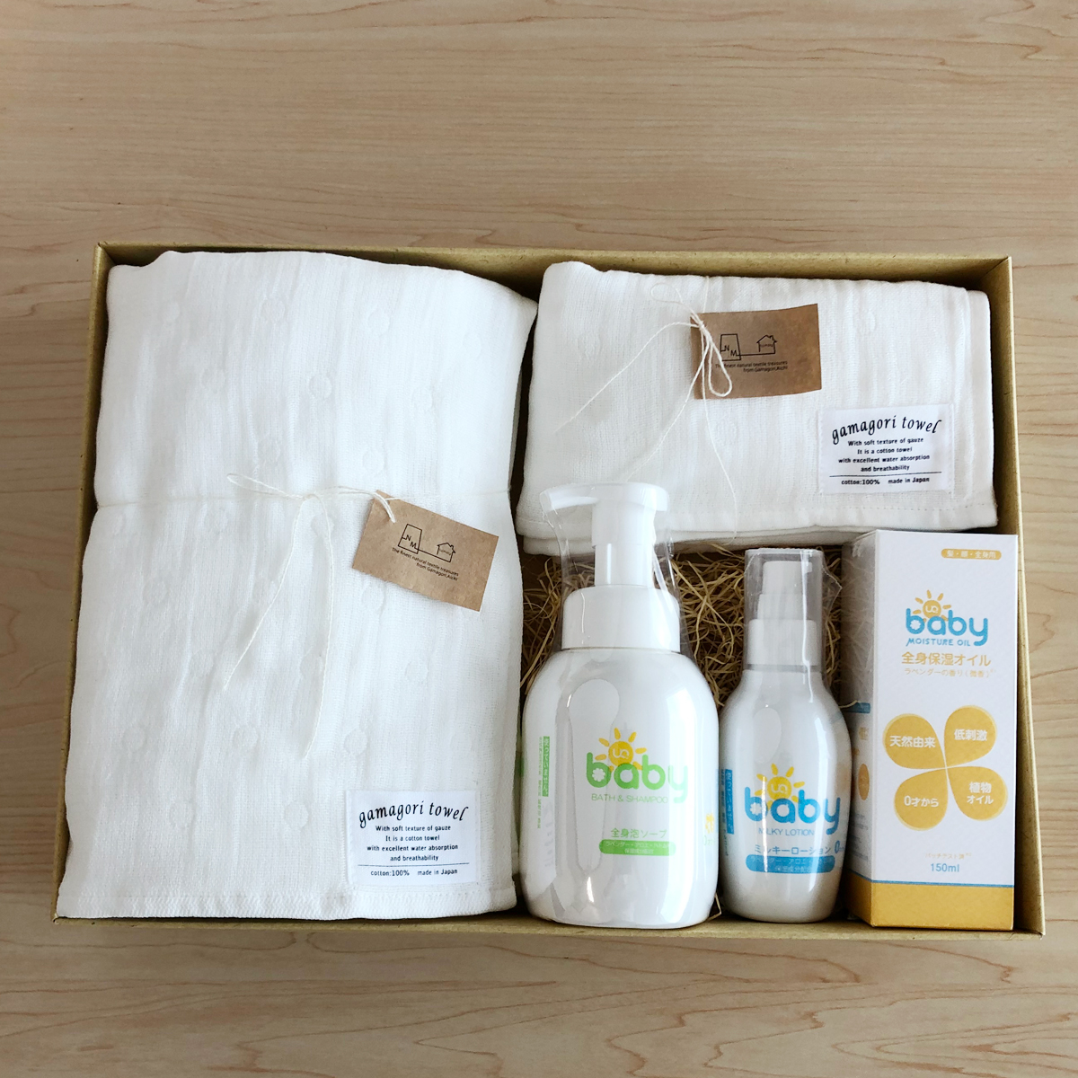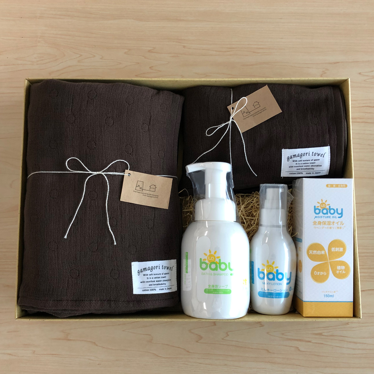 大口注文・法人のお問い合わせはこちら赤ちゃんの安全、ママの安心をコンセプトに、品質にこだわったすべて日本製のギフトセットです。タオルのカラーは、ホワイト・ブラウン・ネイビーの3色からお選びいただけます。