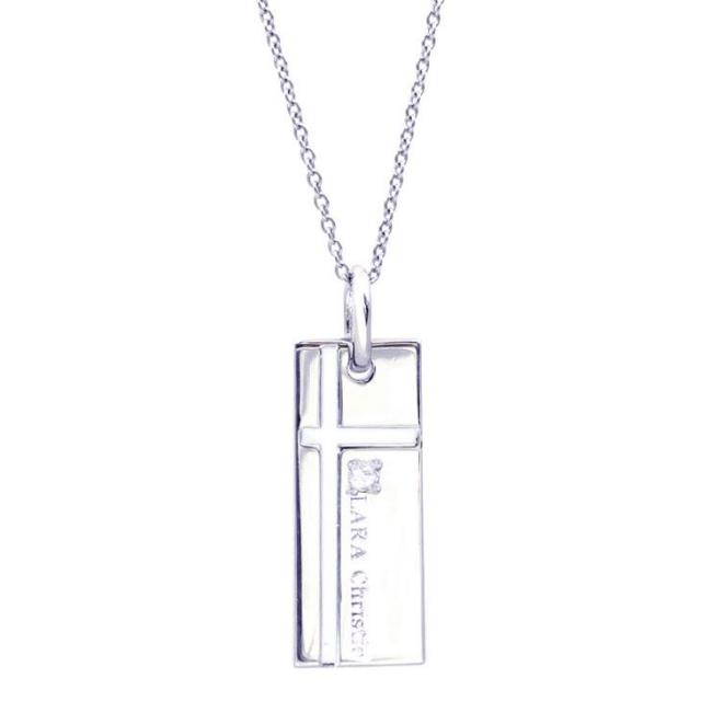 細長のシルバープレートに、LARA Christieのロゴ、キュービック、エナメルラインでクロスを入れたノーブルクロスペンダント。