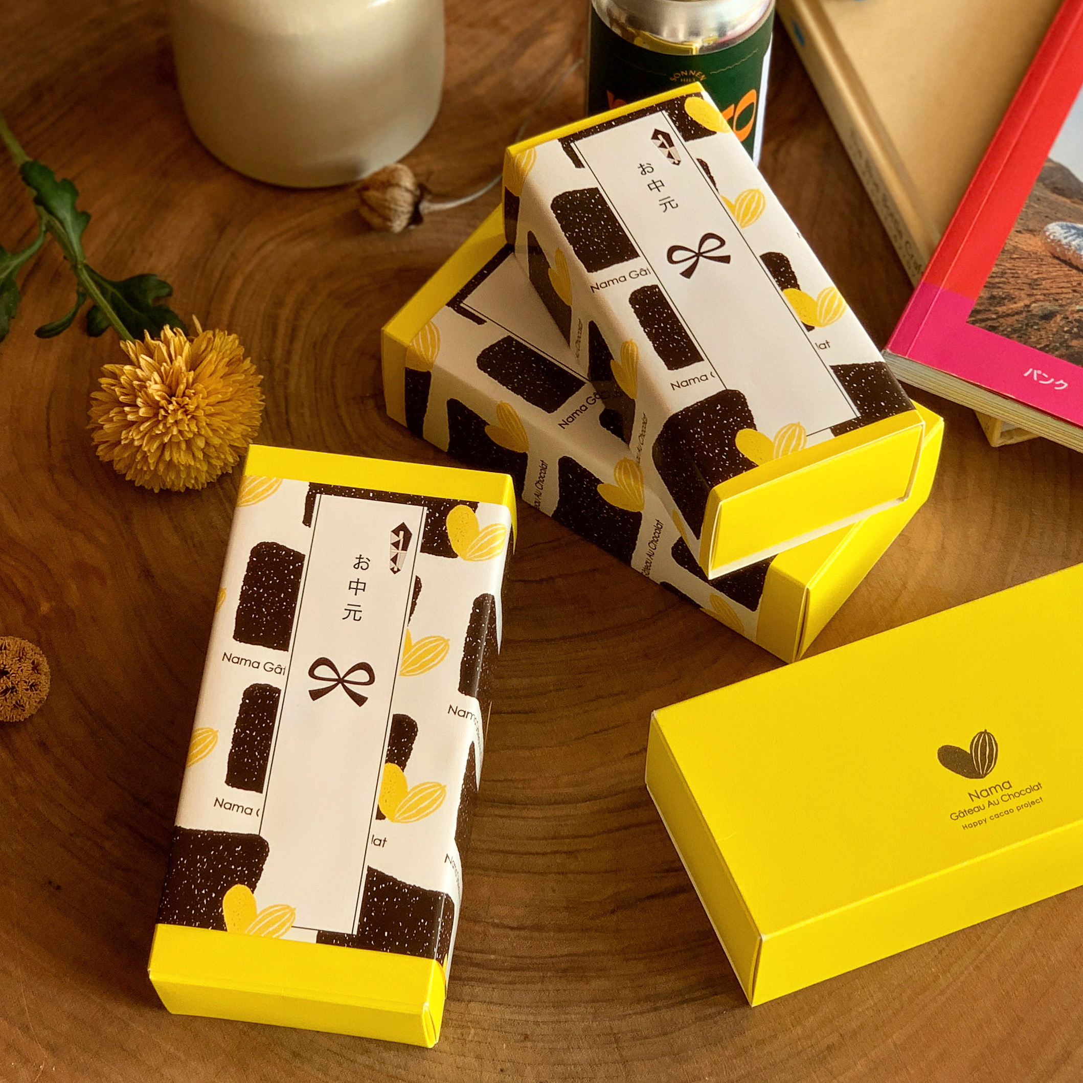 気持ちまで明るくなるような鮮やかなイエローからのボックスに入れてお届けします。さりげないブランドロゴがおしゃれですね。