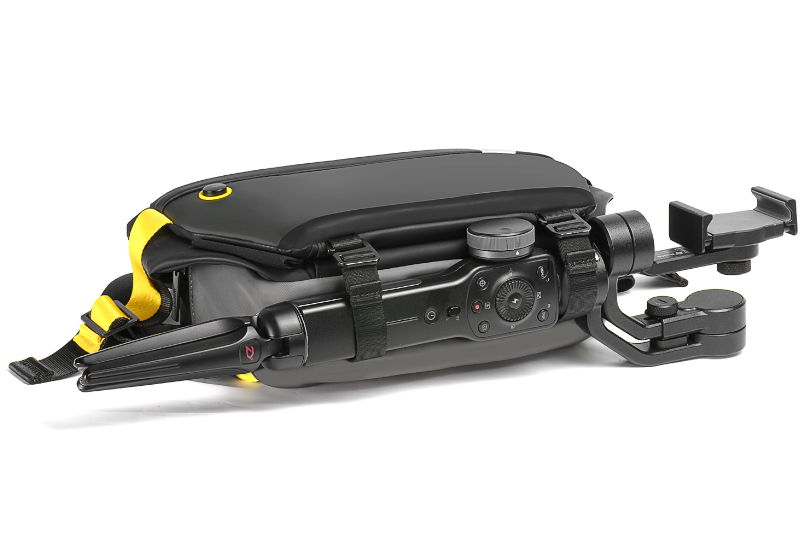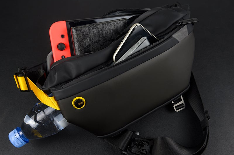 中央部は収納が大きめにとられており、財布やゲーム機なども収納可能です。内側にも小物を収納しやすい小型のポケットもあり、すぐに取り出したいリップやハンカチなどを保管できます。本体底のバンドル部分にはカメラ用三脚も固定可能です。